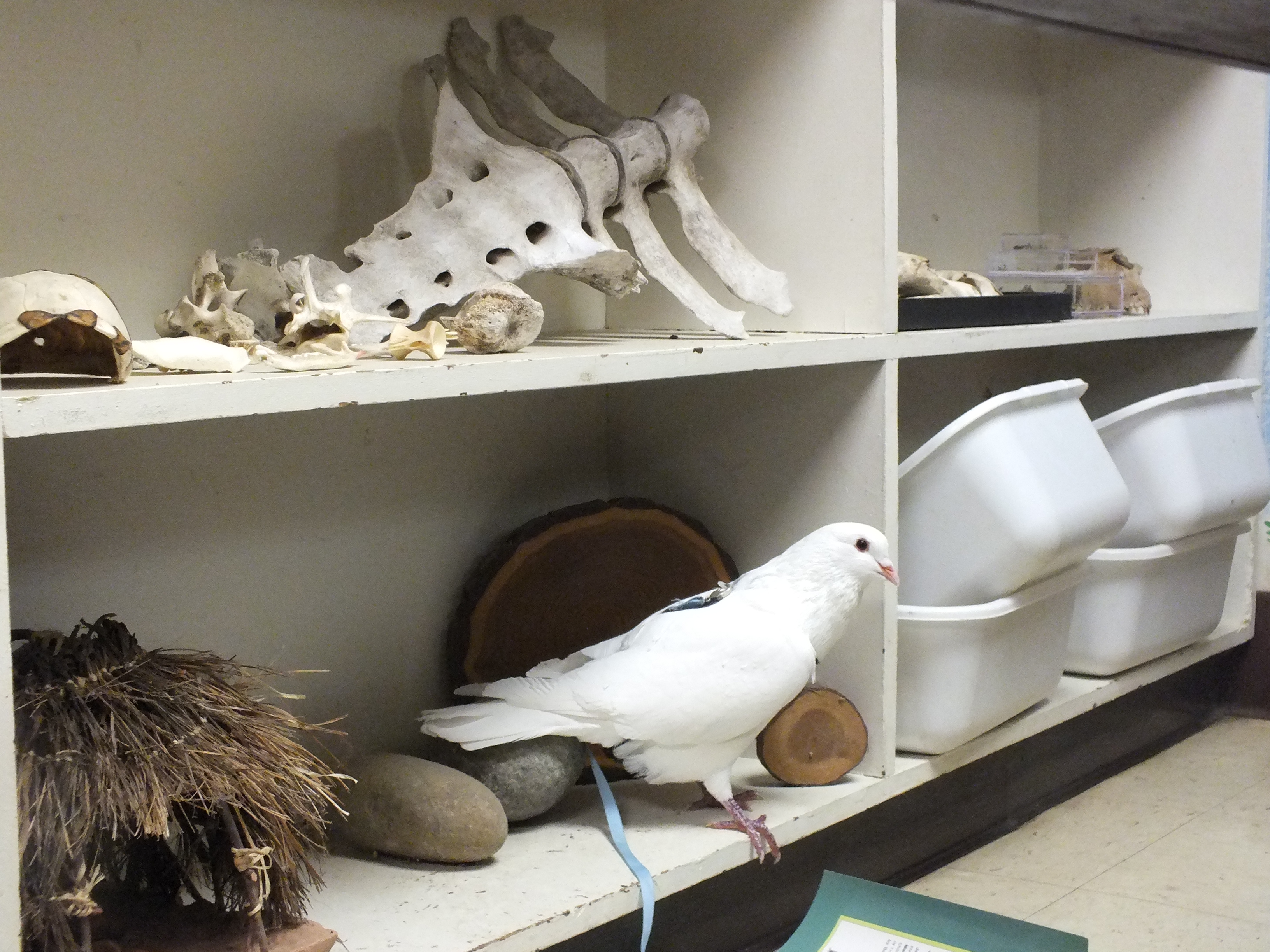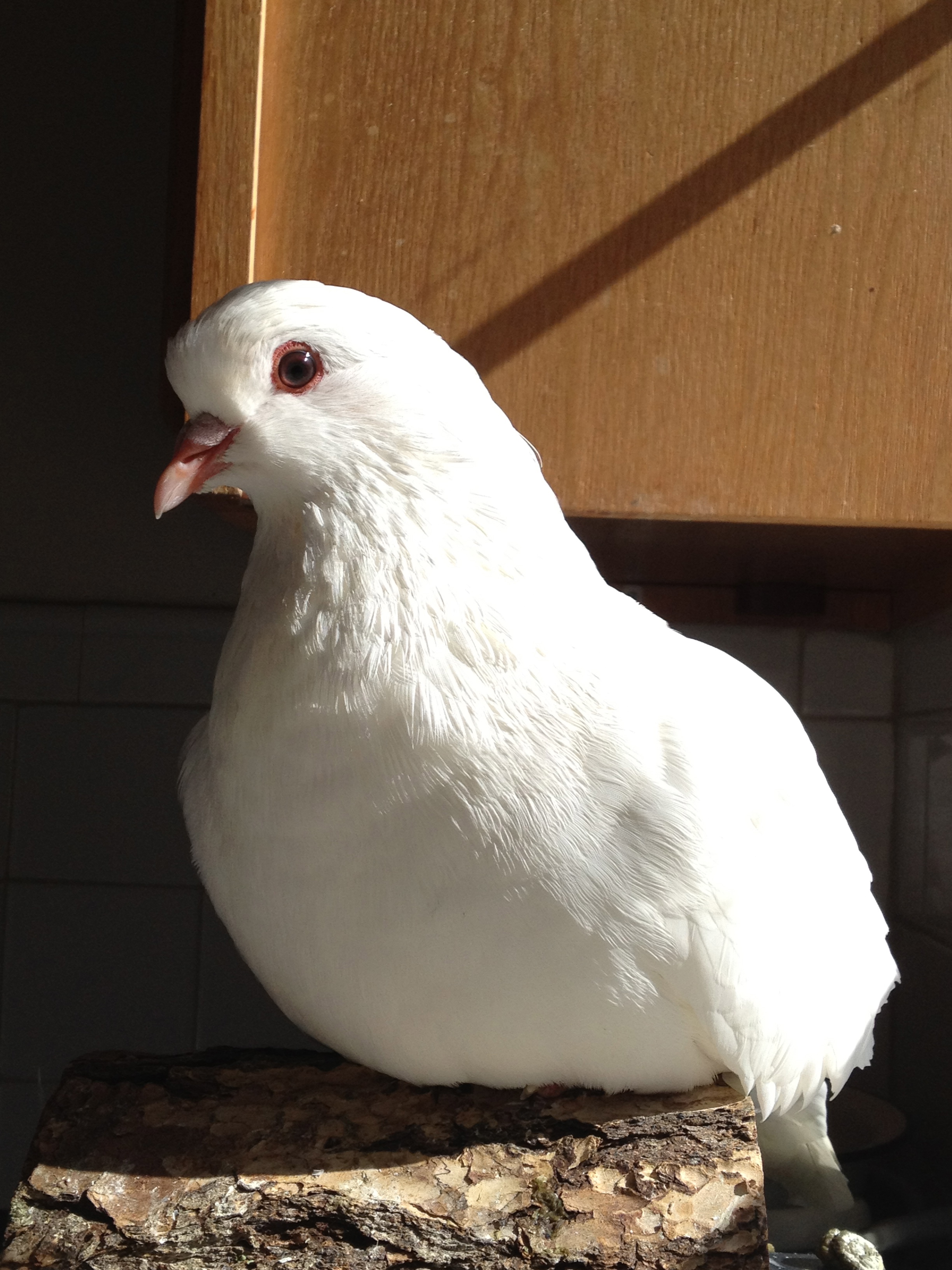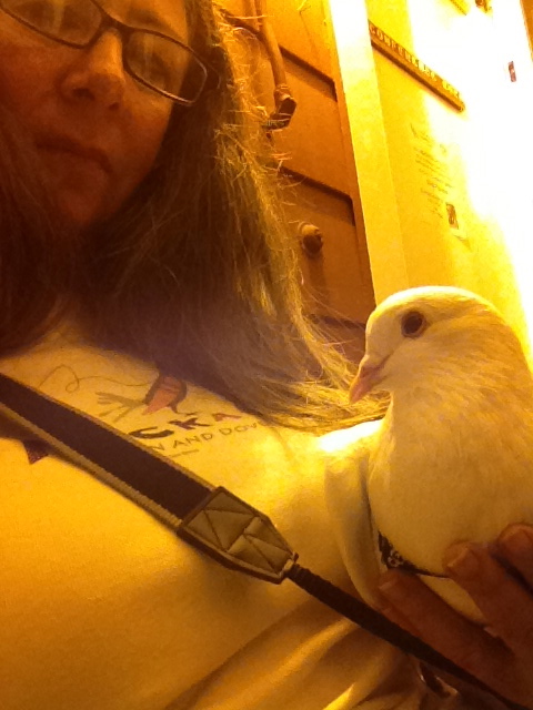 At first I thought Snow was a hen but now I’m pretty sure he’s a henry (cock). We think that he had been kept as someone’s pet and got lost or was “set free” (death sentence). He definitely is people-savvy, so much so that I put pants on him and take him to adoption fairs and outreach events as a Pigeon Ambassador.