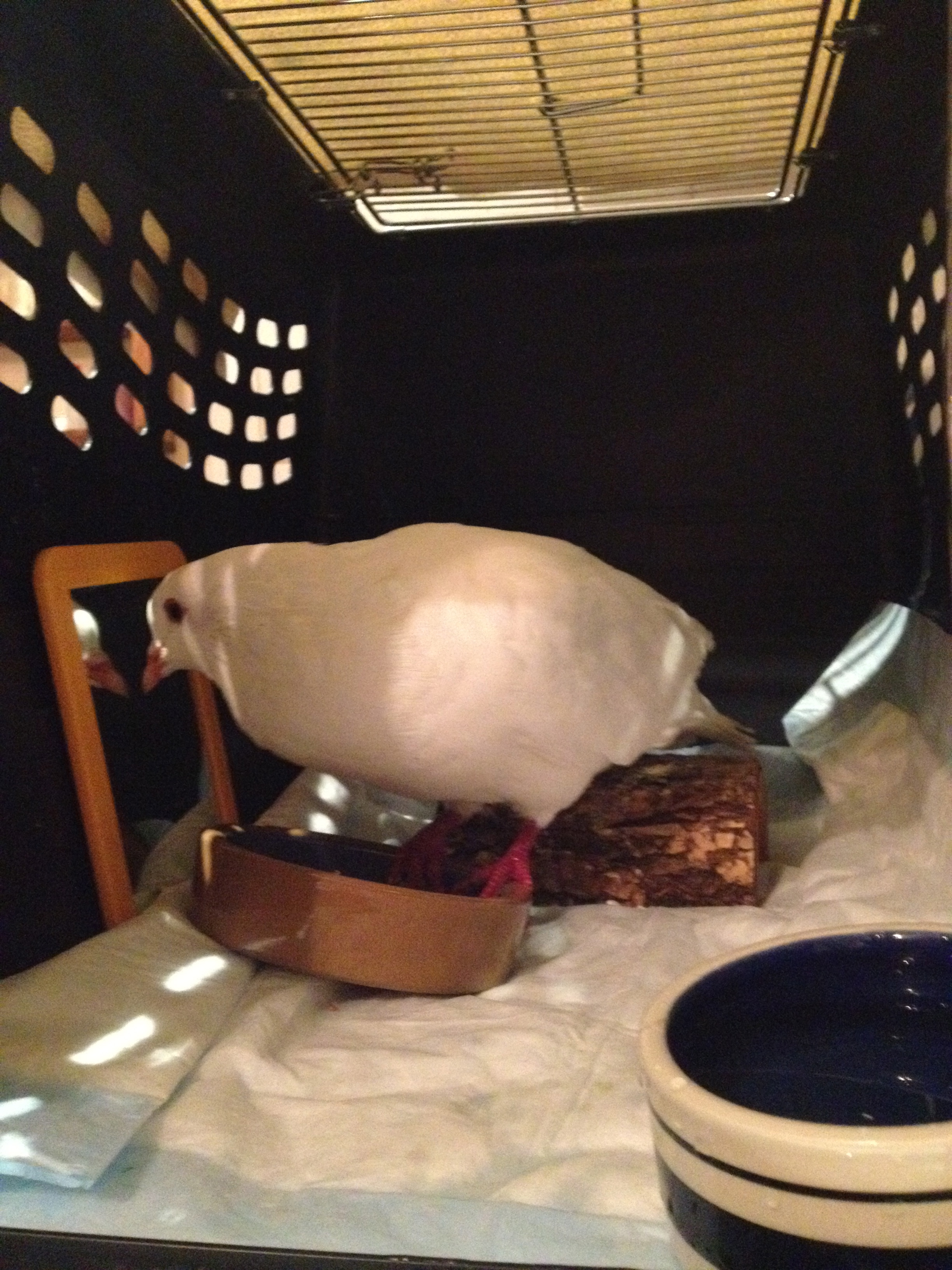Good morning. I got your email address from Jane and am contacting you because I rescued what I think may be a King Pigeon. I was wondering if you had room to take in one more bird? I do not have the knowledge or the facilities to nurse it back to health but when I saw it standing in the middle of the street and realized it couldn’t fly, I knew I had to try to save it. If you could assist me with this matter, that would be wonderful and if not, could you direct me to the most appropriate resource? Thank you and have a wonderful day, JamesI didn’t have room but the bird was injured and so I went to check on him. Snow, as his rescuer James named him, had been found at 10 PM standing in the street in the SF Tenderloin. Before James could get to him, he had been clipped by a passing car but escaped with only broken blood feathers. James would have loved to foster Snow in his small apartment but his highly active and prey-driven dog was frantic to get to the bird. Unable to think of another option, I brought Snow home with me.