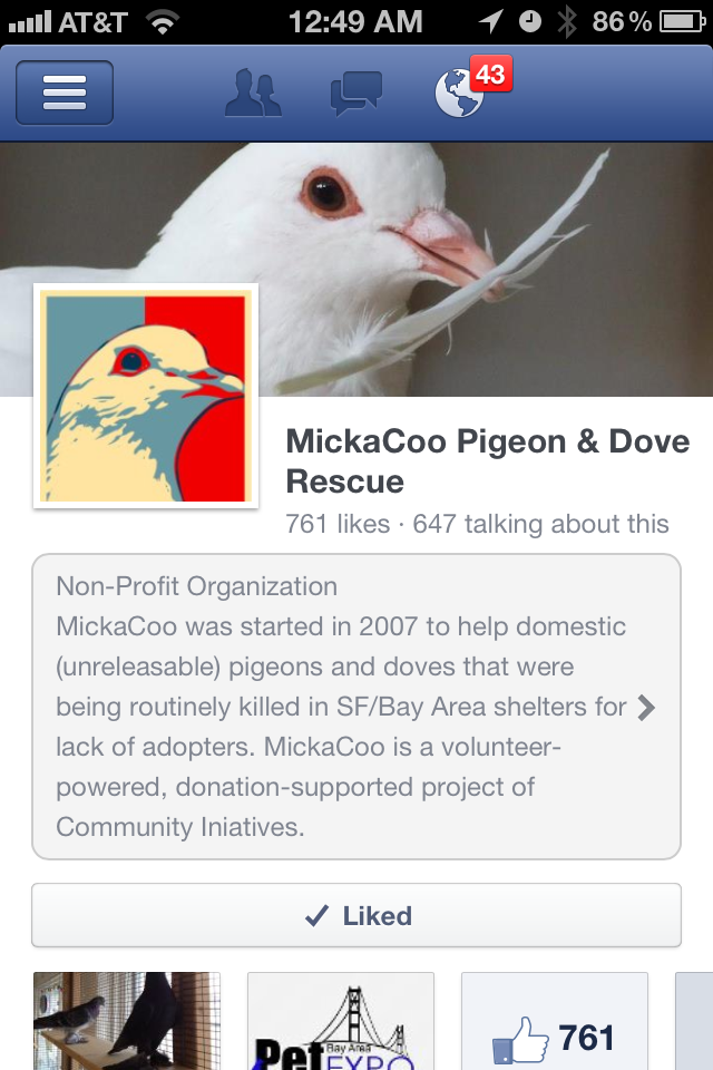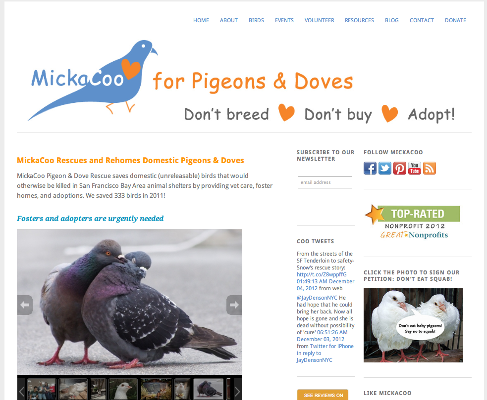 MickaCoo Pigeon & Dove Rescue had both a very challenging and very promising year. We are getting ever more support and leadership from volunteers and seeing more outreach and placement efforts from Bay Area shelters. In 2012, MickaCoo’s foster volunteers saved more than 200 lives by caring for and housing pigeons and doves when no one else would. We placed more than 100 birds with carefully screened adopters and counseled on behalf of the welfare of hundreds more.