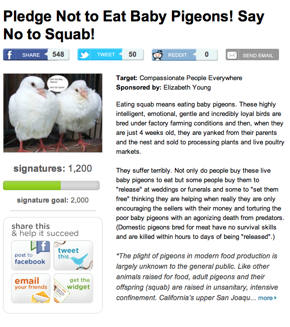 - MickaCoo’s Pledge Say No to Squab! 1200 sigs so far