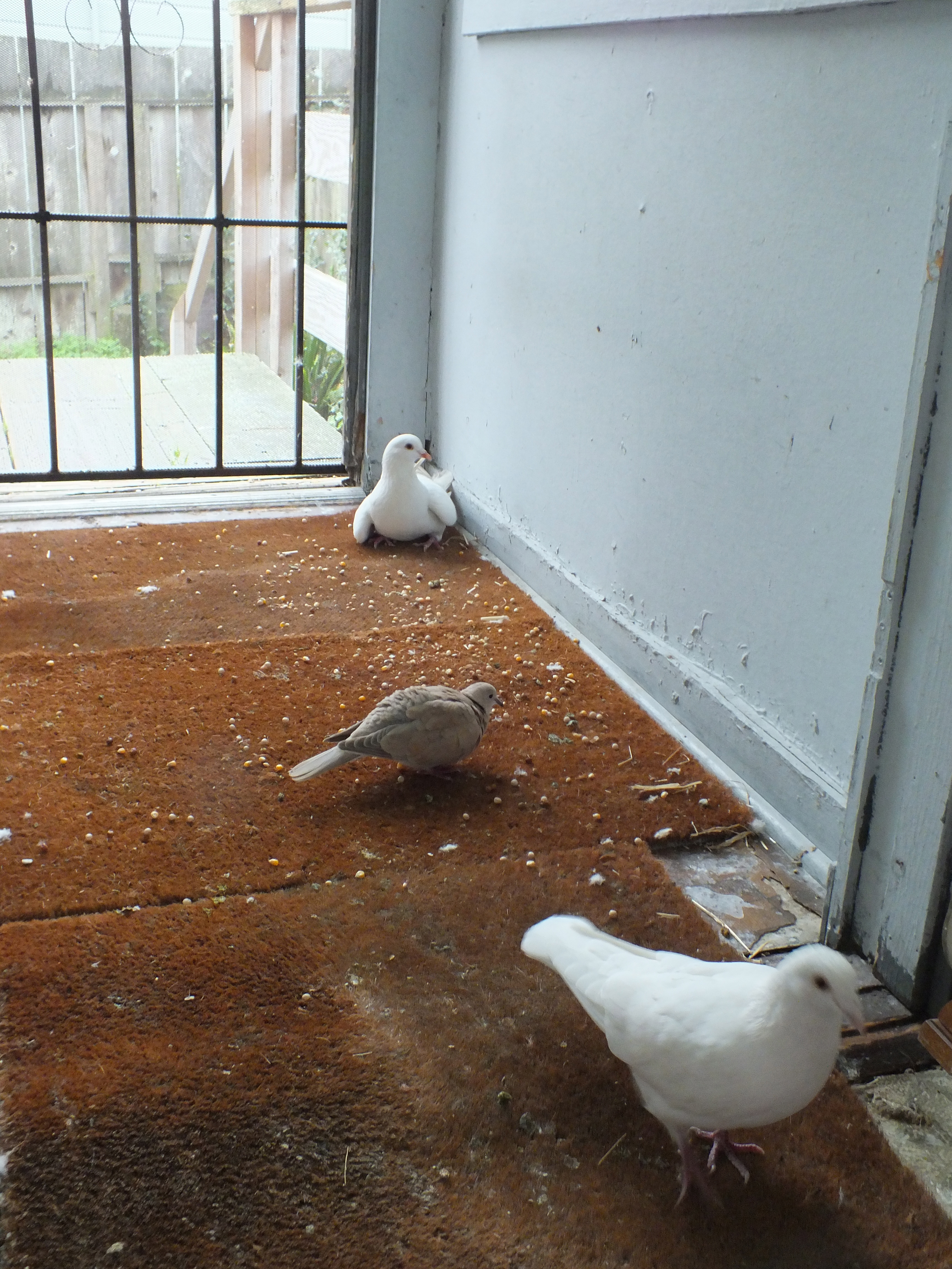 Tink’s story is filled with drama. As a king pigeon, she was bred to be killed at the age of four weeks and served as somebody’s squab dinner but instead, she and a few other baby king pigeons were purchased alive from the poultry market. Unfortunately, once purchased, they were most likely “released” at a ceremony (a cruel and deadly thing to do). Having no place to go (king pigeons are domestic and cannot survive in the wild), they hid behind some bushes. Once again, her incredible luck kicked in and she and three other baby kings were found and taken to the San Francisco animal shelter before dogs, cats, raccoons, hawks, cars and/or mean people got a hold of them. After a week at the shelter, their time was up and they were scheduled to be killed for lack of adopters but instead, MickaCoo took them into foster care. Their foster mom named the four babies after the Teletubbies- Dipsy, Tinkie Winkie, Lala and Poe. Three strengthened and grew but little Lala didn’t survive. When Tinkie Winkie and Dipsy had matured, they were transferred to our foster flock housed in the extra large Wulf Aviary. (Poe stayed at the Pacifica aviary and has been adopted by her foster mom.) On a visit to the Wulf aviary in November, I noticed that Tink was sitting a lot- more than normal. I caught (which wasn’t easy) and checked her over. She was strong, clean, a healthy weight and appeared to be thriving. When I checked with her foster mom, I was told that Tink had been a “sitter” for about as long as she could remember. On December 23rd though, Tink didn’t look so good and her foster mom alerted me. I picked her up the next morning and we went to Medical Center for Birds where she was examined by Dr. Speer. Tink appears to have a slowly progressing neurological problem (perhaps from an old spinal injury) that is interfering with signals between her spinal cord and legs. She’s doing very well fostered indoors in a less demanding environment and is feeling better and gaining back some lost weight. She’s a lovely bird who needs a special home. She is happy to be alive.