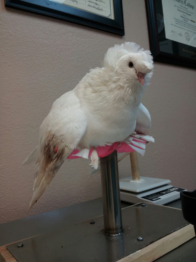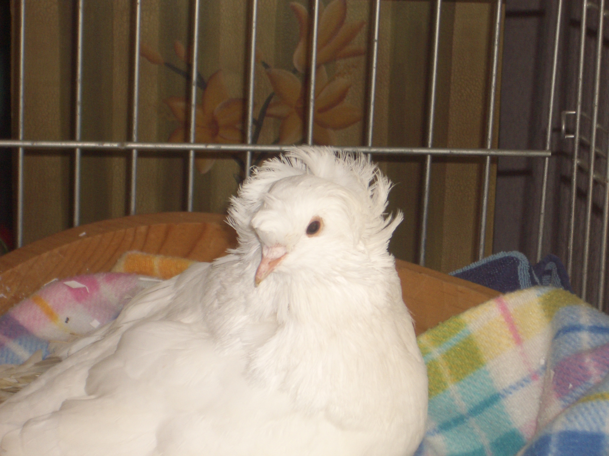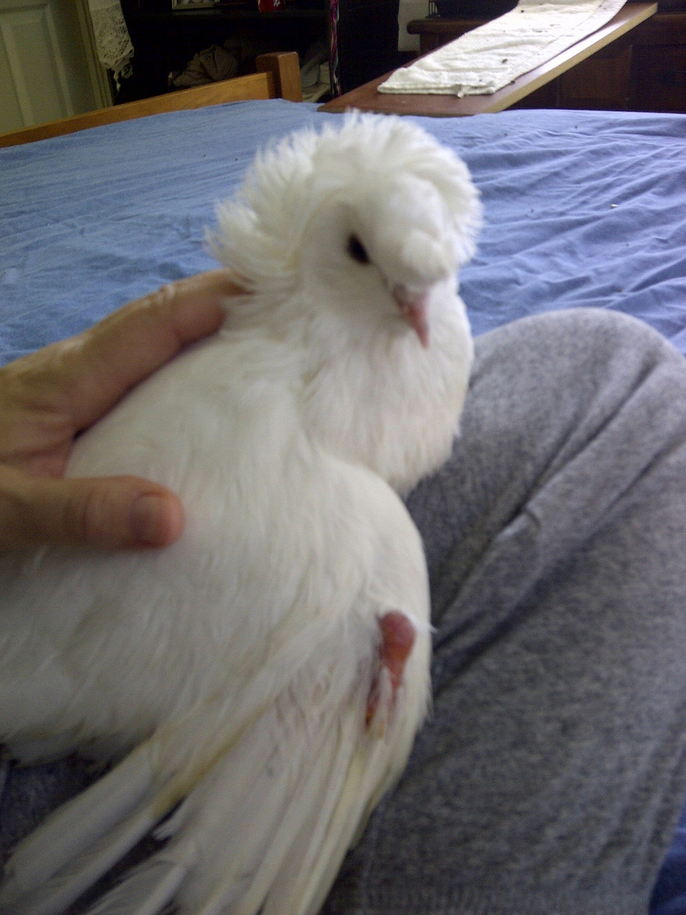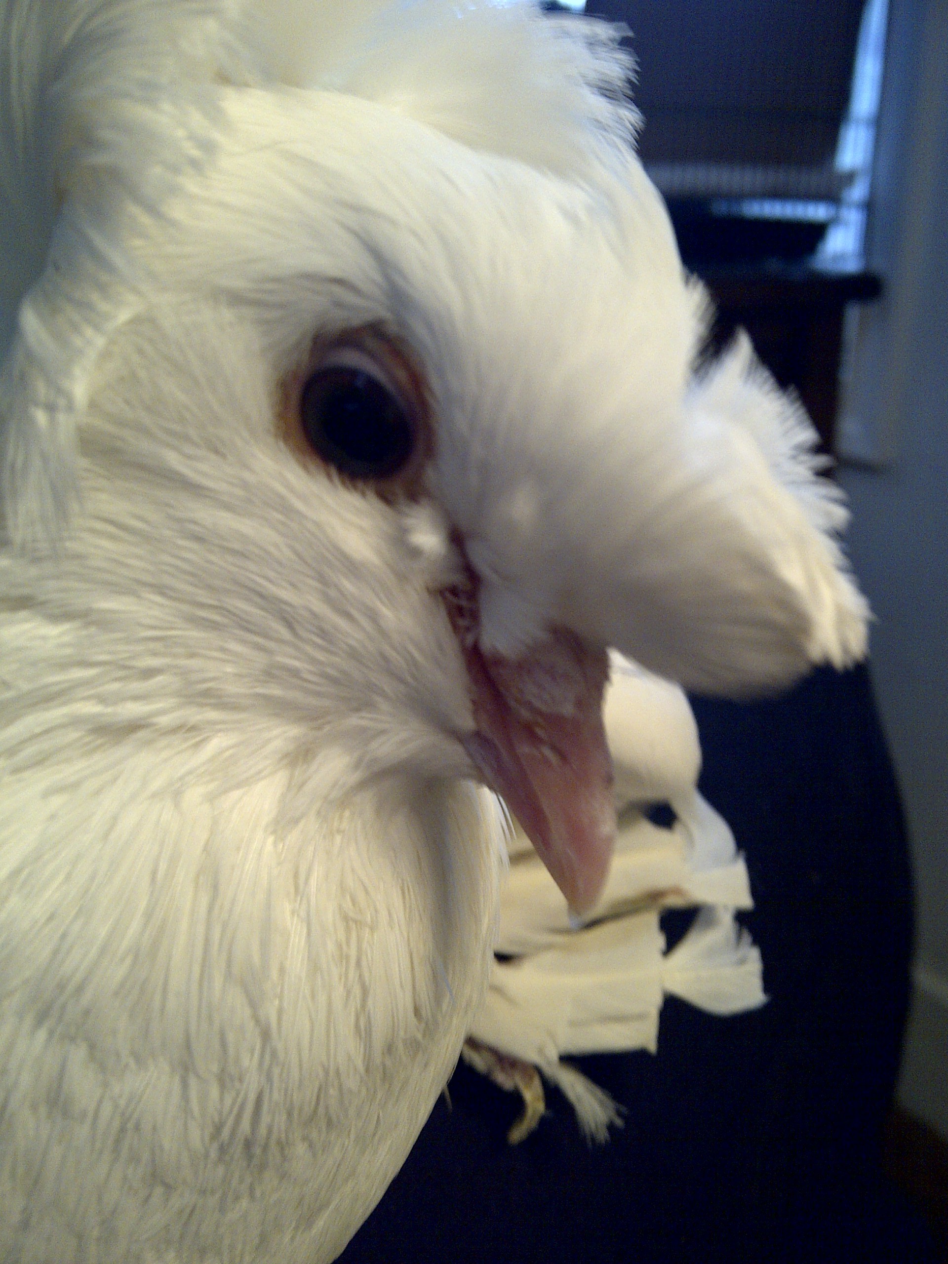 On August 31st, 2012, MickaCoo was asked to rescue a domestic pigeon from the shelter where he would otherwise be euthanized for lack of an adopter. A MickaCoo volunteer (whose dining table was already co-opted by a pair of foster pigeons) cleared off her coffee table to make room for him. She named him Chanel. Chanel is a fancy little domestic breed called a Trumpeter whose genetic heritage includes relentless selective (in)breeding. He has way more feathers than a pigeon is supposed to, including long, primary flight-size wing feathers growing painfully out of his poor little tender feet as well as the crest around his head that, while cute, restricts his peripheral vision. Of course, inbreeding has other costs as well and fancy pigeons like Chanel are prone to all kinds of troubles that hardy feral pigeons have beat (by way of natural selection). People changed Chanel’s destiny from being one of the most successful birds in the world to being a frail and helpless one. And, without a home, Chanel was doomed. But Chanel got lucky and was rescued by MickaCoo.