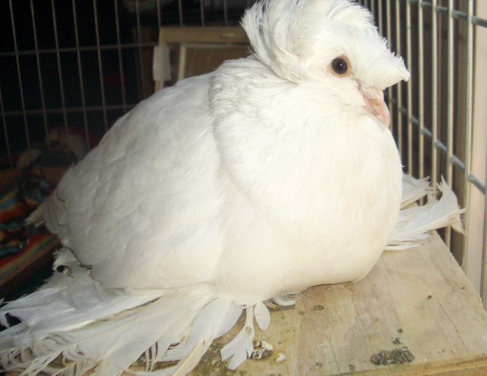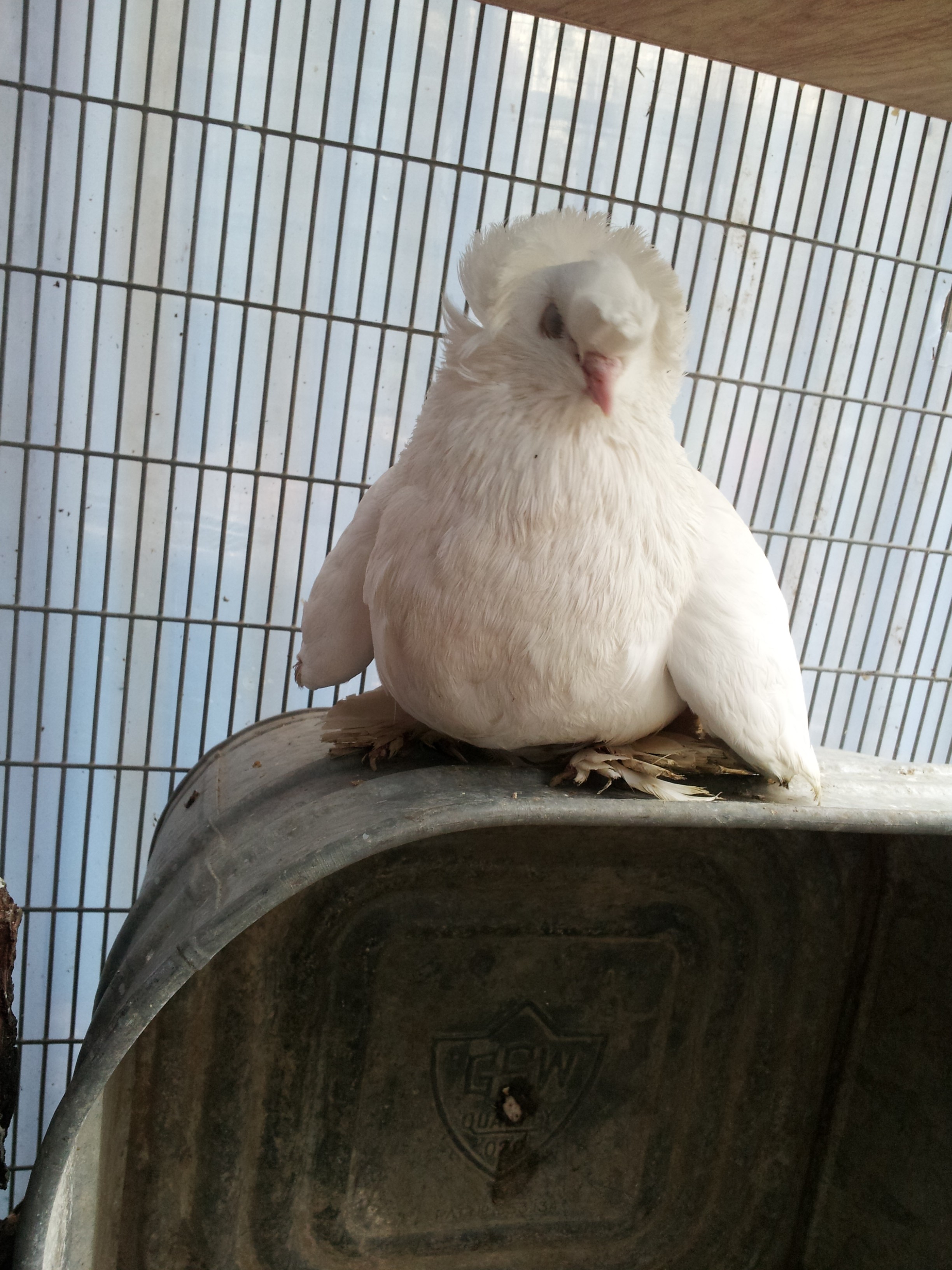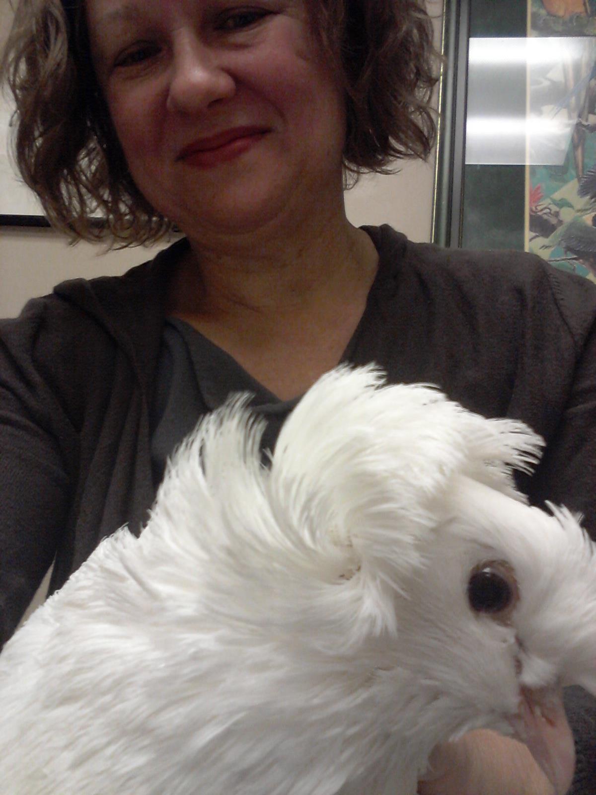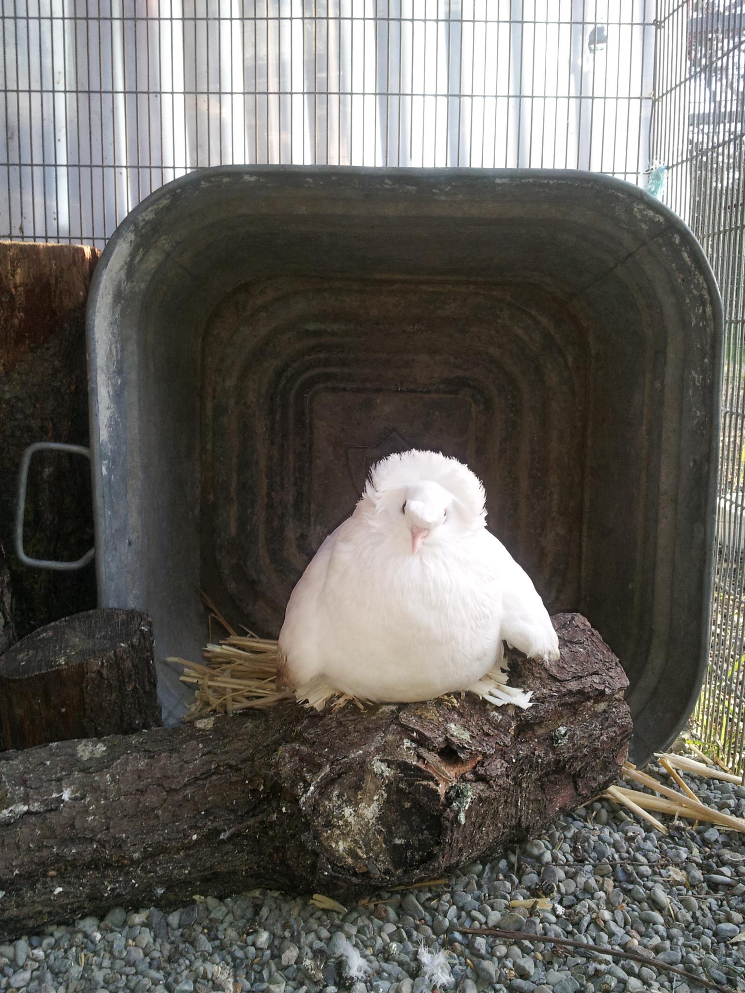 On August 31st, 2012, MickaCoo was asked to rescue a domestic pigeon from the shelter where he would otherwise be euthanized for lack of an adopter. A MickaCoo volunteer (whose dining table was already co-opted by a pair of foster pigeons) cleared off her coffee table to make room for him. She named him Chanel. Chanel is a fancy little domestic breed called a Trumpeter whose genetic heritage includes relentless selective (in)breeding. He has way more feathers than a pigeon is supposed to, including long, primary flight-size wing feathers growing painfully out of his poor little tender feet as well as the crest around his head that, while cute, restricts his peripheral vision. Of course, inbreeding has other costs as well and fancy pigeons like Chanel are prone to all kinds of troubles that hardy feral pigeons have beat (by way of natural selection). People changed Chanel’s destiny from being one of the most successful birds in the world to being a frail and helpless one. And, without a home, Chanel was doomed. But Chanel got lucky and was rescued by MickaCoo.