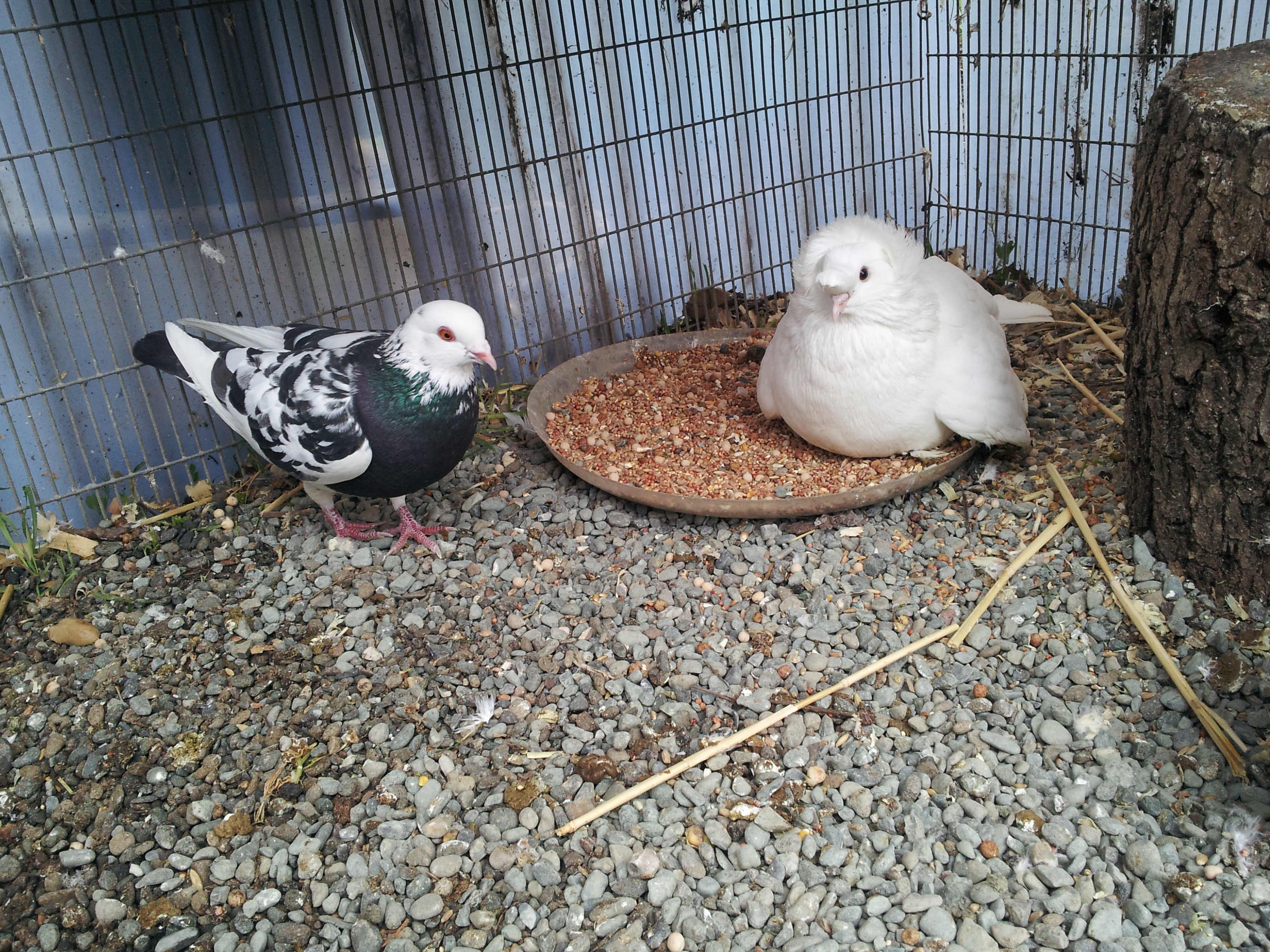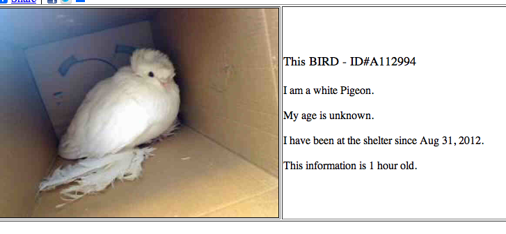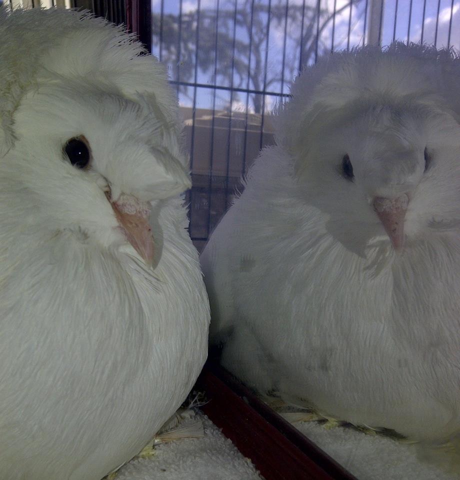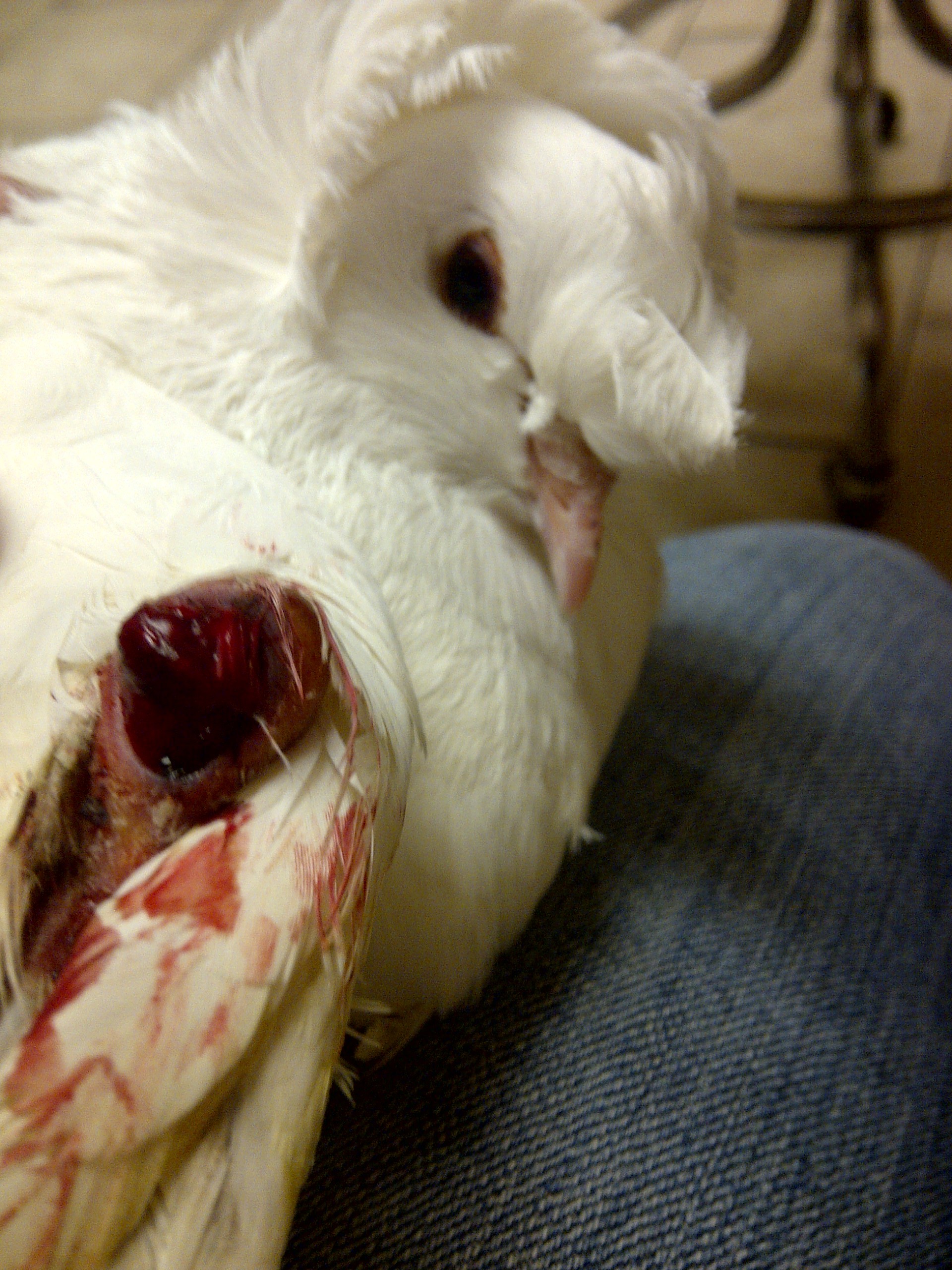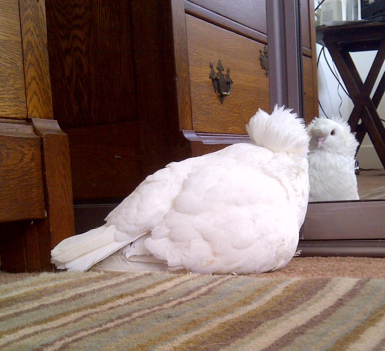 On August 31st, 2012, MickaCoo was asked to rescue a domestic pigeon from the shelter where he would otherwise be euthanized for lack of an adopter. A MickaCoo volunteer (whose dining table was already co-opted by a pair of foster pigeons) cleared off her coffee table to make room for him. She named him Chanel. Chanel is a fancy little domestic breed called a Trumpeter whose genetic heritage includes relentless selective (in)breeding. He has way more feathers than a pigeon is supposed to, including long, primary flight-size wing feathers growing painfully out of his poor little tender feet as well as the crest around his head that, while cute, restricts his peripheral vision. Of course, inbreeding has other costs as well and fancy pigeons like Chanel are prone to all kinds of troubles that hardy feral pigeons have beat (by way of natural selection). People changed Chanel’s destiny from being one of the most successful birds in the world to being a frail and helpless one. And, without a home, Chanel was doomed. But Chanel got lucky and was rescued by MickaCoo.