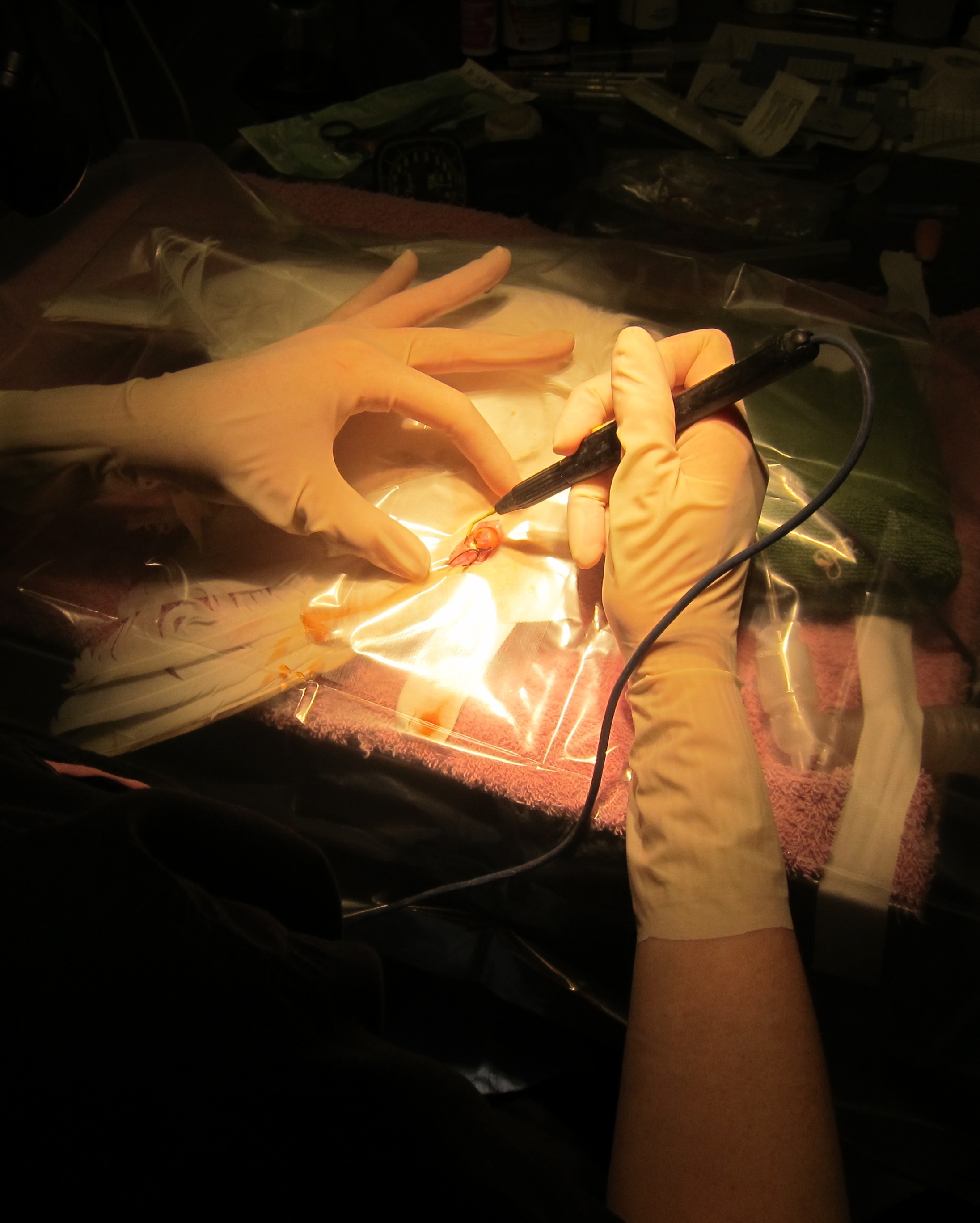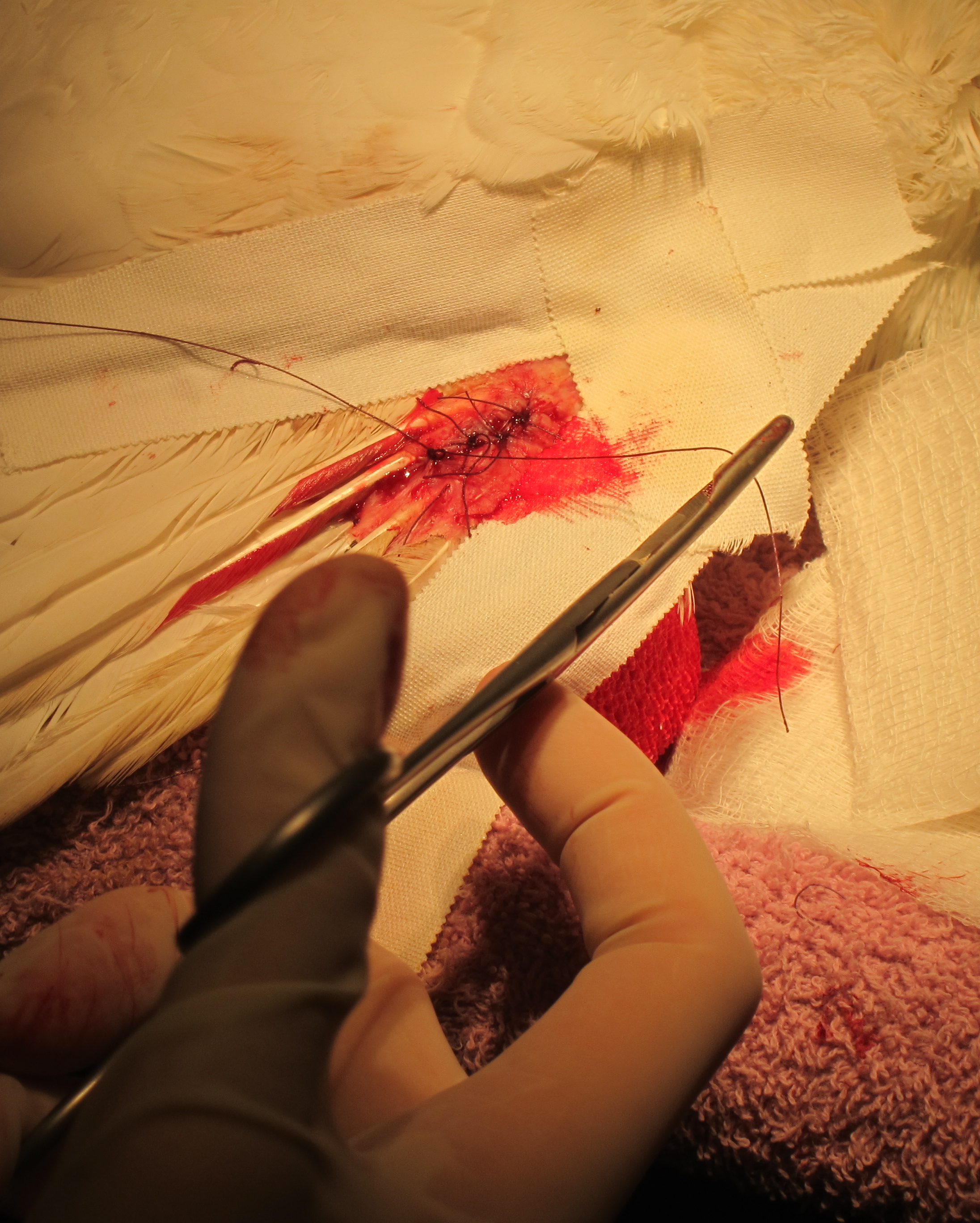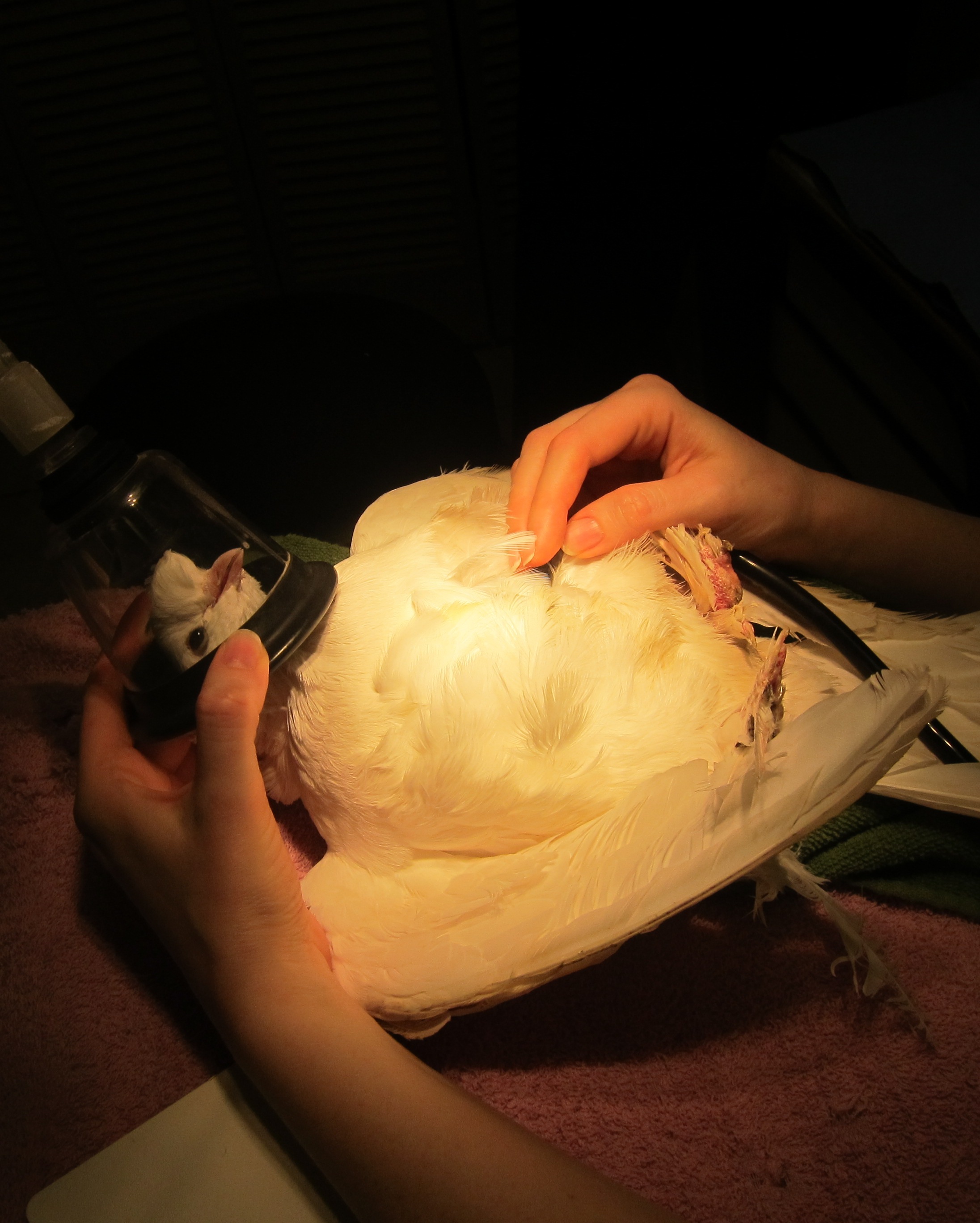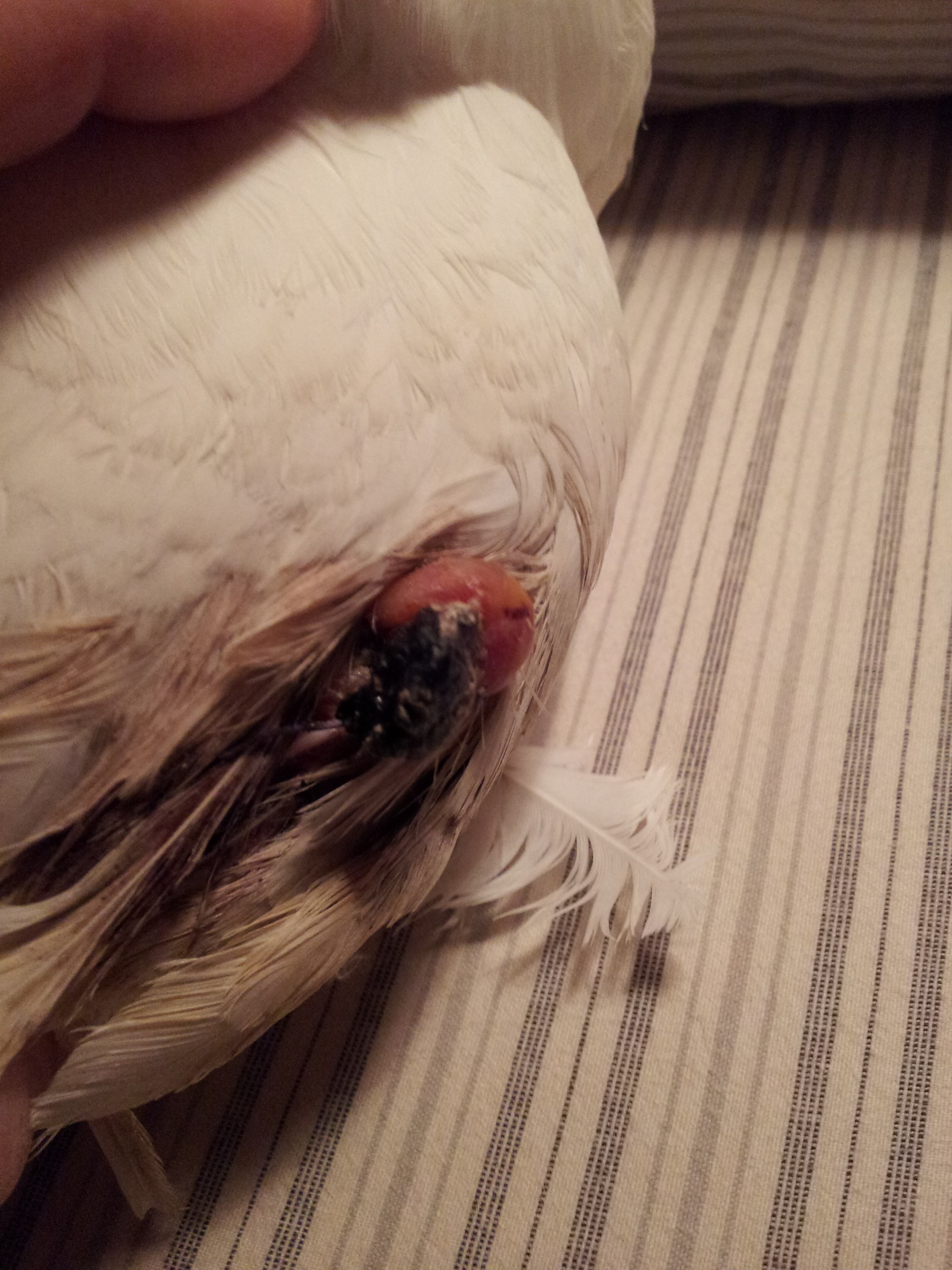 Once in our care, it became clear that little Chanel was under the weather. His long feet feathers restricted his mobility and so they were trimmed. When a space became available, he was transferred to the special gentle-birds-only aviary of another foster volunteer. He’s done OK but kept to himself and sulked more than thrived. Recently we learned that hidden under Chanel’s many feathers was a fast-growing mass. His vet, Dr. Fitzgerald, tried to save he and MickaCoo the impacts of surgery by devitalizing the mass via ligature (tying off) and that worked for a portion of it but eventually, surgery was required and, on 1/28/13, was performed.