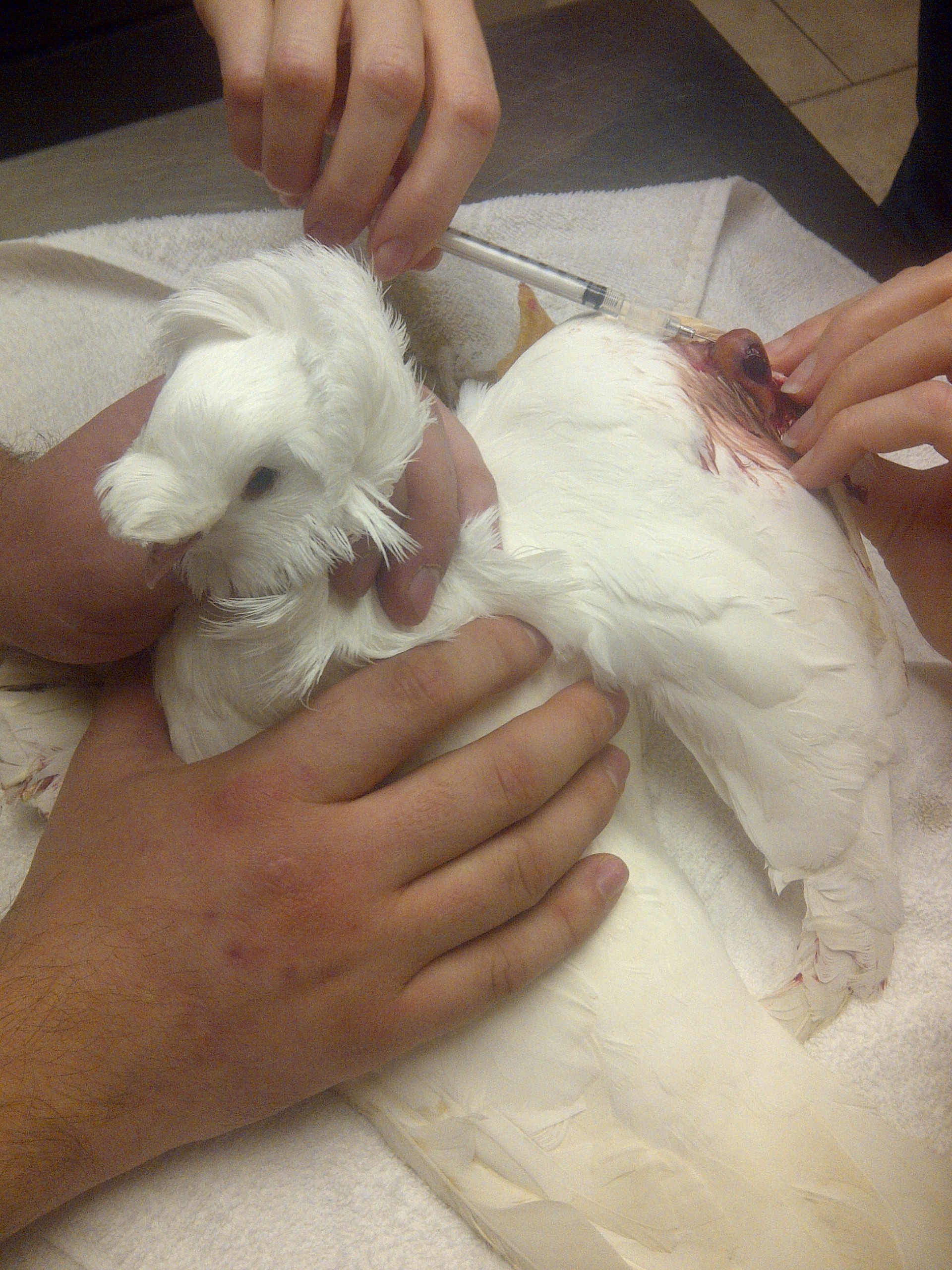 2/11/13 Update from Chanel’s foster mom Jill: Chanel continues to improve after surgery and loves being back in the aviary with his friends. He has even surprised me by flying a short distance! I had never seen him take wing prior to surgery. I think he’s feeling much better now that he can act more like a pigeon in a flock with his friends. He will always need to have his feet feathers trimmed but other than that he’s a happy-go-lucky guy who just needs a wife and a home to call his own.