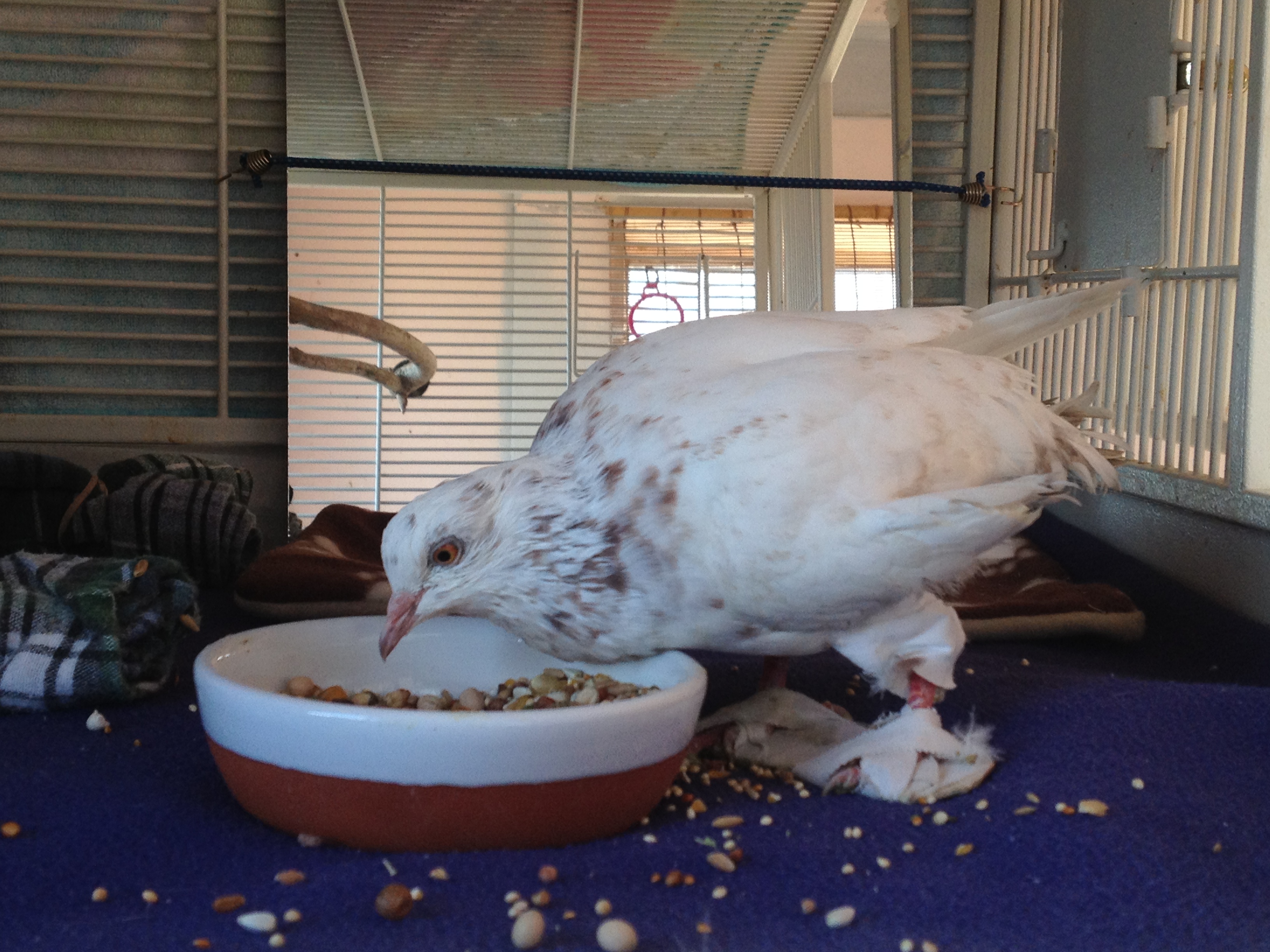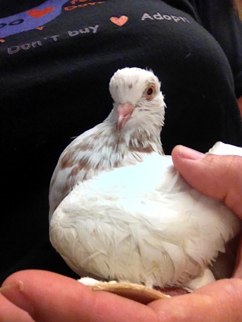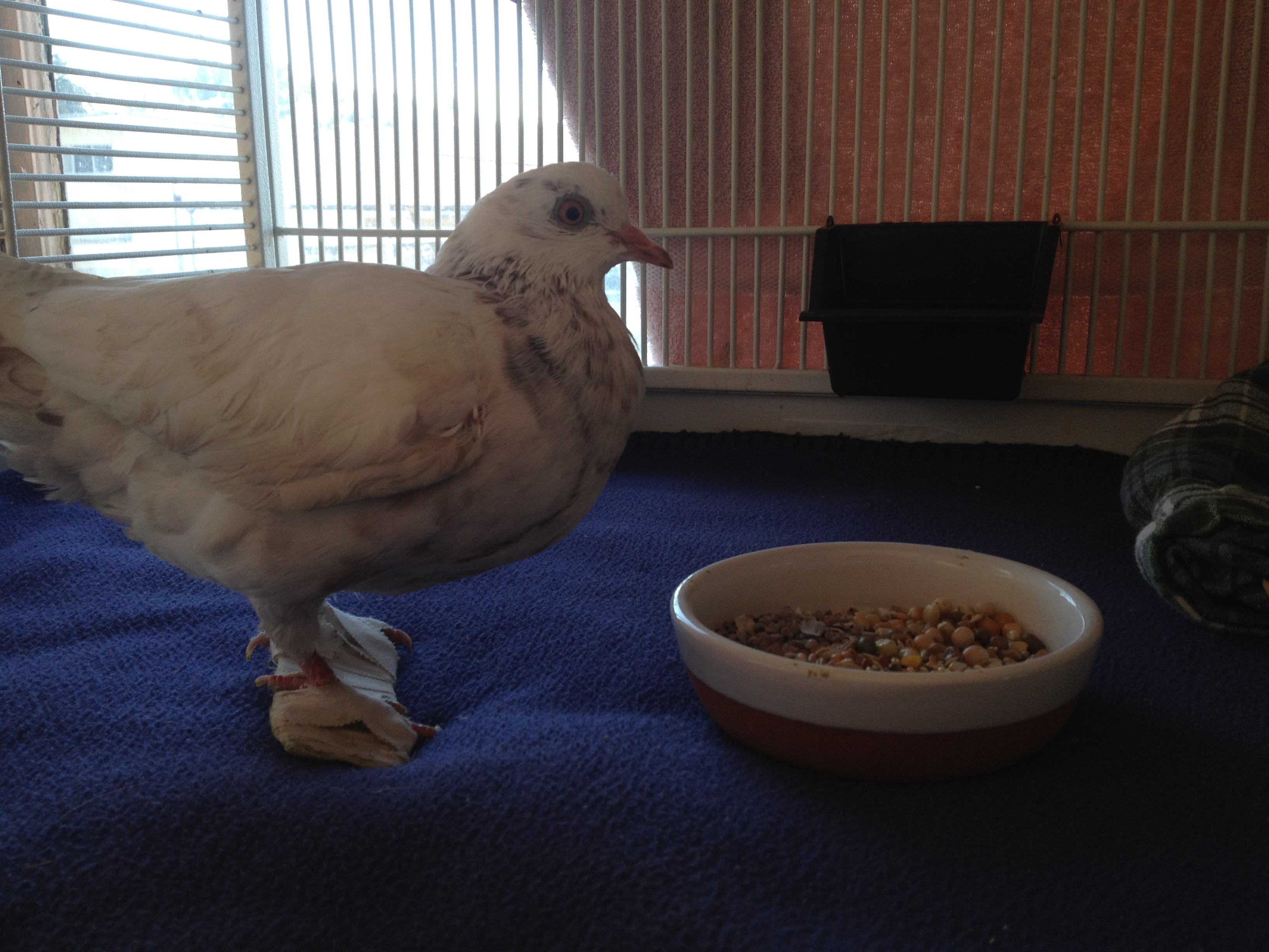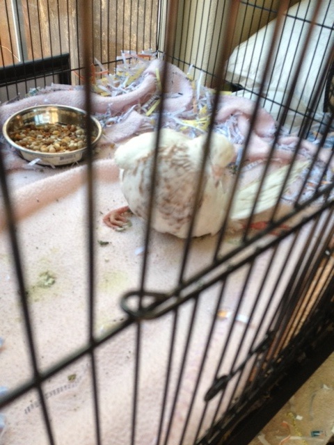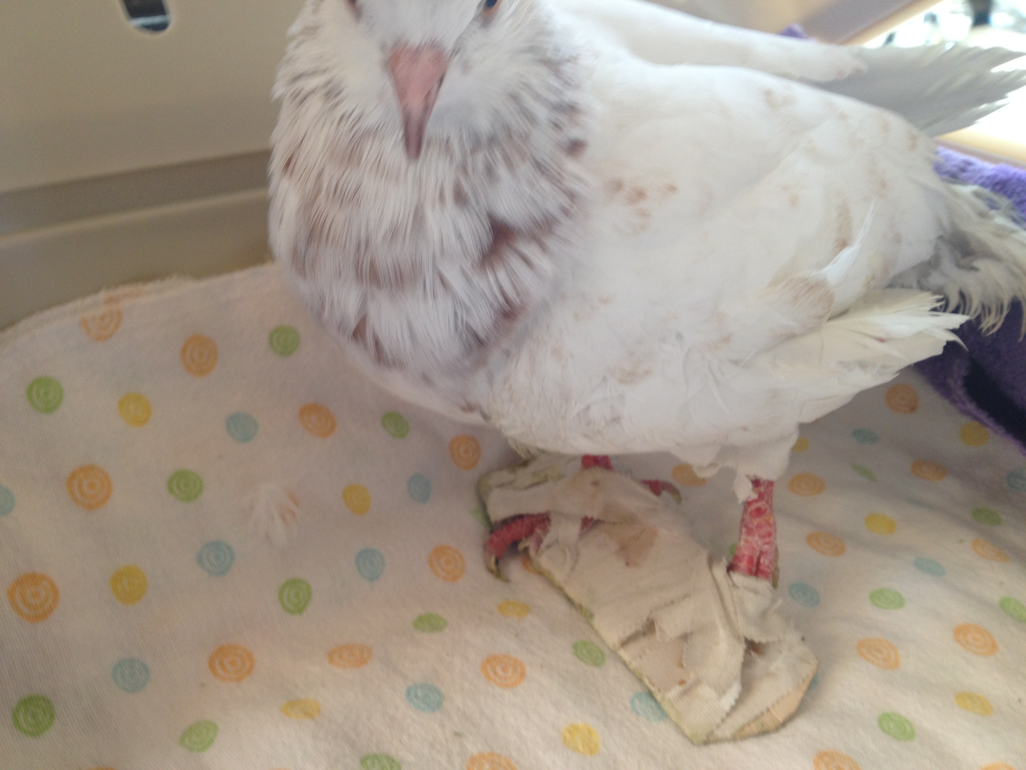 On September 26th, I received this Email: “Hello, My name is Dr. VanGilder and I have a patient named “Angel” presented to me at Four Seasons Animal Hospital who is in need of your help. She is a wonderful, bright, spunky bird who has an angular limb deformity of the left leg, limiting her mobility. Her owner loves her very much but doesn’t feel that she can provide the care she deserves. We are left with the choice between humane euthanasia and rehoming. I am hopeful that you can help us find a fostering/adoption situation that will give this pigeon a second lease on life.” MickaCoo is struggling to stay aloft with never enough funding and always more birds than capacity to help them and so taking responsibility for Angel was not the easy choice it should have been. She couldn’t stand, walk or fly and would need expensive corrective surgery and lots of supportive care if she was to have any chance for a full life. Here’s her story. Please make a donation towards her care if you can. (Click on the first photo to see the images full size.)