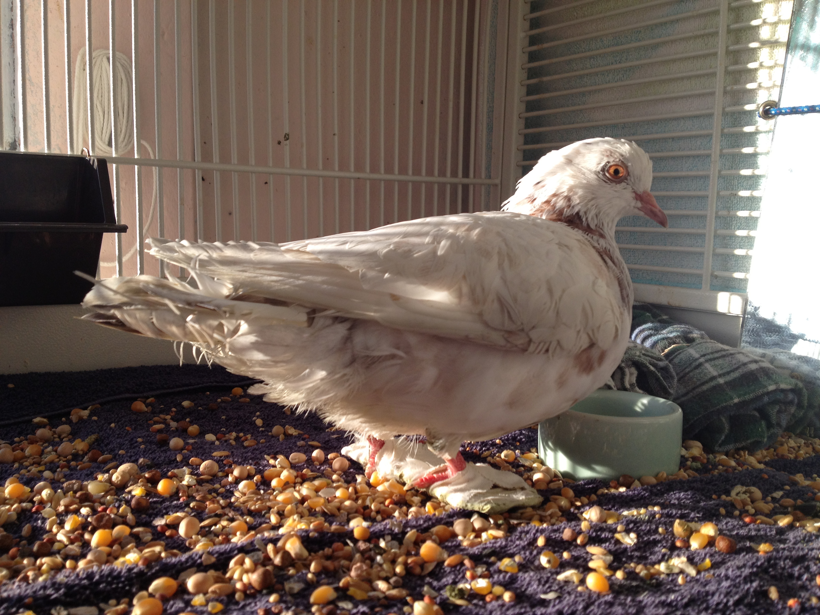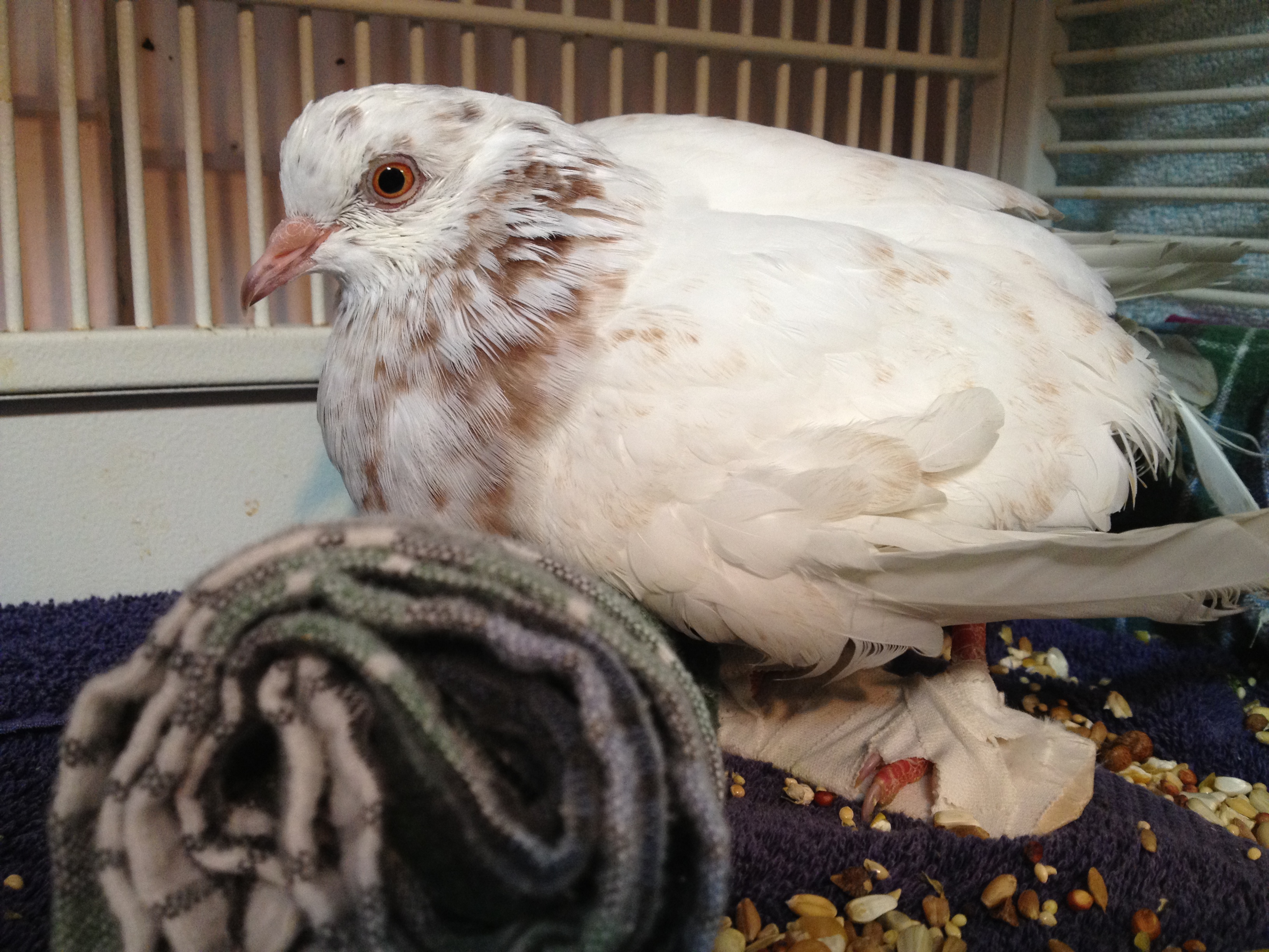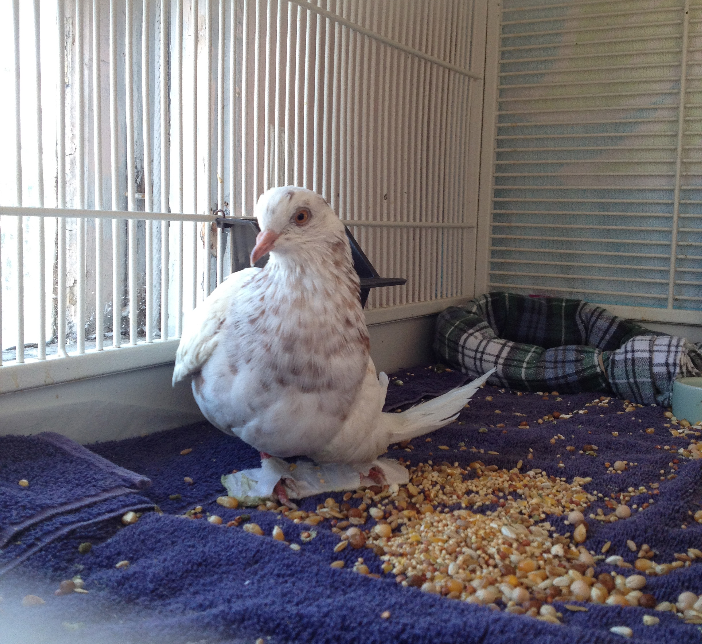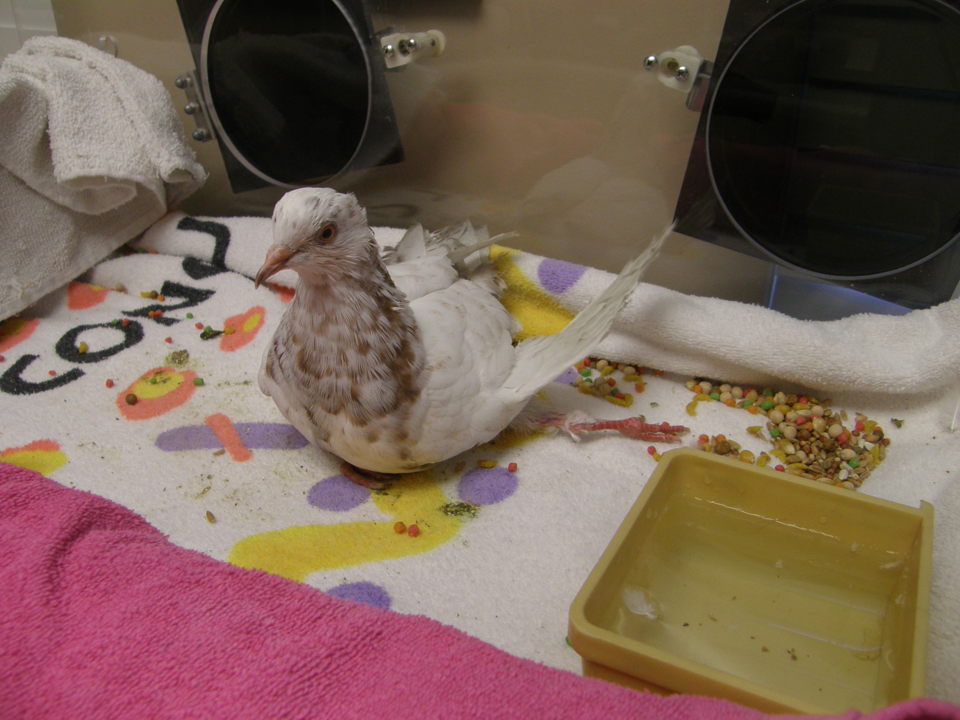 On September 26th, I received this Email: “Hello, My name is Dr. VanGilder and I have a patient named “Angel” presented to me at Four Seasons Animal Hospital who is in need of your help. She is a wonderful, bright, spunky bird who has an angular limb deformity of the left leg, limiting her mobility. Her owner loves her very much but doesn’t feel that she can provide the care she deserves. We are left with the choice between humane euthanasia and rehoming. I am hopeful that you can help us find a fostering/adoption situation that will give this pigeon a second lease on life.” MickaCoo is struggling to stay aloft with never enough funding and always more birds than capacity to help them and so taking responsibility for Angel was not the easy choice it should have been. She couldn’t stand, walk or fly and would need expensive corrective surgery and lots of supportive care if she was to have any chance for a full life. Here’s her story. Please make a donation towards her care if you can. (Click on the first photo to see the images full size.)