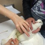 Blossom came in with painful swollen feet and I worked with my vet to treat her. You could tell by the way she was walking that she was in a lot of discomfort. We put her on antibiotics. They cleared up her feet issue but then she got a bump at her wing joint, though still on the antibiotics. (Blossom had paratyphoid.) We switched her onto different antibiotics to take care of the wing but a few days into the new medications she began to act sluggish. A few days later I noticed she wasn’t really pooping and she had a lump on her belly that seemed to grow. I had a real bad feeling about this and couldn’t sleep Sunday night. Monday morning I got out of bed and was trying to find help to get her to the vet while I went to work. The more I stuck around trying to find help, the more Blossom seemed to be fading. I skipped work and the wonderful leader of the rescue group MickaCoo, Elizabeth Young, ditched all her chores for the day and drove us out to Oakley to the Medical Center for Birds.