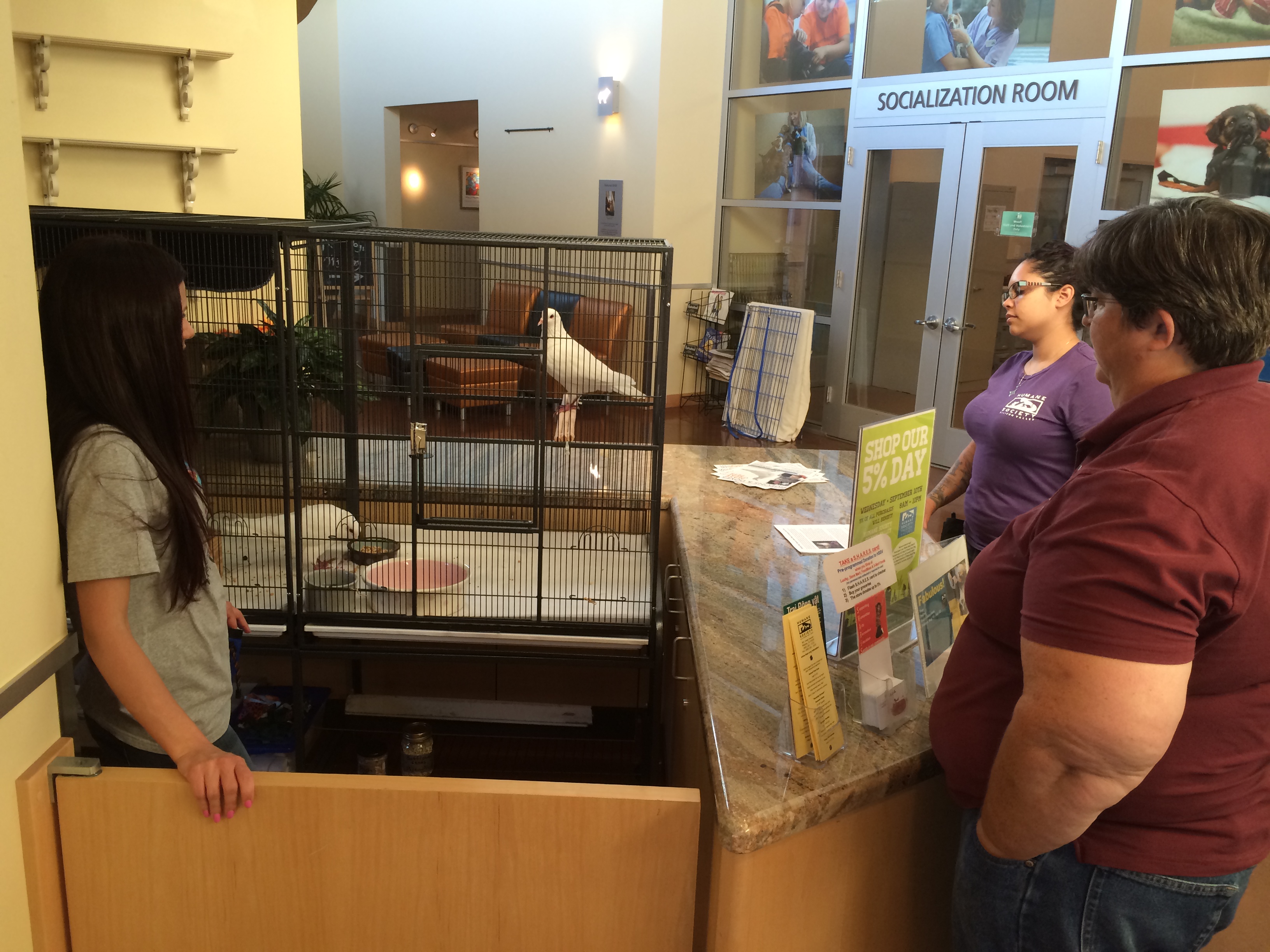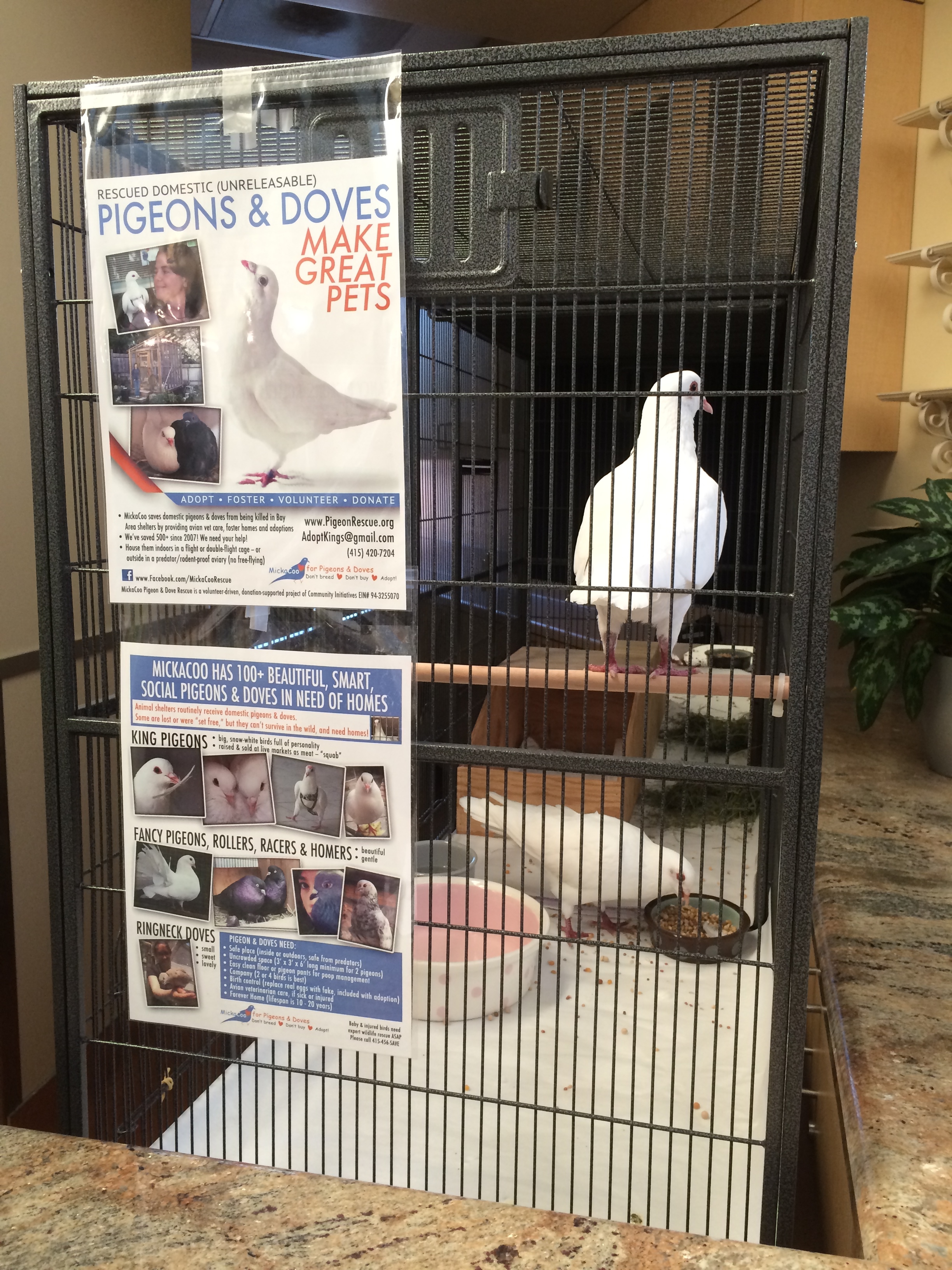 It’s quite extraordinary when you think about it. MickaCoo Pigeon & Dove Rescue has saved more than 600 pigeons and doves’ lives, all without the benefit of a facility. We have to work extra hard to engage the public from the homes and backyard aviaries of our incredibly dedicated volunteers and via outreach events. Imagine what we could do if we had our own site? We’re not there yet but I am extremely excited to introduce you to our latest partnership, our MickaCoo-HSSV Lobby Pigeon Project! Thank you, HSSV, for welcoming MickaCoo into your big, beautiful adoption center and extra special thanks to VP of Community Alliances Beth Ward for championing this collaboration and to Volunteer Programs Manager Kris Gunderson for helping to implement it! (Please click on the photos to view full size.)