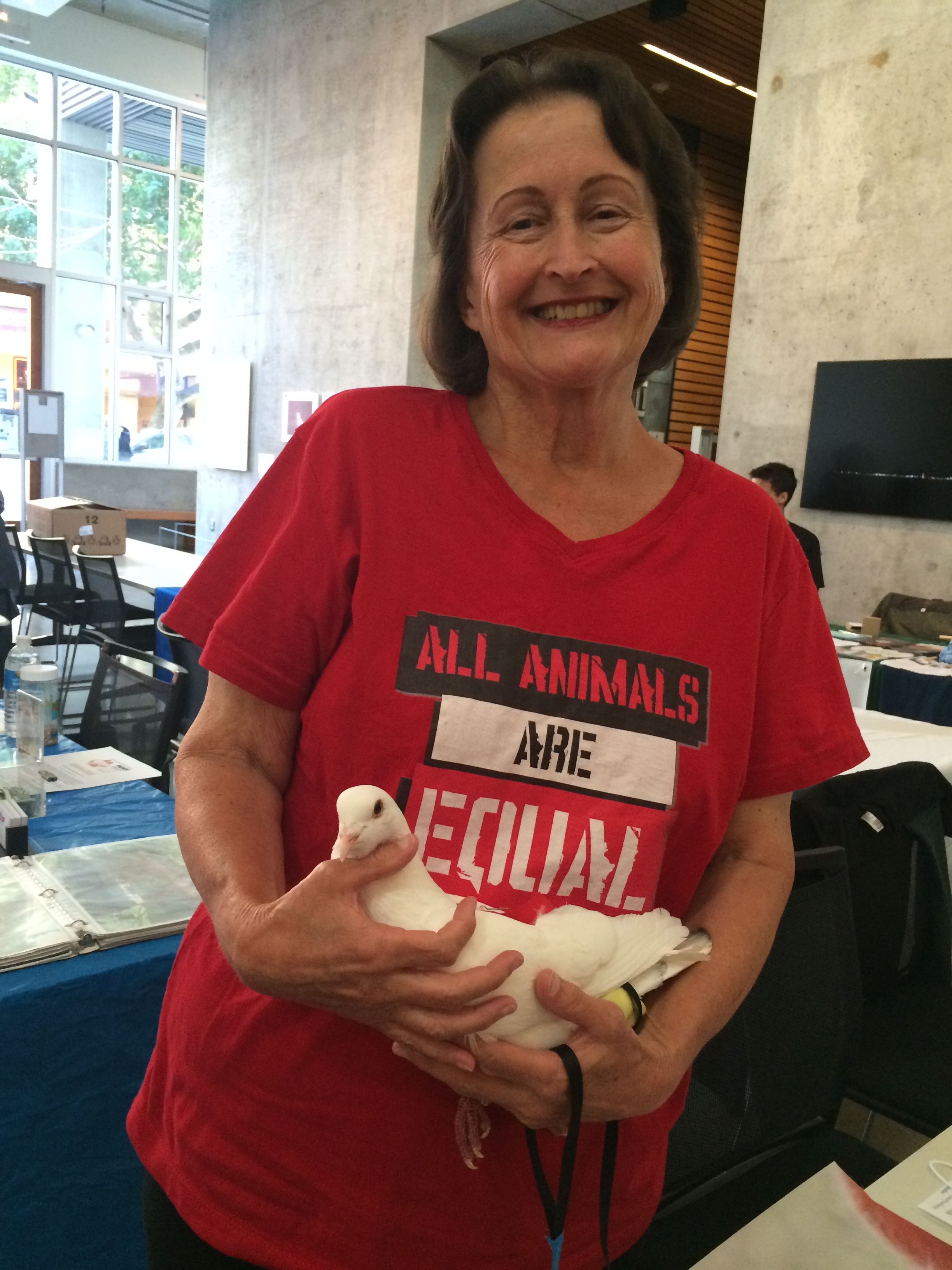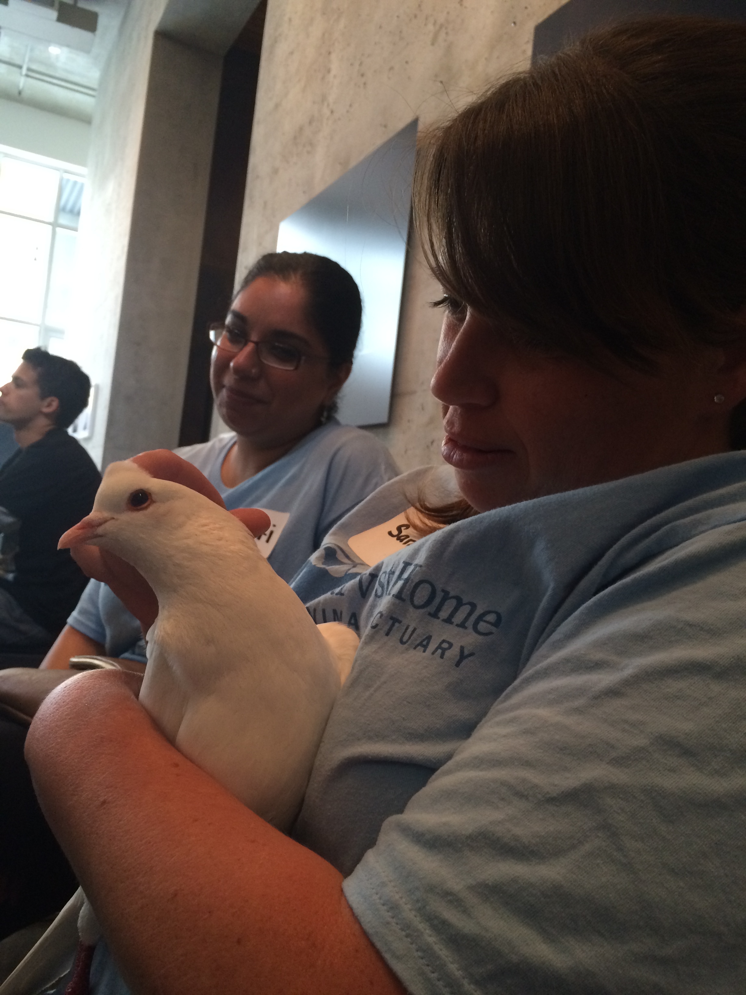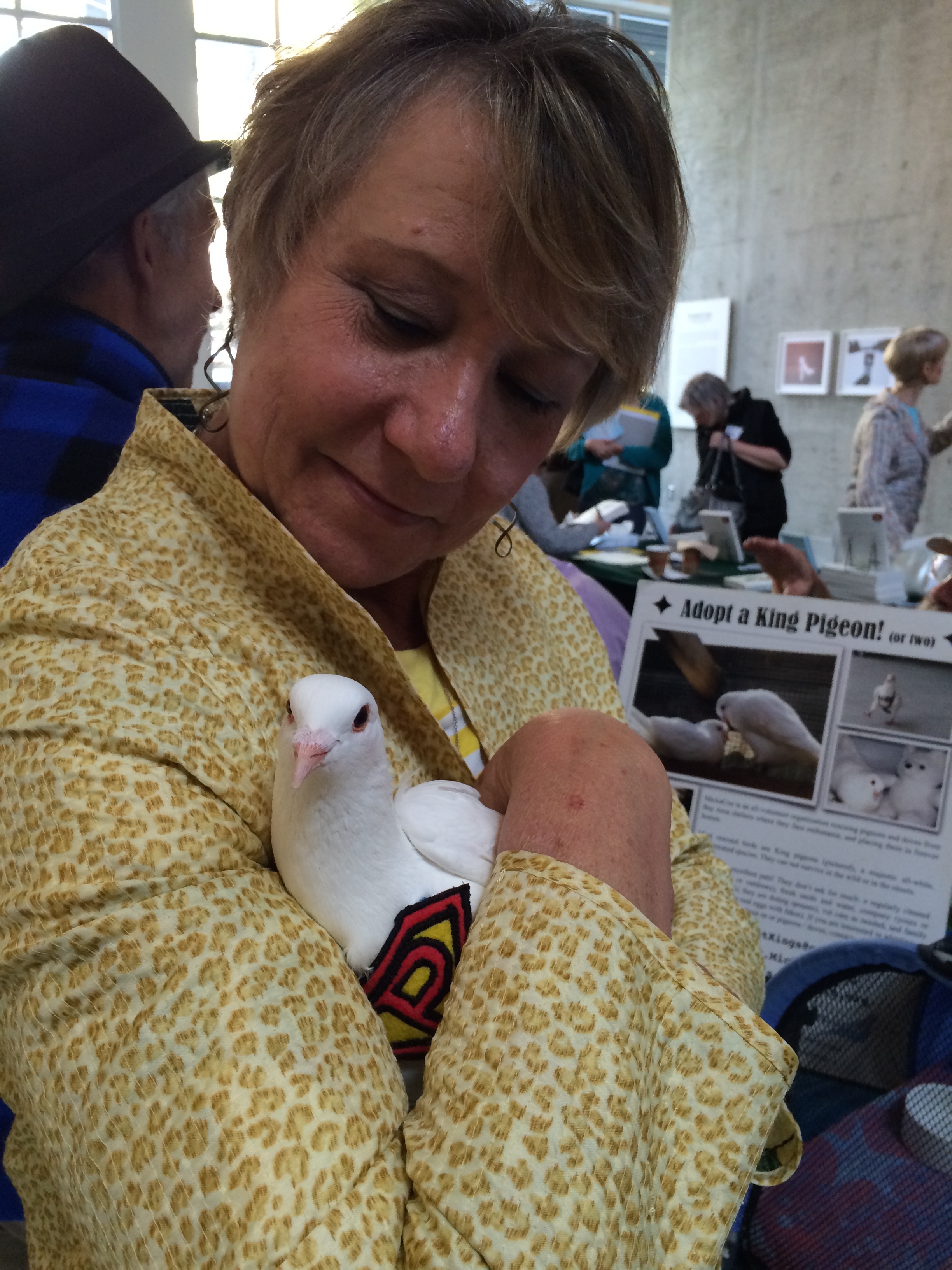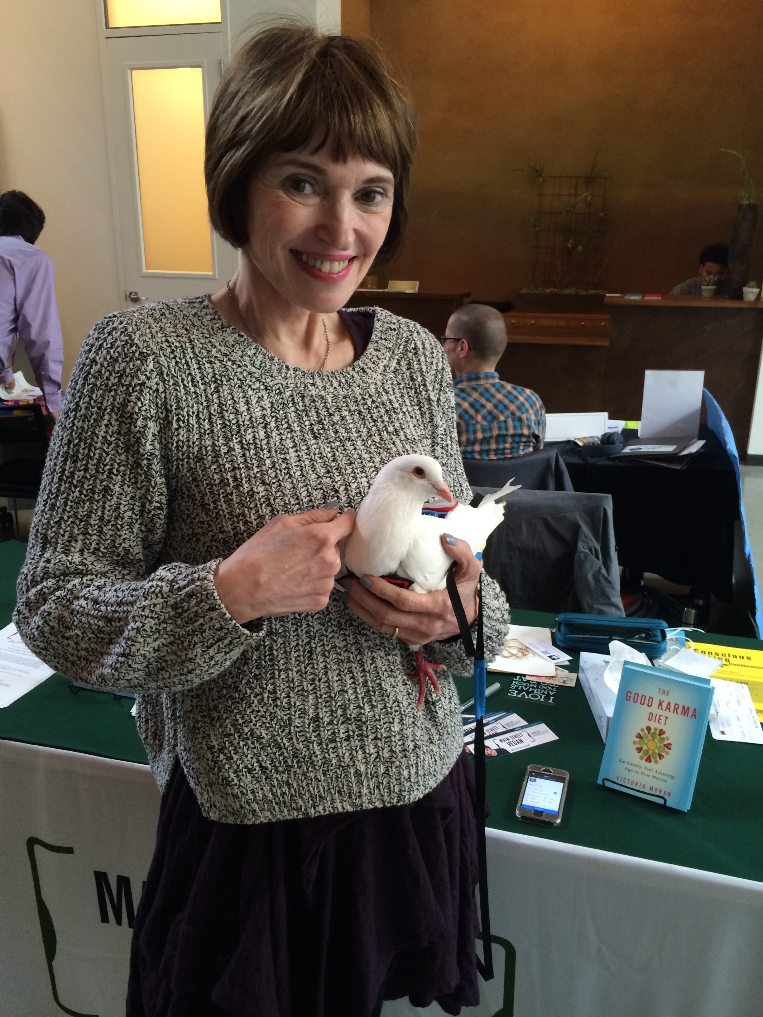I had an amazing day on Saturday, April 4th, 2015. Pat, a rescued King pigeon (bred for meat- squab), and I attended the fourth annual Conscious Eating Conference put on by United Poultry Concerns & Animal Place. We learned so much! T.J. Tumasse of Animal Legal Defense Fund presented on what investigators find happening to farmed animals and if only a few moments of what he showed was common knowledge, people would look at their food very differently. (Farmed animals need their own Blackfish-type film to awaken consumers.) Mary Finelli of Fish Feel gave a mind-blowing presentation about the trillions of fish being killed annually- far more and even more wastefully than any other animal. Kim Sturla made the case for why farm sanctuaries have to be educators, providing “classrooms without walls”. Karen Davis who, 25 years ago did what everybody said couldn’t be done and created United Poultry Concerns, spoke eloquently on the role of single issue campaigns. When Karen wanted to start UPC, she was told that if people couldn’t even be inspired to care about whales, they could never care about chickens but she has proved them wrong. Victoria Moran, author of Main Street Vegan and The Good Karma Diet (among other titles) gave an uplifting call to the abundance of vegan living. It was a great conference and we were privileged to be there advocating on behalf of pigeons and learning from animal rights leaders. Click on the photos to see full size.