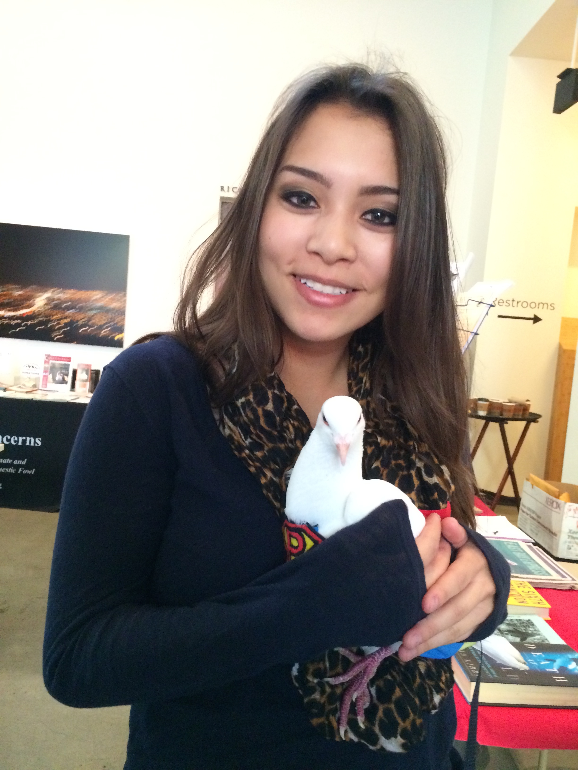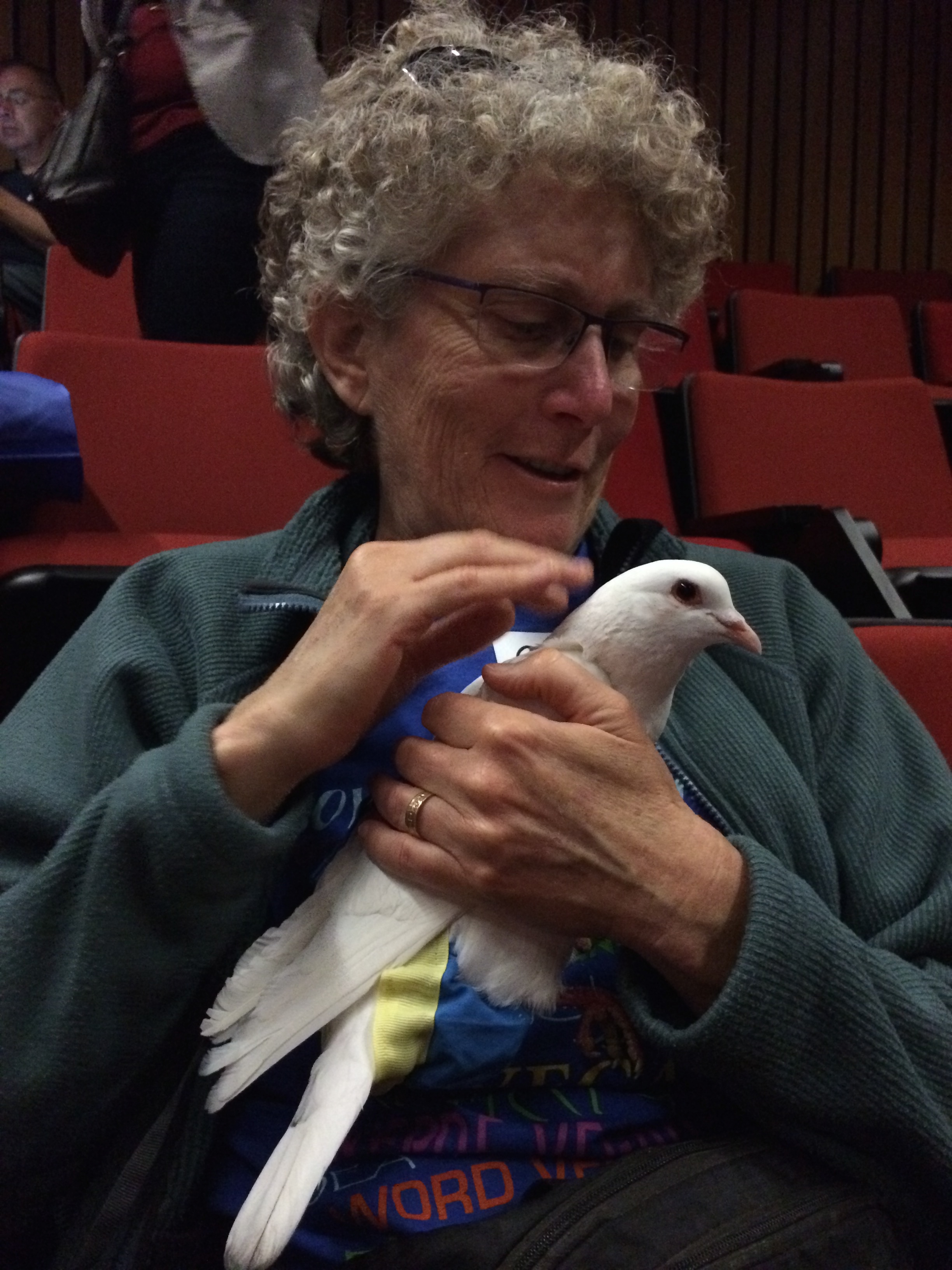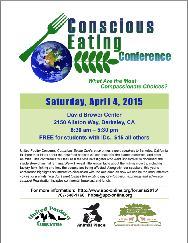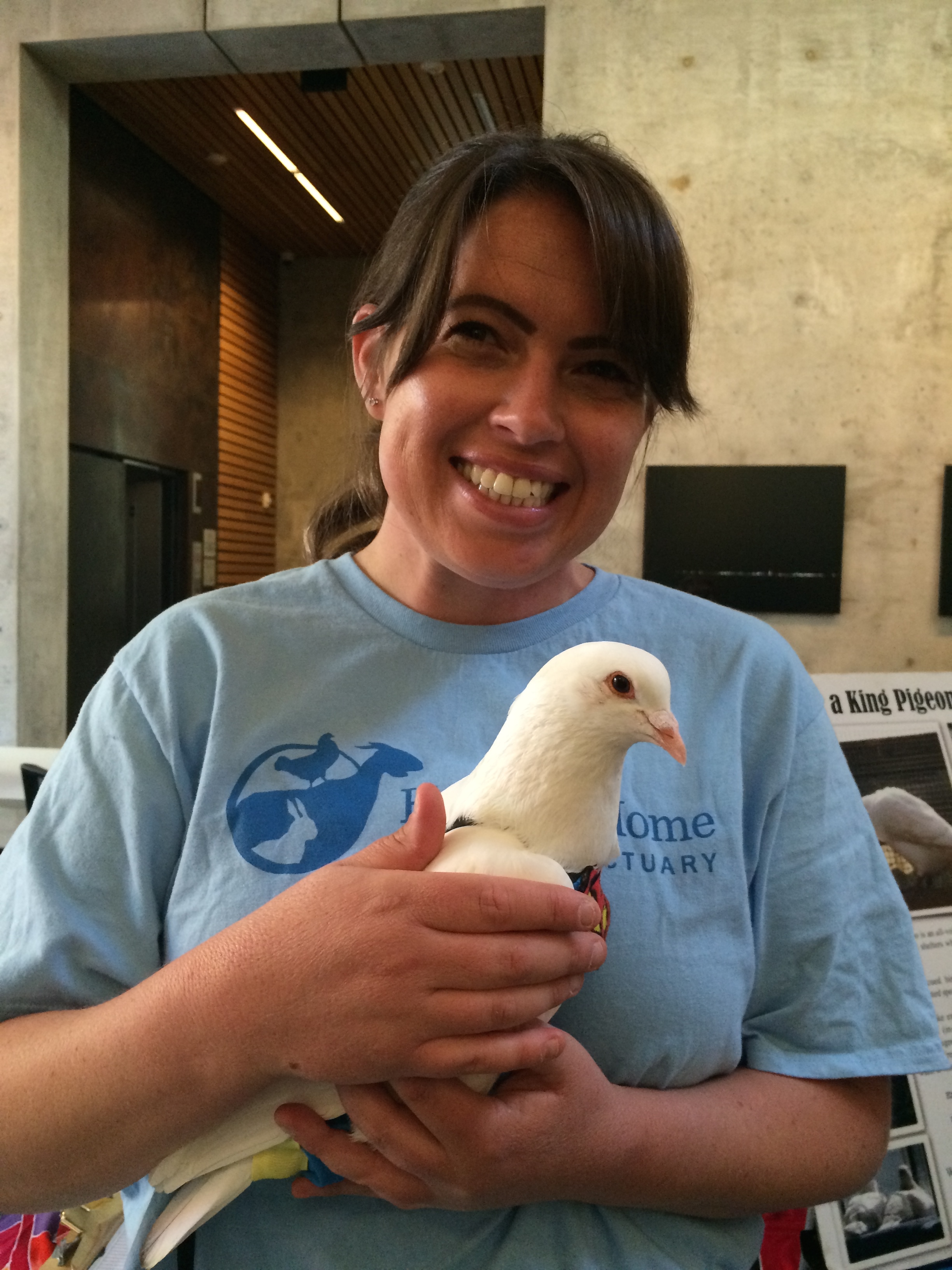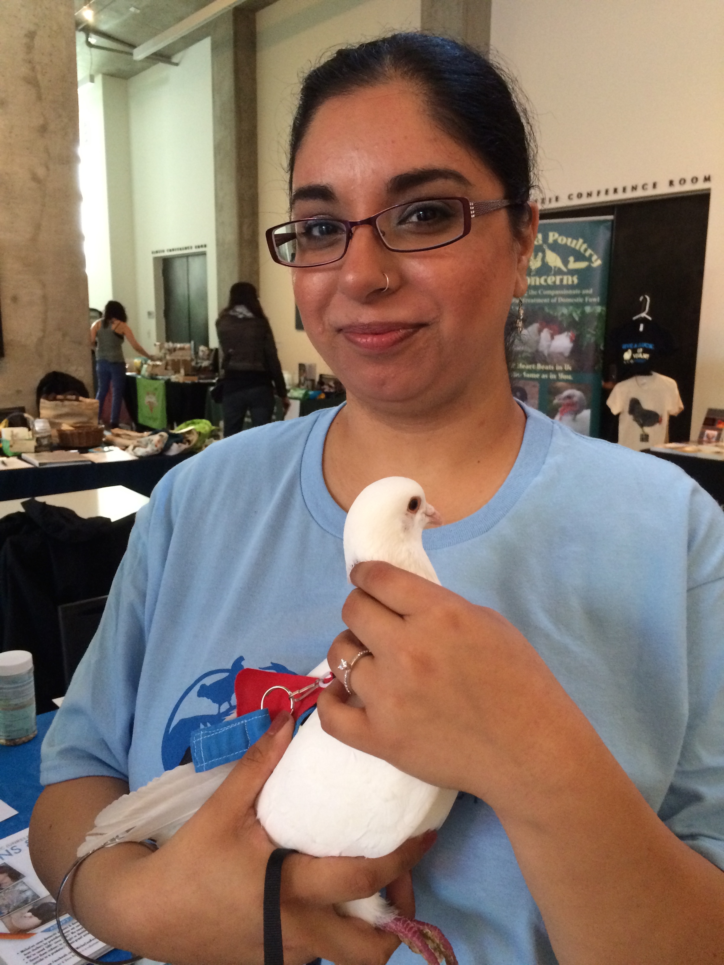 I had an amazing day on Saturday, April 4th, 2015. Pat, a rescued King pigeon (bred for meat- squab), and I attended the fourth annual Conscious Eating Conference put on by United Poultry Concerns & Animal Place. We learned so much! T.J. Tumasse of Animal Legal Defense Fund presented on what investigators find happening to farmed animals and if only a few moments of what he showed was common knowledge, people would look at their food very differently. (Farmed animals need their own Blackfish-type film to awaken consumers.) Mary Finelli of Fish Feel gave a mind-blowing presentation about the trillions of fish being killed annually- far more and even more wastefully than any other animal. Kim Sturla made the case for why farm sanctuaries have to be educators, providing “classrooms without walls”. Karen Davis who, 25 years ago did what everybody said couldn’t be done and created United Poultry Concerns, spoke eloquently on the role of single issue campaigns. When Karen wanted to start UPC, she was told that if people couldn’t even be inspired to care about whales, they could never care about chickens but she has proved them wrong. Victoria Moran, author of Main Street Vegan and The Good Karma Diet (among other titles) gave an uplifting call to the abundance of vegan living. It was a great conference and we were privileged to be there advocating on behalf of pigeons and learning from animal rights leaders. Click on the photos to see full size.
