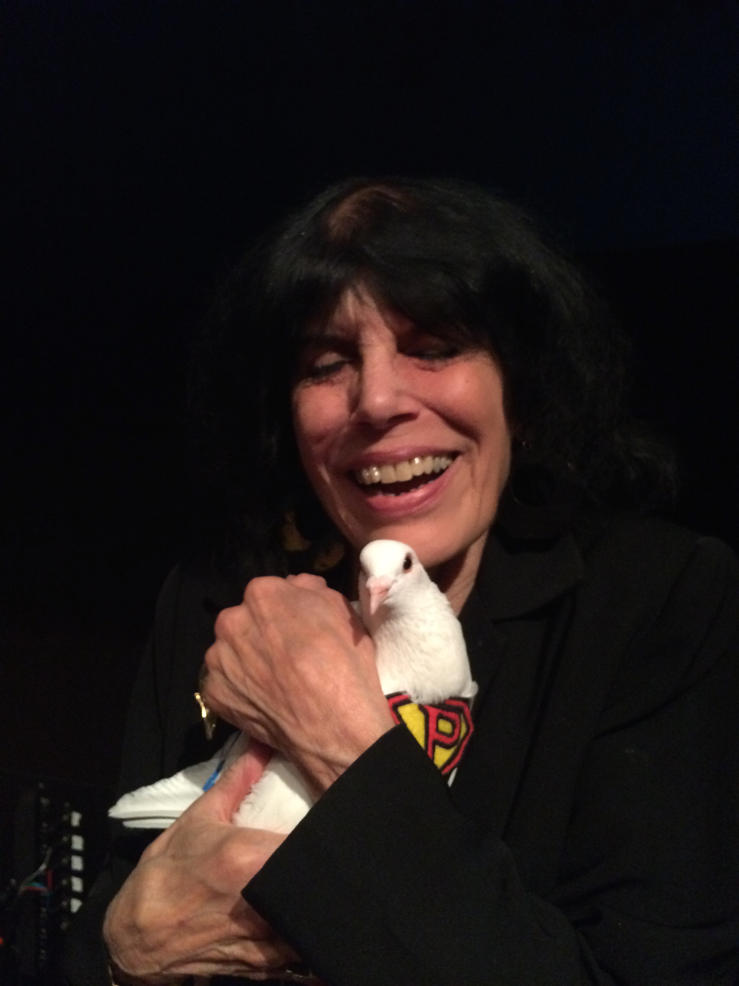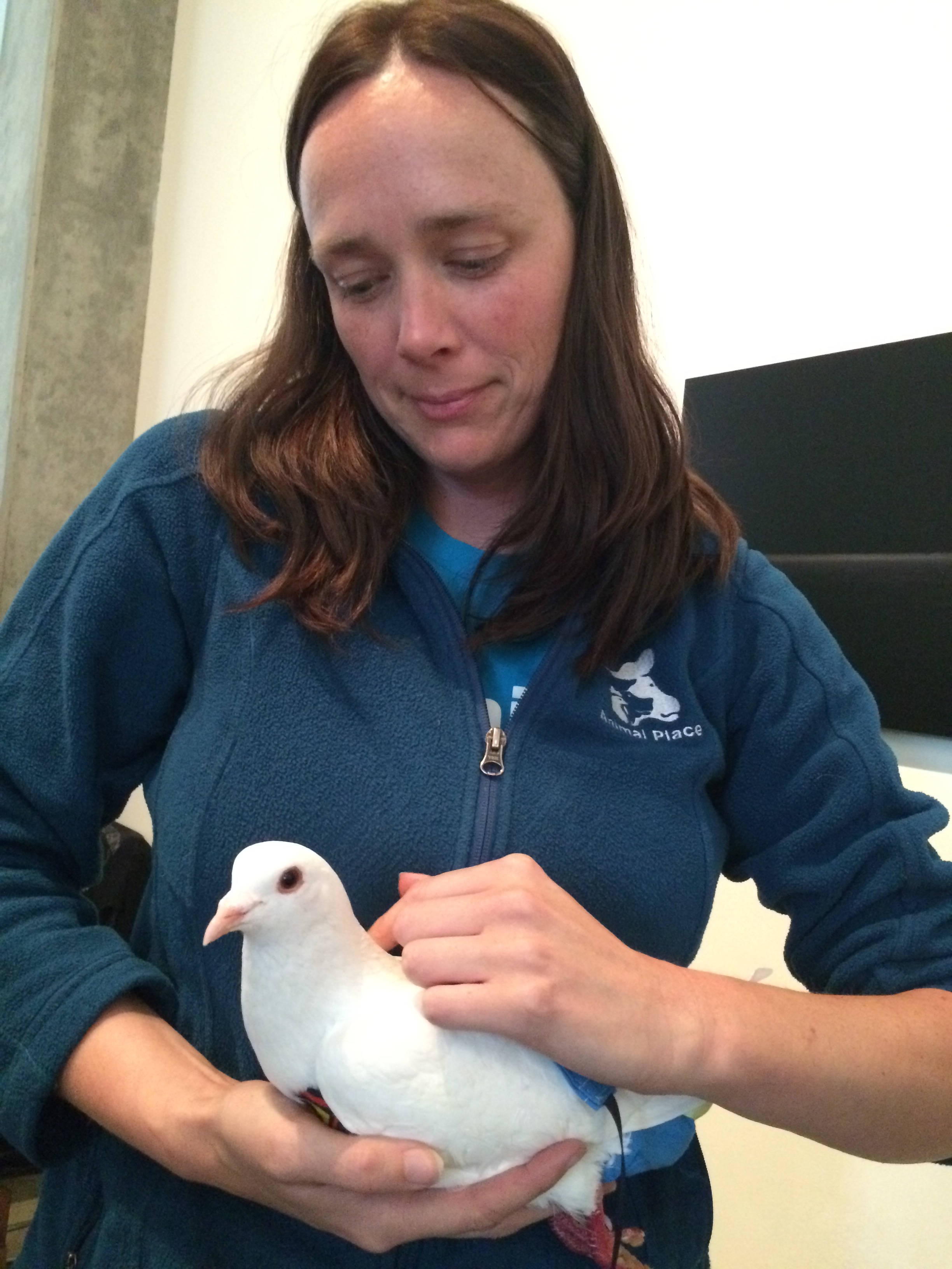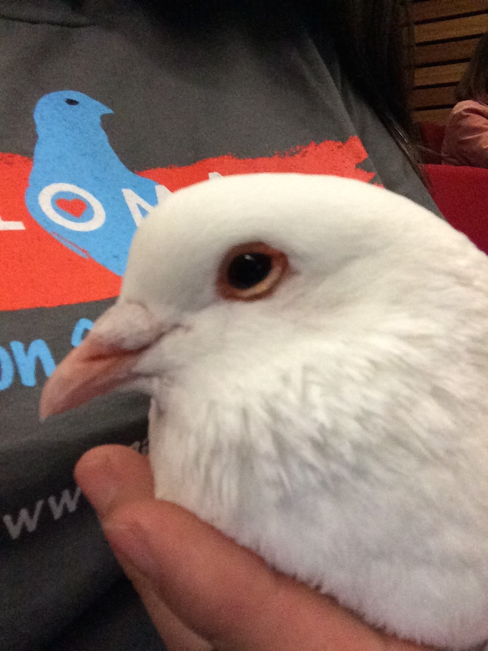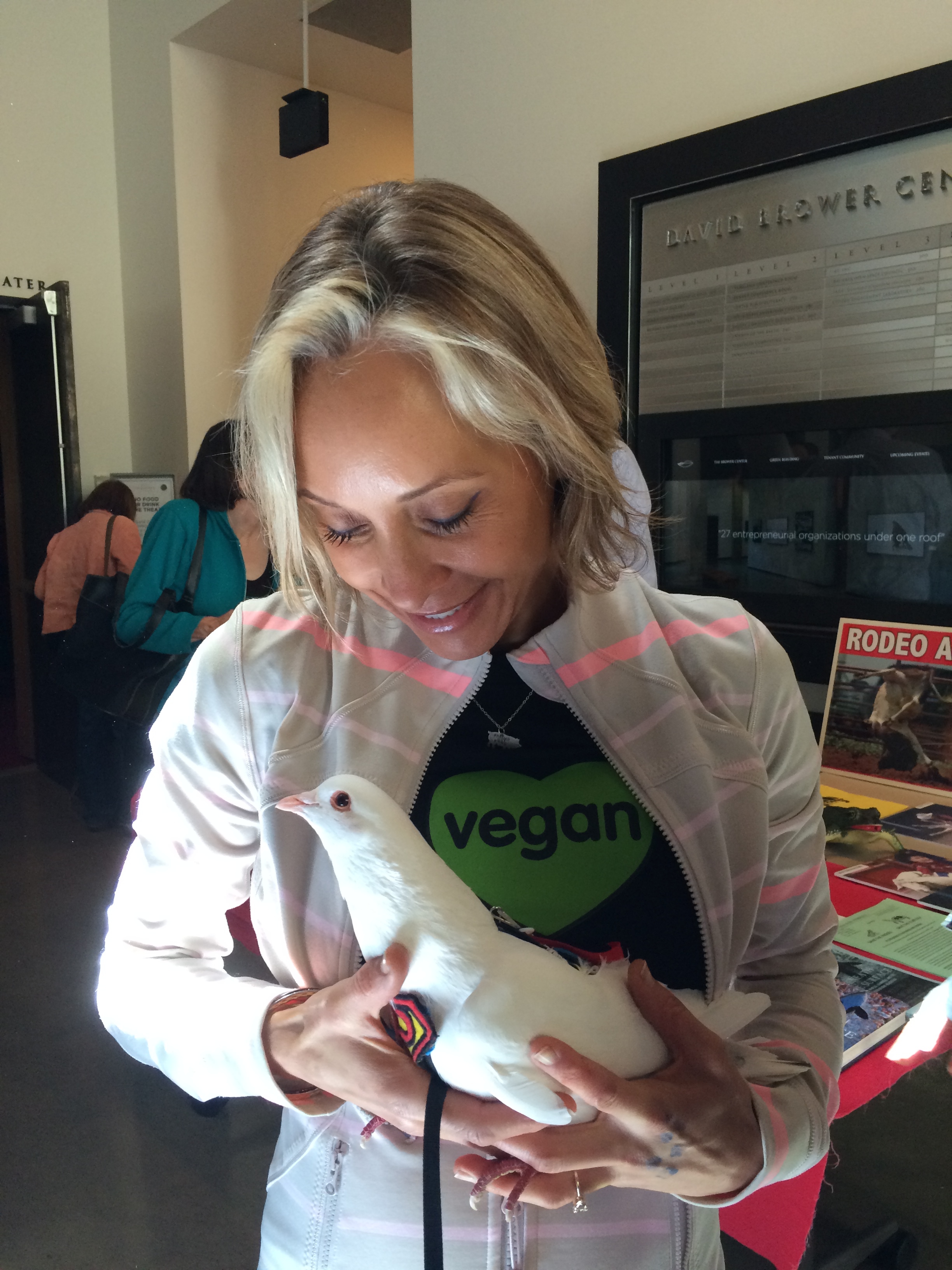 I had an amazing day on Saturday, April 4th, 2015. Pat, a rescued King pigeon (bred for meat- squab), and I attended the fourth annual Conscious Eating Conference put on by United Poultry Concerns & Animal Place. We learned so much! T.J. Tumasse of Animal Legal Defense Fund presented on what investigators find happening to farmed animals and if only a few moments of what he showed was common knowledge, people would look at their food very differently. (Farmed animals need their own Blackfish-type film to awaken consumers.) Mary Finelli of Fish Feel gave a mind-blowing presentation about the trillions of fish being killed annually- far more and even more wastefully than any other animal. Kim Sturla made the case for why farm sanctuaries have to be educators, providing “classrooms without walls”. Karen Davis who, 25 years ago did what everybody said couldn’t be done and created United Poultry Concerns, spoke eloquently on the role of single issue campaigns. When Karen wanted to start UPC, she was told that if people couldn’t even be inspired to care about whales, they could never care about chickens but she has proved them wrong. Victoria Moran, author of Main Street Vegan and The Good Karma Diet (among other titles) gave an uplifting call to the abundance of vegan living. It was a great conference and we were privileged to be there advocating on behalf of pigeons and learning from animal rights leaders. Click on the photos to see full size.