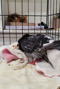 Once we got home, Nanda’s condition took a down turn. She became anorexic and just stood in one spot, breathing heavily. I started supporting her with sub cu fluids, small gavage fed meals and love. I also noticed that even though her crop was emptying, she wasn’t eliminating herself and the seeds she ate at the wildlife center were still sitting in her crop, static. I helped her to poop (this is the first time I’ve ever had to help a pigeon poop!) and she felt better, but then the same thing would happen again. She would digest her food but couldn’t eliminate. Again, I helped her eliminate and got her another appointment at MCFB.