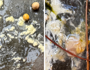 The next day, she laid what appeared to be loose egg remnants (see photo). To be safe, Dr. Galusha prescribed antibiotics, and over the next ten days she seemed to improve — the hunching dissipated and her droppings returned to almost-normal. I thought we were in the clear! But then about two weeks later, the cycle began again — right when she would be due to lay another egg.