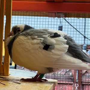 Paige is survivor of the inhumane “sport” of pigeon racing. Seven years ago, she landed in Elizabeth Young’s backyard — that’s a VERY smart pigeon who self-rescues to the Palomacy founder’s patio! That was in the summer of 2019. We adopted Paige a couple of months later, and she married our rescued King pigeon Cantaloupe almost instantly.