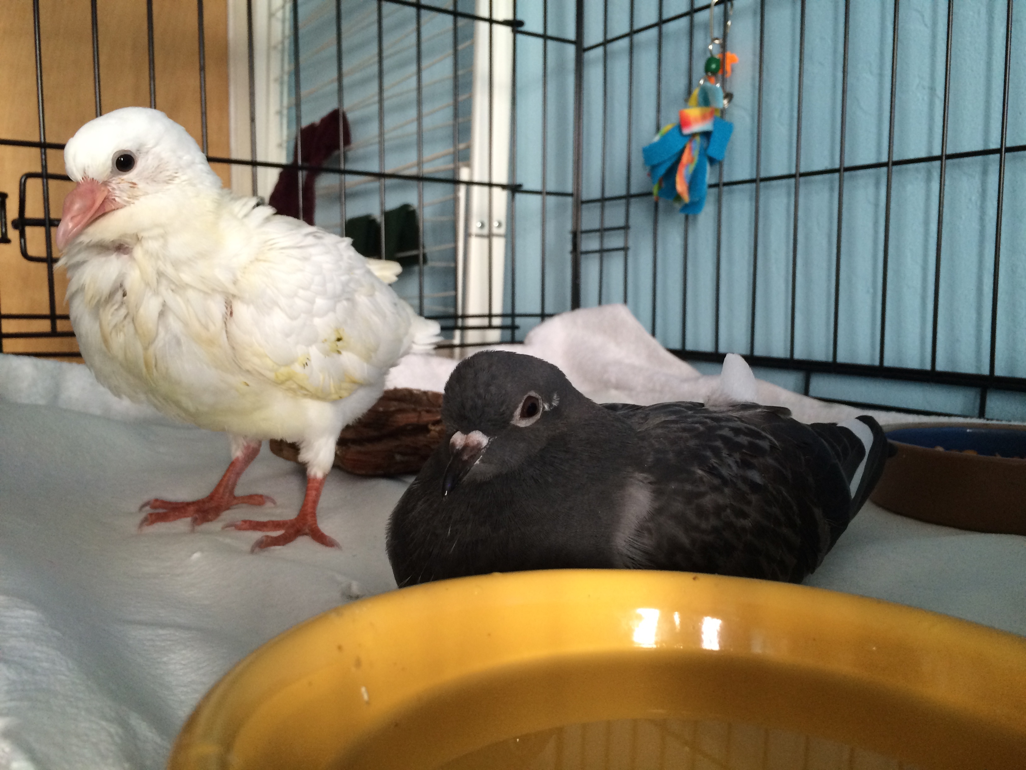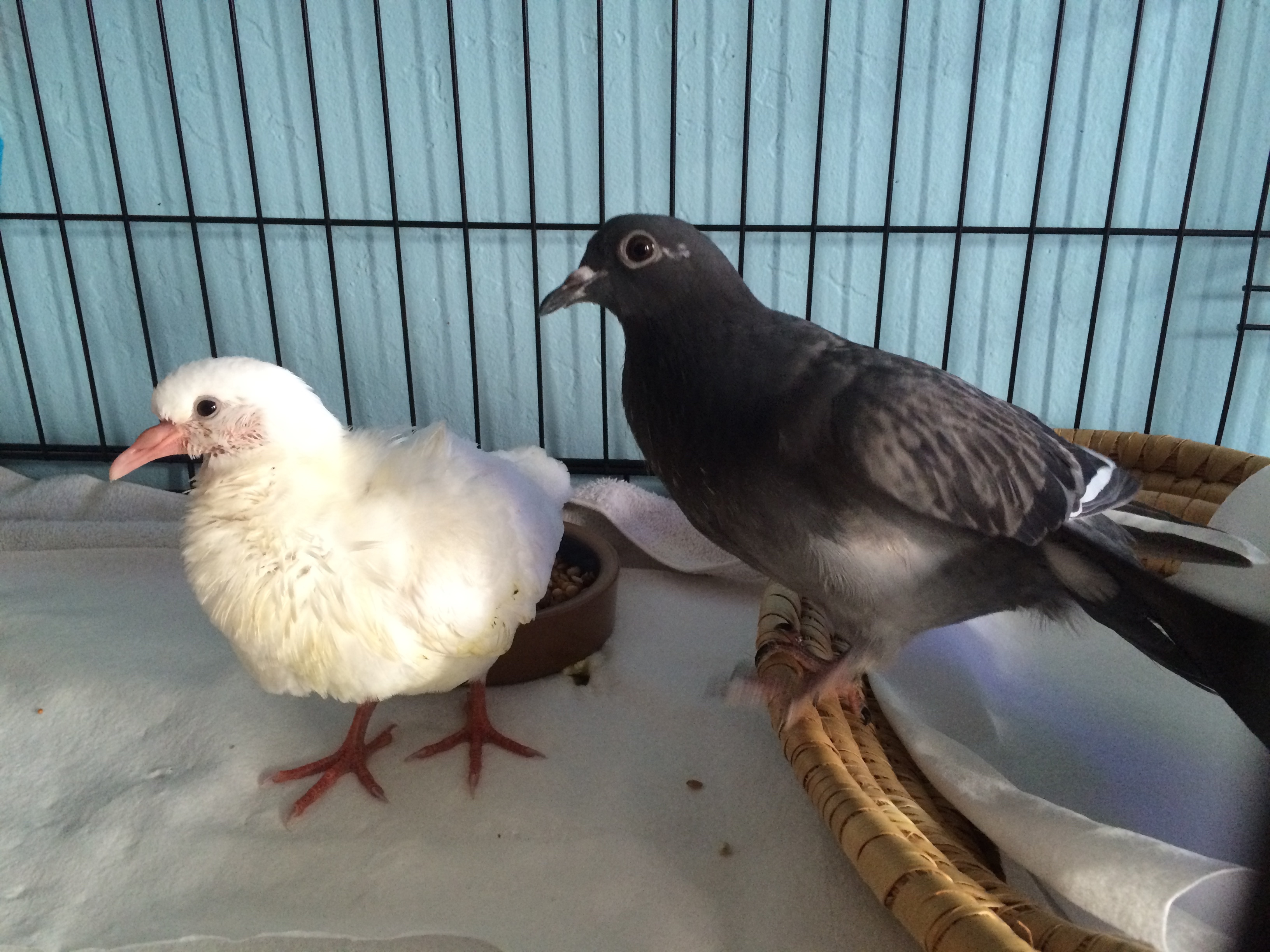 One of the challenges of bird rescue is fitting each bird, according to his and her needs, into the right situation. I call it Pigeon Tetris (doves are involved as well). We have 23 different foster homes caring for nearly 100 birds ranging from big, strong adults through to the old, frail and special-needs birds. A not-yet-self-feeding baby like Lucy can’t just be put in an aviary. Then I had an inspiration. I had a new foster family that was going to be taking in a single young adult pigeon, Swift, that had been waiting too long at the shelter but perhaps I could persuade them instead to foster two birds- blind youngster Henry and delicate baby Lucy. Both were lonesome. Both were young and frail and each needed a gentle, safe companion. It was a hell of a lot to ask of new foster volunteers- to take two birds instead of one, to take on a blind bird and especially, to take on a baby King Pigeon who might not survive after the ordeal she had been through. (These youngsters, bred to be butchered at only 4 weeks old, come in sick, traumatized and without the robust immune system an adult pigeon has. Many don’t make it, despite everything we do to save them.) Incredibly, Cris & Kelly said yes. And so, on Sunday, August 9th, I packed up Henry and headed back to the shelter to get baby Lucy and Swift, the young adult pigeon who had waited so long (and who I could fit into my aviary).