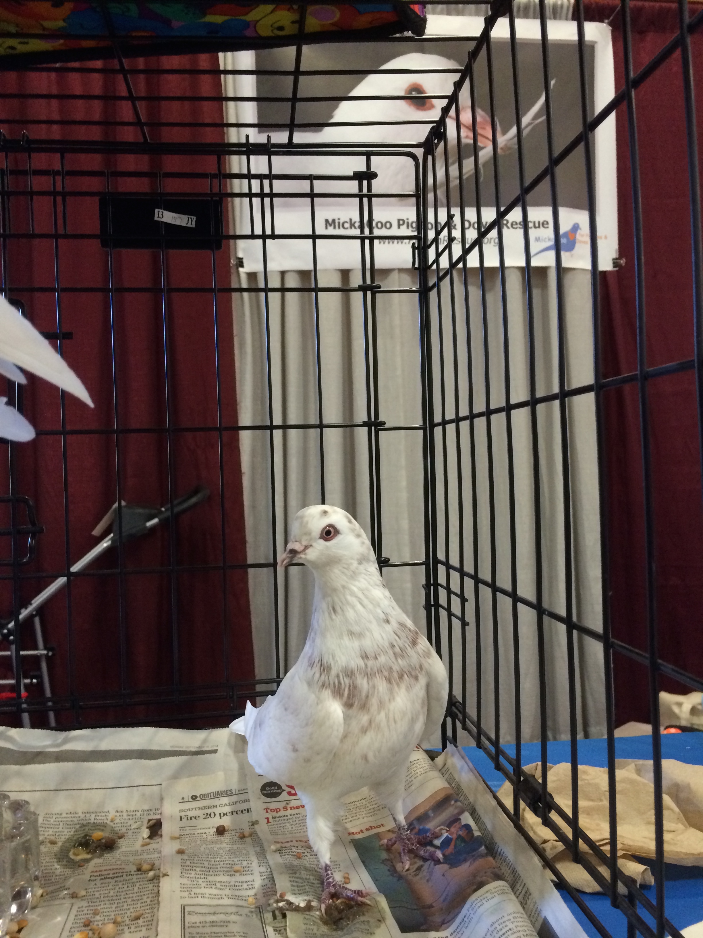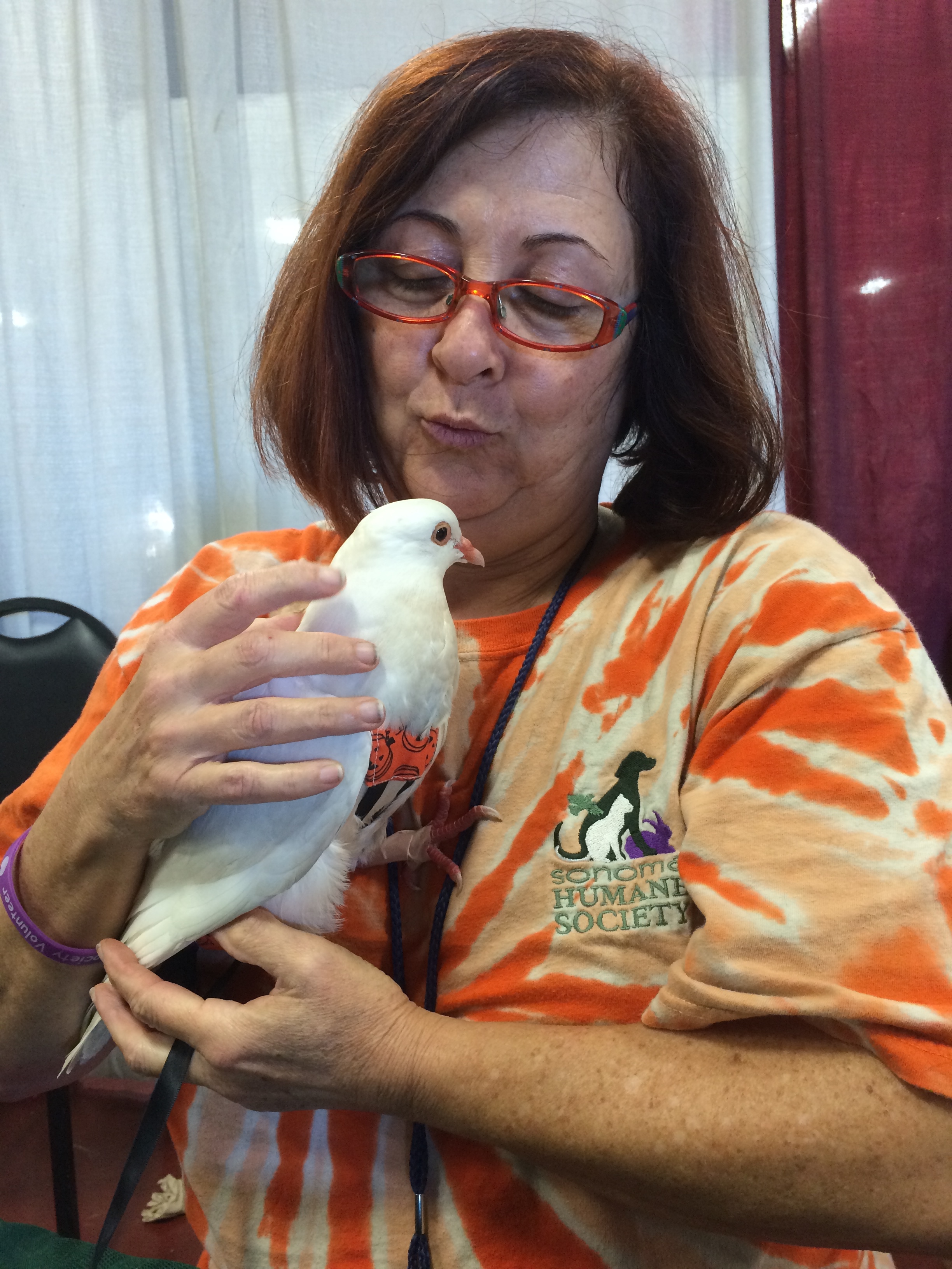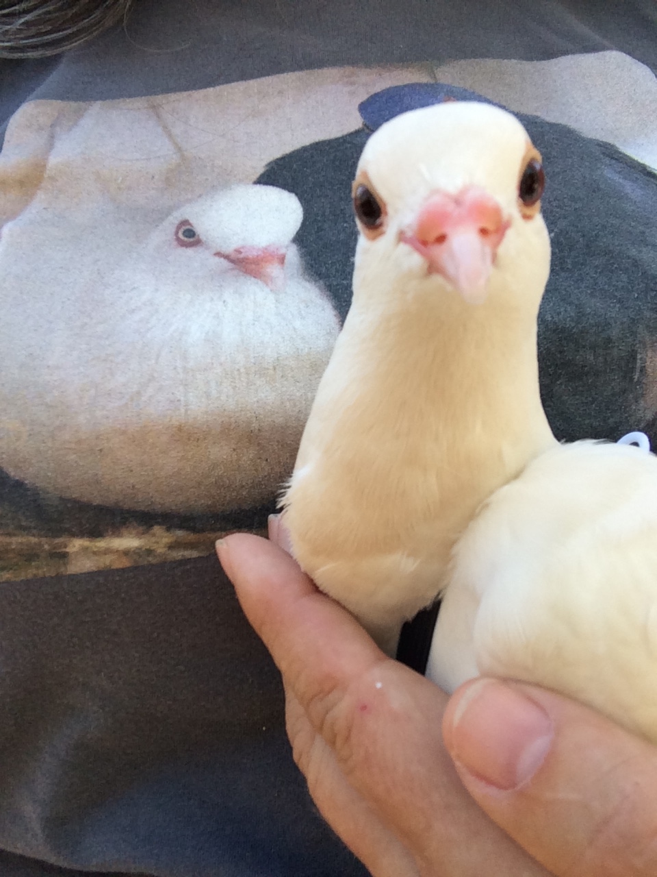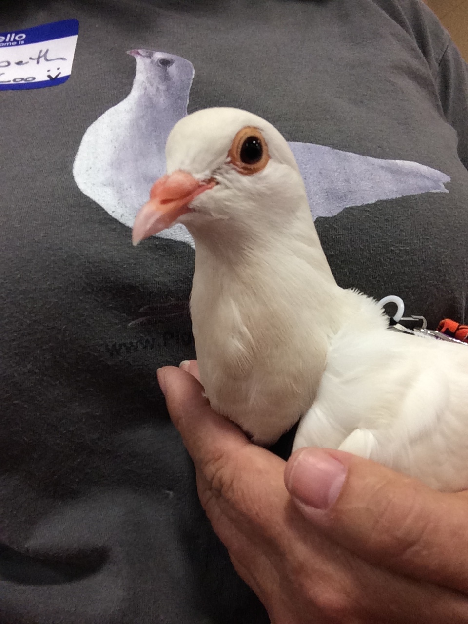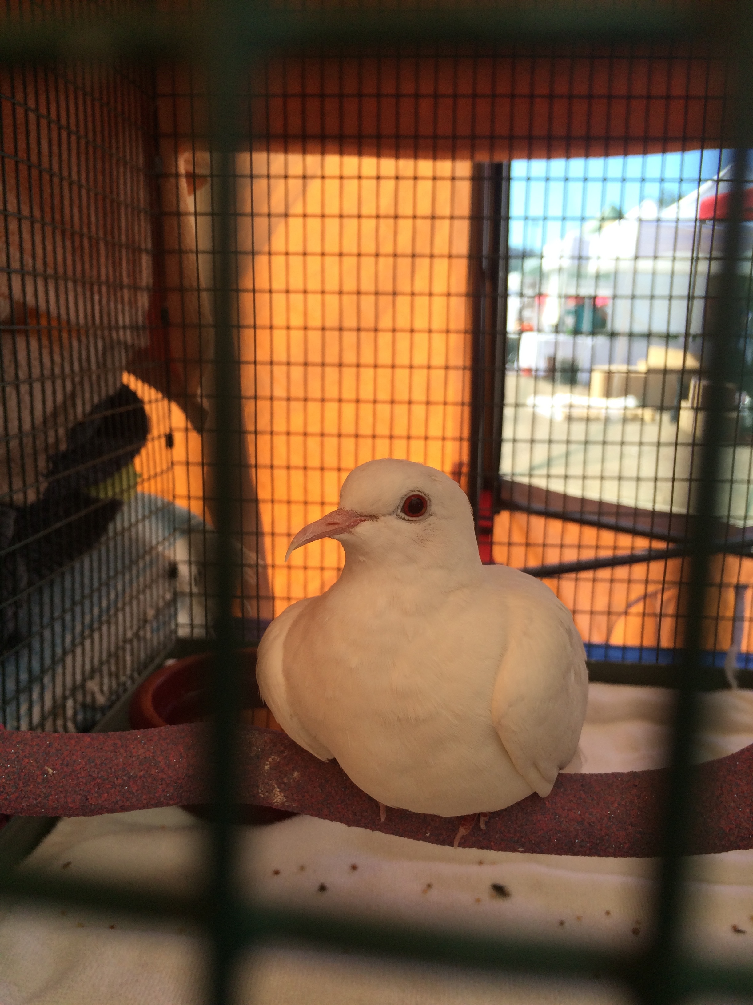 A note from Elizabeth- Every day selectively inbred domestic pigeons like Holly are exposed to the risks of the wild by hobbyists, racers and “dove release” people. They are gambling with the lives of the innocent birds who have no choice in the matter. Holly was very lucky to survive her time on her own. Many birds do not. Thank you to Candy & Rick for saving this one. (Learn more- Never Buy & Release Birds!)