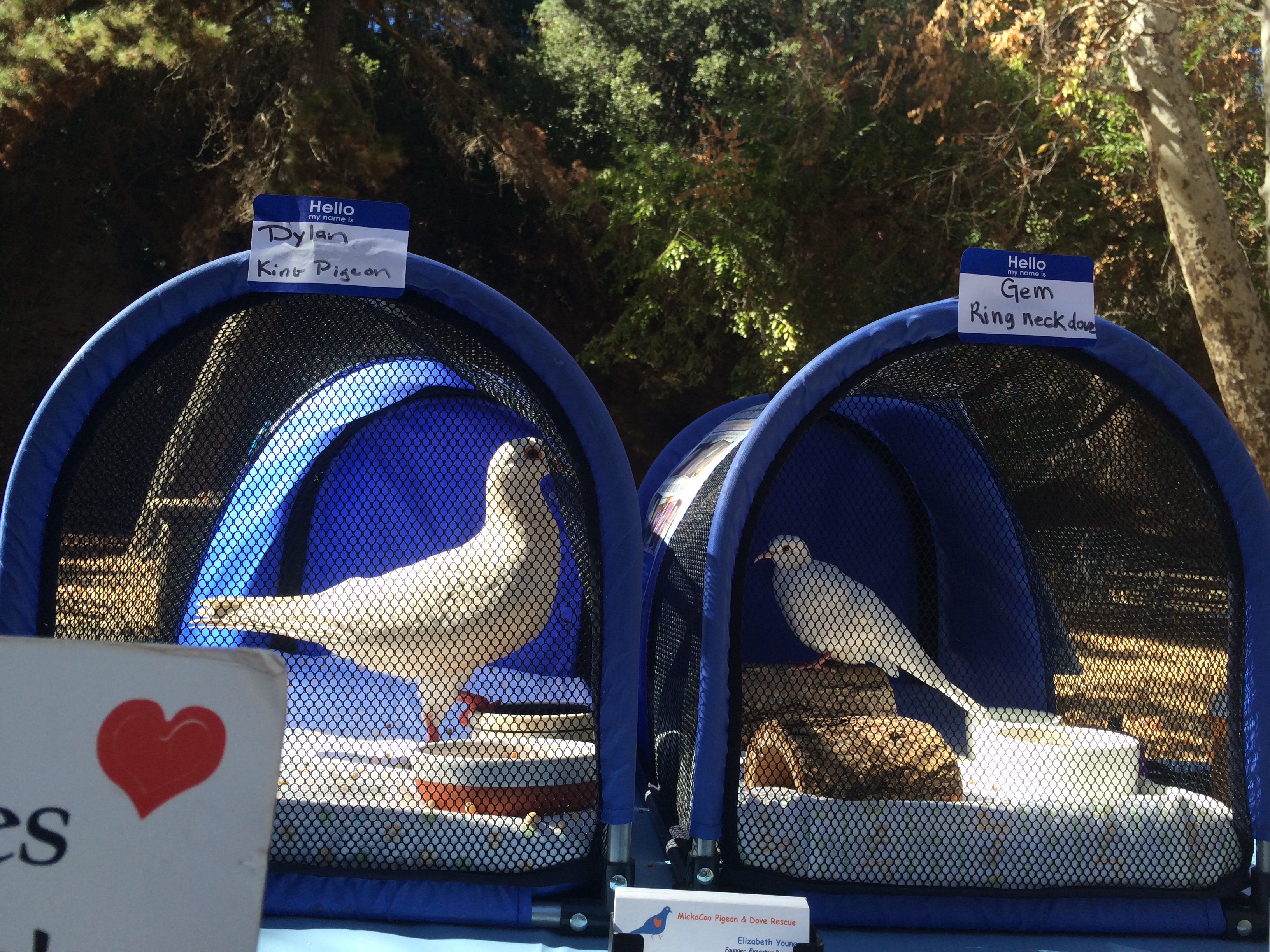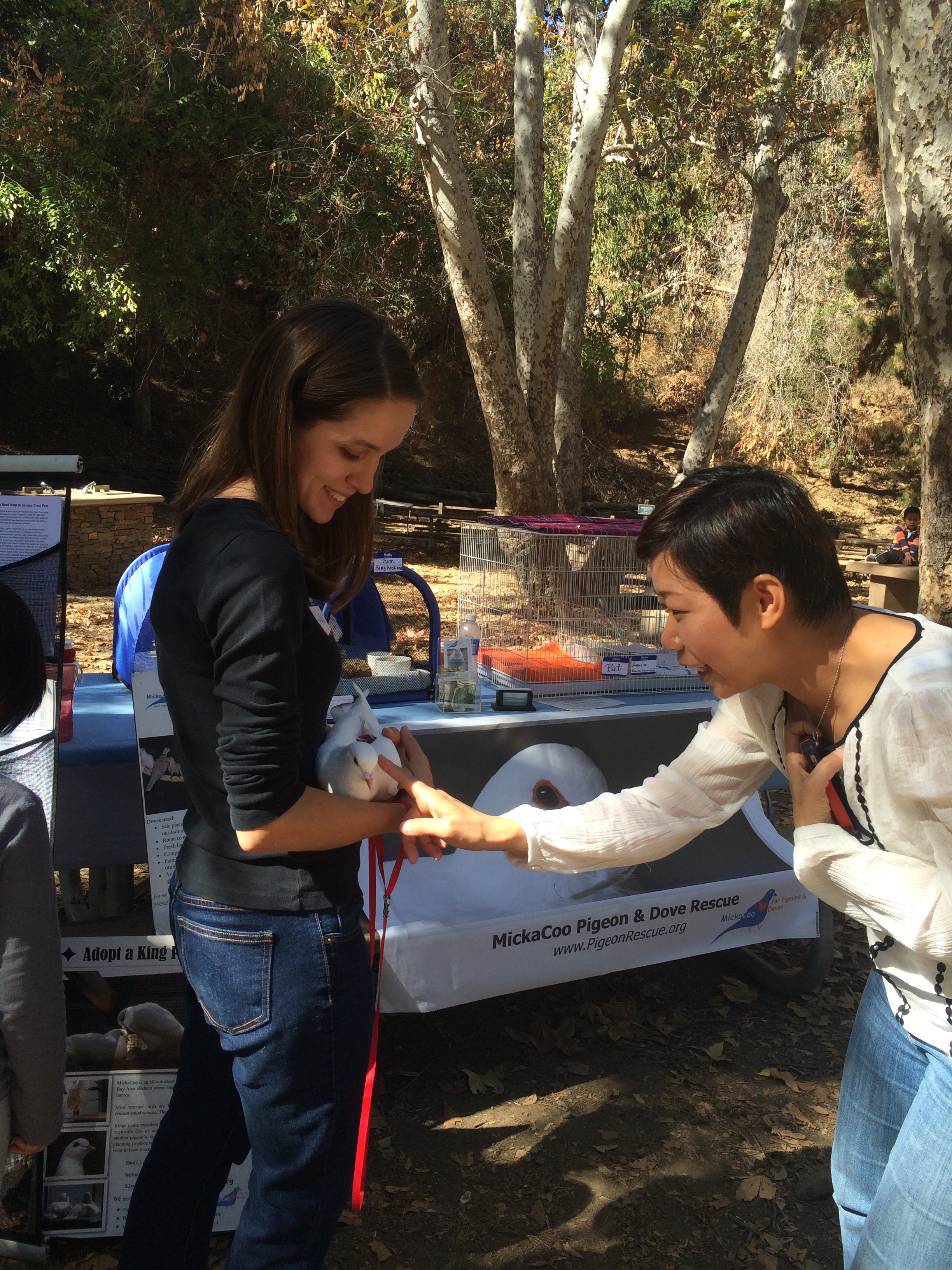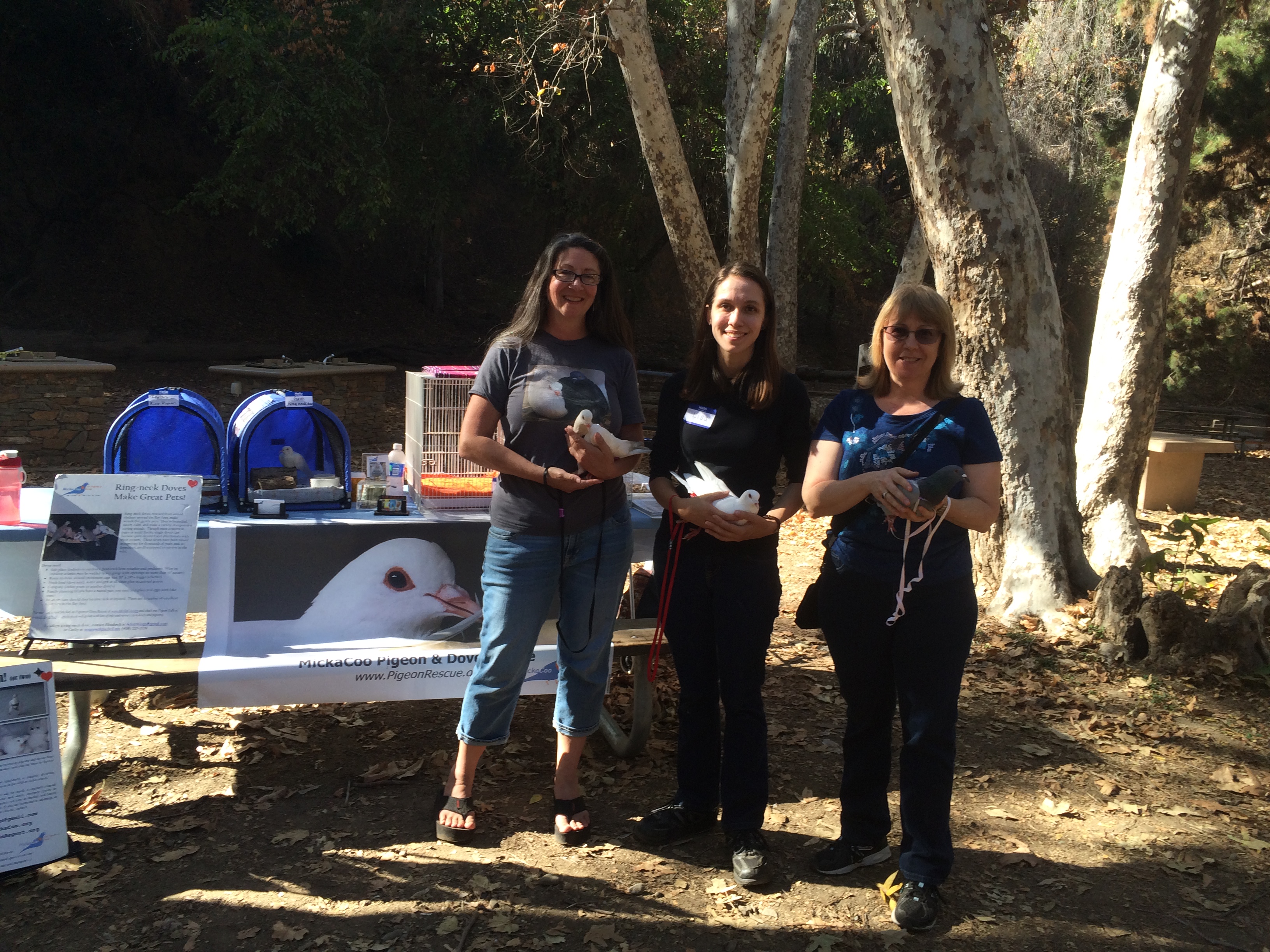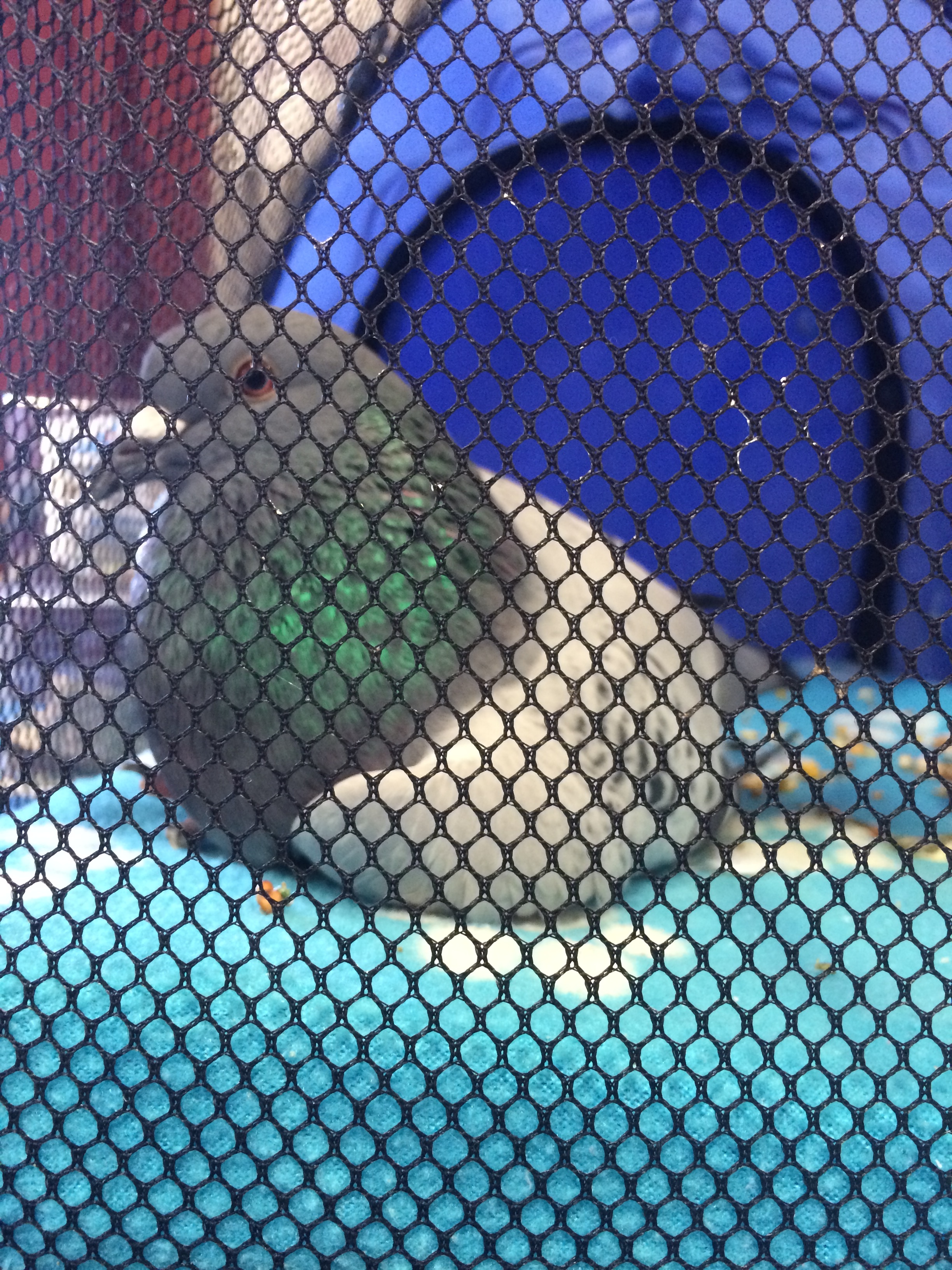 I thought, What a pretty bird. I had never seen a pink bird. My husband and I were both out taking pictures and we could get fairly close and it didn’t fly away… I was really fascinated by this pretty bird and wondered why it was staying in our yard. We wondered, Did it belong to someone in the neighborhood? I started sending out its picture, asking neighbors and strangers if they knew what type of bird this was. Everyone was amazed at its pink color. Over the next week, I noticed it would leave around noon and I felt kind of sad not knowing if it would come back or not but, sure enough round 5 PM, I would go out and there it was back in our yard. One night it slept on a branch of our Oleander tree. I told my husband that I felt sorry for the bird and that we should bring it inside. My husband laughed at me and told me we were not bringing the bird inside as we have three cats… I started really wondering about this bird and what we could do to keep it safe. (We had noticed a cat snooping around our back yard that didn’t belong to us, our cats are all indoor cats.) Luckily, while searching on line for information about doves and pigeons, as we weren’t sure which this was, I came across your website MickaCoo Pigeon & Dove Rescue. I emailed you the picture and asked about the bird, not knowing if I would hear back or not. Almost immediately I received a response from you, Elizabeth, telling me this was a domestic pigeon that someone had dyed pink, possibly to be released during a wedding, and that we needed to catch this bird ASAP or, lacking survival skills, it would most likely be killed. I rushed home from work that day and told my husband that we needed to catch the bird. He told me, We are not catching the bird. I showed him your email and told him I was going to catch the bird. So out into the back yard I go to see where the bird was and there it was on our brick fence separating us from our neighbor’s back yard. I tried luring her down with some bird feed I had picked up from the grocery store but no, she was not coming down from the fence. So I tried sneaking up on it and it looked up at me and flew into our neighbor’s yard. As I was waiting for it to come back, I received an email from you asking if we had caught the bird yet and I responded not yet but I was trying. I climbed up one of our Oleander trees to peek into the neighbor’s yard to see if it was there and sure enough she was there eating off a bench in the neighbor’s backyard. This made me wonder if it was their bird so I went next door (we didn’t know these neighbors very well) and asked if it was their bird. Kelly, our neighbor, responded No but they had noticed it was hanging around for a couple of weeks so they had bought some bird feed for it. That’s when I realized where it was probably going every afternoon, over to those nice neighbors that had put bird feed out in their back yard. After talking with Kelly, who I got to know so much better than I had before, Rick, my husband called me wondering where I was as it was after dark now and I hadn’t told him I was going next door.