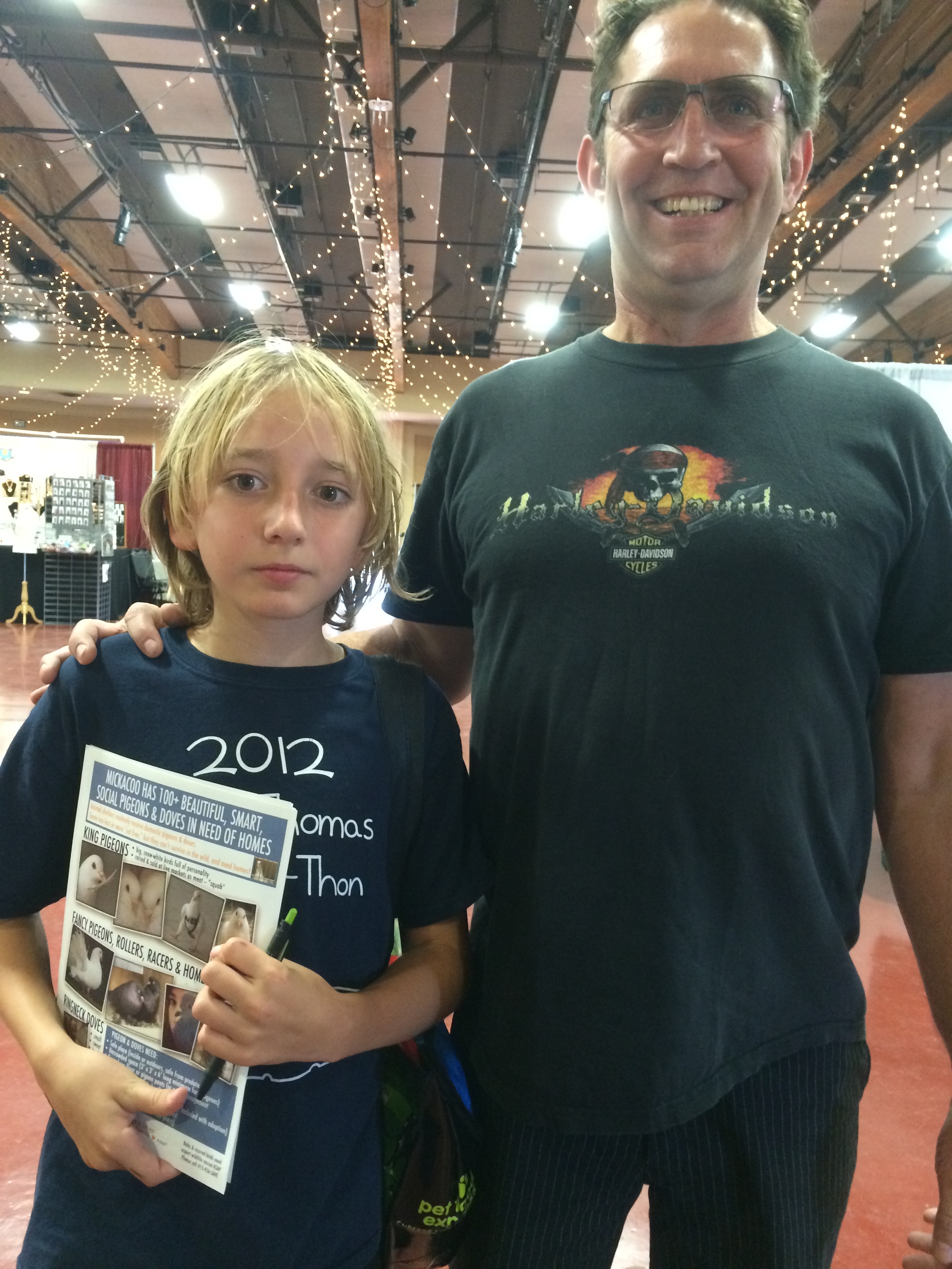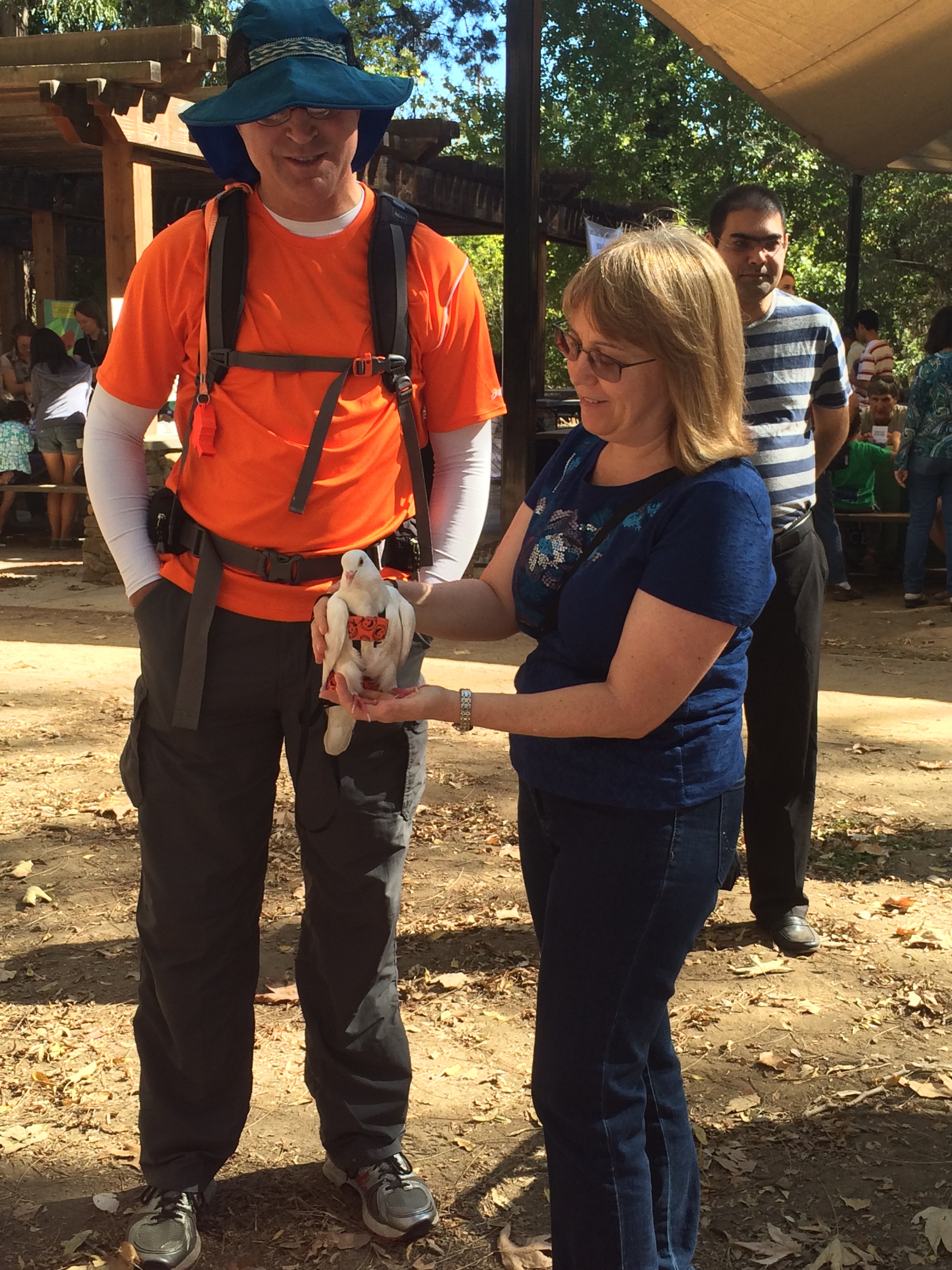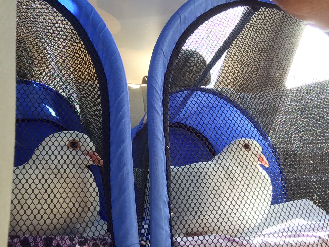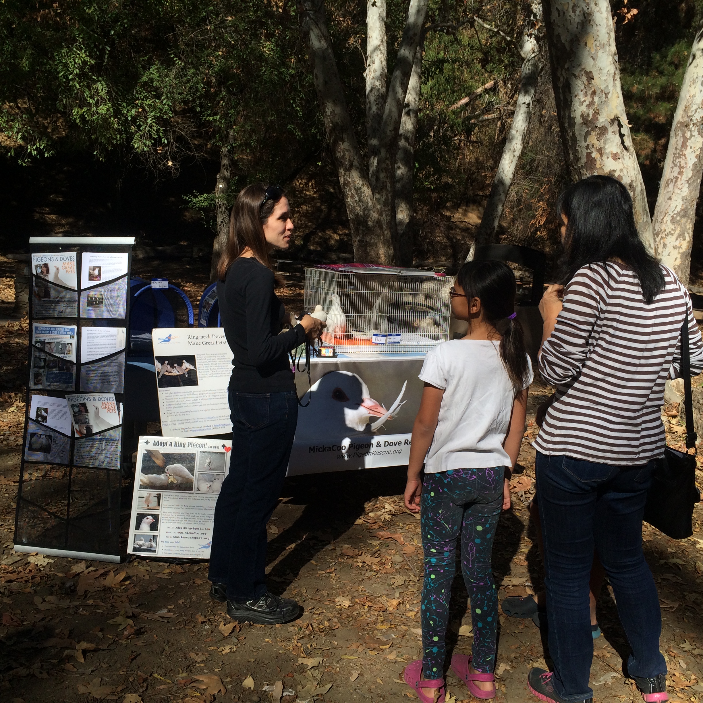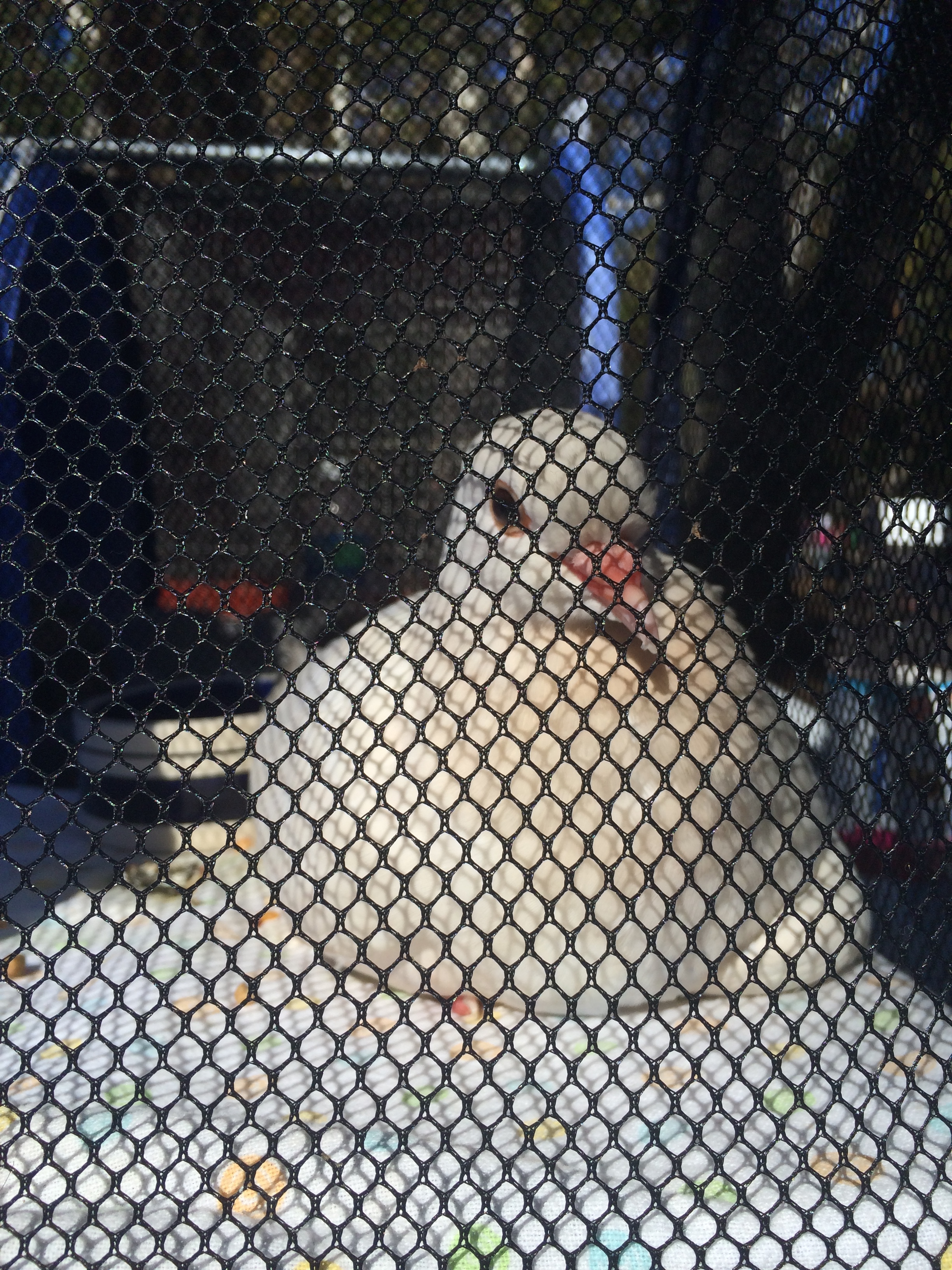 I thought, What a pretty bird. I had never seen a pink bird. My husband and I were both out taking pictures and we could get fairly close and it didn’t fly away… I was really fascinated by this pretty bird and wondered why it was staying in our yard. We wondered, Did it belong to someone in the neighborhood? I started sending out its picture, asking neighbors and strangers if they knew what type of bird this was. Everyone was amazed at its pink color. Over the next week, I noticed it would leave around noon and I felt kind of sad not knowing if it would come back or not but, sure enough round 5 PM, I would go out and there it was back in our yard. One night it slept on a branch of our Oleander tree. I told my husband that I felt sorry for the bird and that we should bring it inside. My husband laughed at me and told me we were not bringing the bird inside as we have three cats… I started really wondering about this bird and what we could do to keep it safe. (We had noticed a cat snooping around our back yard that didn’t belong to us, our cats are all indoor cats.) Luckily, while searching on line for information about doves and pigeons, as we weren’t sure which this was, I came across your website MickaCoo Pigeon & Dove Rescue. I emailed you the picture and asked about the bird, not knowing if I would hear back or not. Almost immediately I received a response from you, Elizabeth, telling me this was a domestic pigeon that someone had dyed pink, possibly to be released during a wedding, and that we needed to catch this bird ASAP or, lacking survival skills, it would most likely be killed. I rushed home from work that day and told my husband that we needed to catch the bird. He told me, We are not catching the bird. I showed him your email and told him I was going to catch the bird. So out into the back yard I go to see where the bird was and there it was on our brick fence separating us from our neighbor’s back yard. I tried luring her down with some bird feed I had picked up from the grocery store but no, she was not coming down from the fence. So I tried sneaking up on it and it looked up at me and flew into our neighbor’s yard. As I was waiting for it to come back, I received an email from you asking if we had caught the bird yet and I responded not yet but I was trying. I climbed up one of our Oleander trees to peek into the neighbor’s yard to see if it was there and sure enough she was there eating off a bench in the neighbor’s backyard. This made me wonder if it was their bird so I went next door (we didn’t know these neighbors very well) and asked if it was their bird. Kelly, our neighbor, responded No but they had noticed it was hanging around for a couple of weeks so they had bought some bird feed for it. That’s when I realized where it was probably going every afternoon, over to those nice neighbors that had put bird feed out in their back yard. After talking with Kelly, who I got to know so much better than I had before, Rick, my husband called me wondering where I was as it was after dark now and I hadn’t told him I was going next door.
