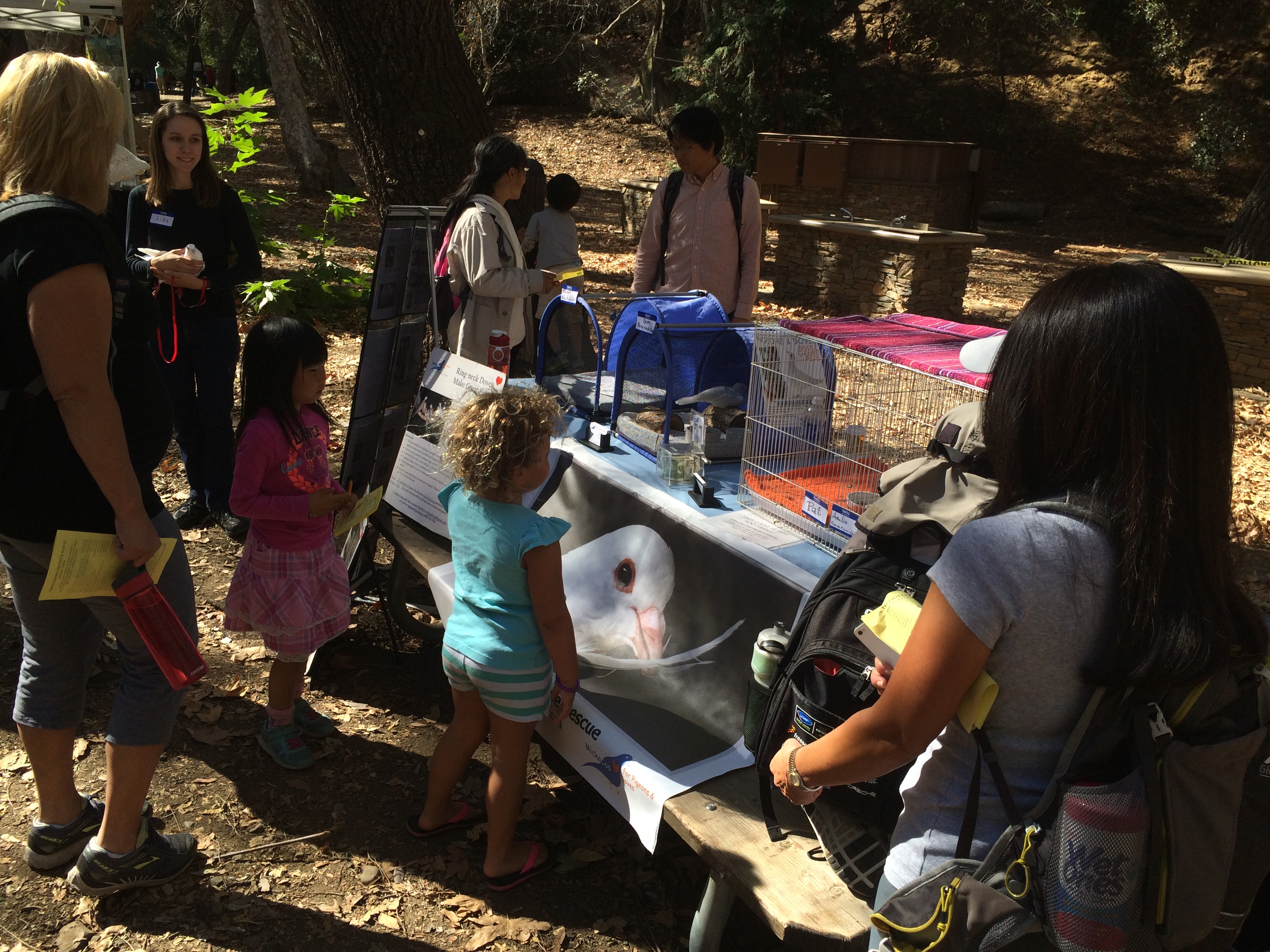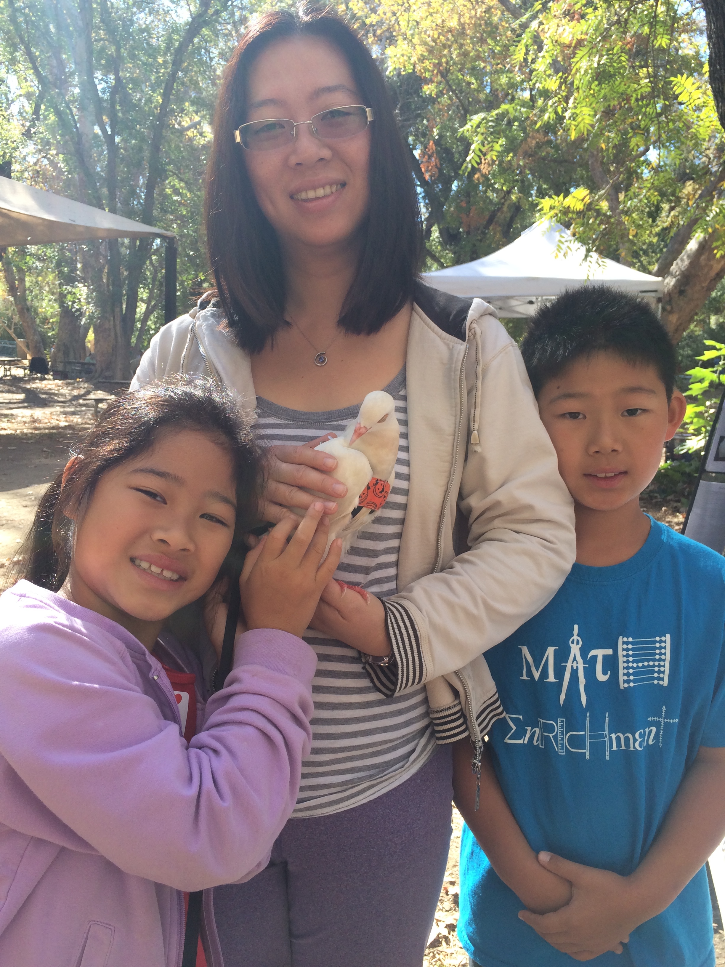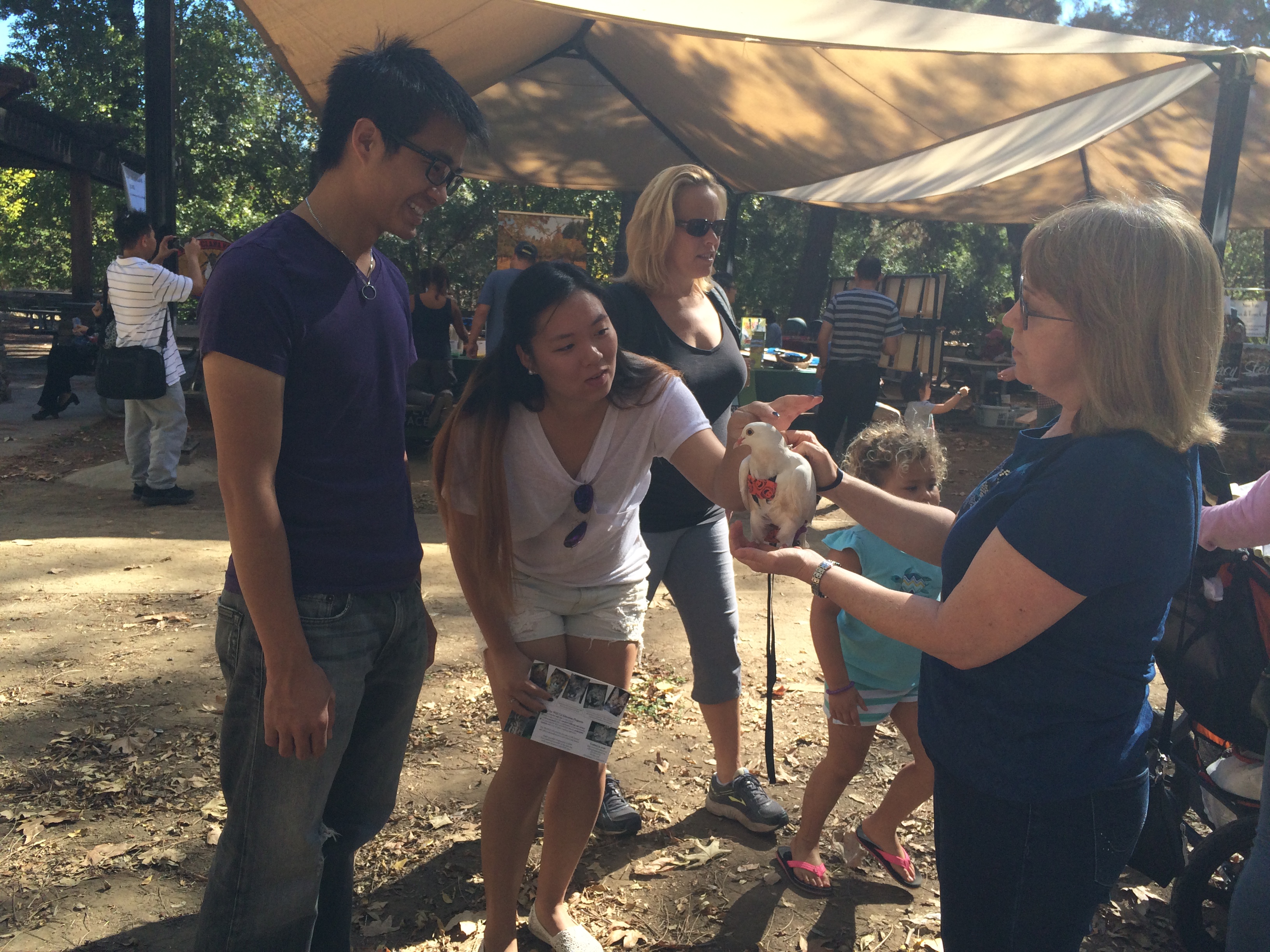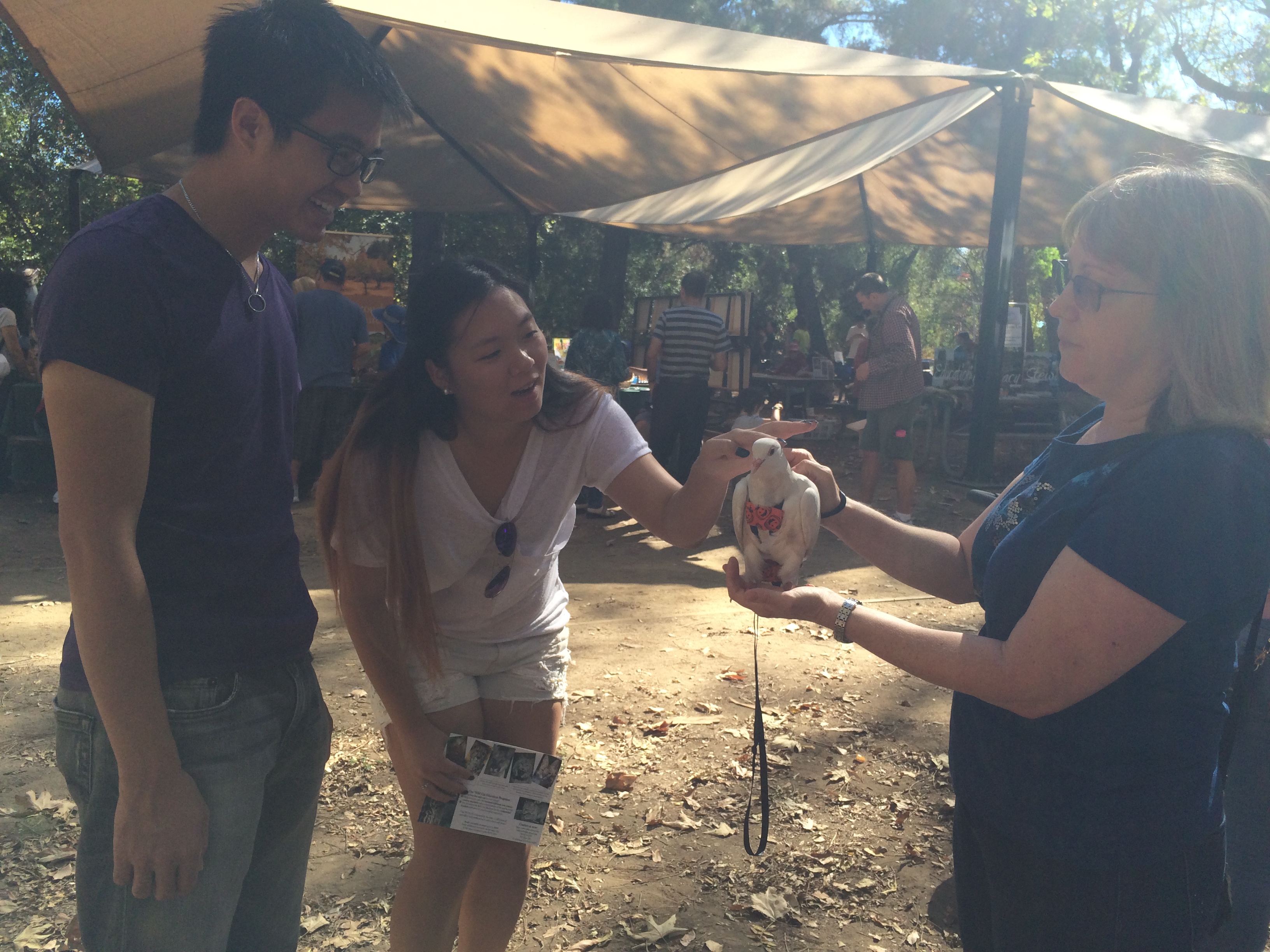 I thought, What a pretty bird. I had never seen a pink bird. My husband and I were both out taking pictures and we could get fairly close and it didn’t fly away… I was really fascinated by this pretty bird and wondered why it was staying in our yard. We wondered, Did it belong to someone in the neighborhood? I started sending out its picture, asking neighbors and strangers if they knew what type of bird this was. Everyone was amazed at its pink color. Over the next week, I noticed it would leave around noon and I felt kind of sad not knowing if it would come back or not but, sure enough round 5 PM, I would go out and there it was back in our yard. One night it slept on a branch of our Oleander tree. I told my husband that I felt sorry for the bird and that we should bring it inside. My husband laughed at me and told me we were not bringing the bird inside as we have three cats… I started really wondering about this bird and what we could do to keep it safe. (We had noticed a cat snooping around our back yard that didn’t belong to us, our cats are all indoor cats.) Luckily, while searching on line for information about doves and pigeons, as we weren’t sure which this was, I came across your website MickaCoo Pigeon & Dove Rescue. I emailed you the picture and asked about the bird, not knowing if I would hear back or not. Almost immediately I received a response from you, Elizabeth, telling me this was a domestic pigeon that someone had dyed pink, possibly to be released during a wedding, and that we needed to catch this bird ASAP or, lacking survival skills, it would most likely be killed. I rushed home from work that day and told my husband that we needed to catch the bird. He told me, We are not catching the bird. I showed him your email and told him I was going to catch the bird. So out into the back yard I go to see where the bird was and there it was on our brick fence separating us from our neighbor’s back yard. I tried luring her down with some bird feed I had picked up from the grocery store but no, she was not coming down from the fence. So I tried sneaking up on it and it looked up at me and flew into our neighbor’s yard. As I was waiting for it to come back, I received an email from you asking if we had caught the bird yet and I responded not yet but I was trying. I climbed up one of our Oleander trees to peek into the neighbor’s yard to see if it was there and sure enough she was there eating off a bench in the neighbor’s backyard. This made me wonder if it was their bird so I went next door (we didn’t know these neighbors very well) and asked if it was their bird. Kelly, our neighbor, responded No but they had noticed it was hanging around for a couple of weeks so they had bought some bird feed for it. That’s when I realized where it was probably going every afternoon, over to those nice neighbors that had put bird feed out in their back yard. After talking with Kelly, who I got to know so much better than I had before, Rick, my husband called me wondering where I was as it was after dark now and I hadn’t told him I was going next door.