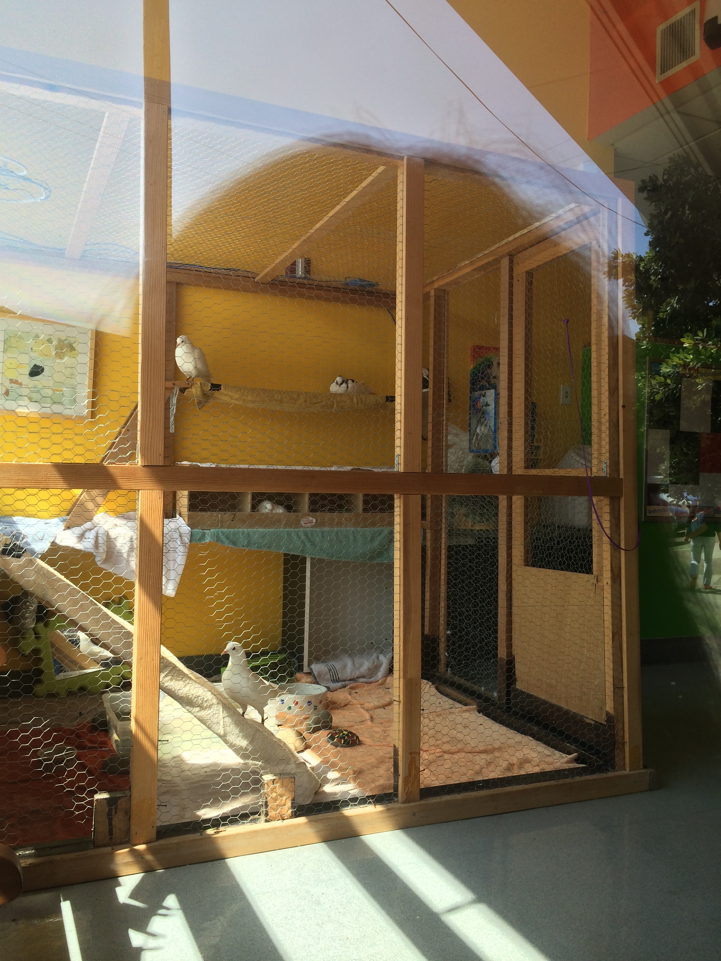 So now, here we are, five months plus after initially rescuing Homie, then rescuing Homie from my ignorance (hawk-attack) and I am happy to say a lot has happened. Homie is about 95% ‘normal’ at this point. He can walk, eat and fly quite well, although when he gets tired, he does stumble a wee bit, and he doesn’t always hit the seed he was aiming for, but he is a healthy, happy bird. We have finished his forever home- a big, beautiful and quite safe aviary in the backyard, about 4’x8’x6’. One funny thing, we took Homie to meet Jill, one of MickaCoo’s volunteers, to have her check out Homie and for me to learn more about pigeons. Jill gave me the Pigeon Birth Control talk, although I just knew Homie was a he (based on everything I had read online!) but Jill thought maybe just maybe, Homie was a she. Well, that night, I put the two wood eggs in his nest and woke the next morning to a surprising three eggs! So there went my assuredness that Homie was a he, as my dear, sweet Homie definitively is a she!