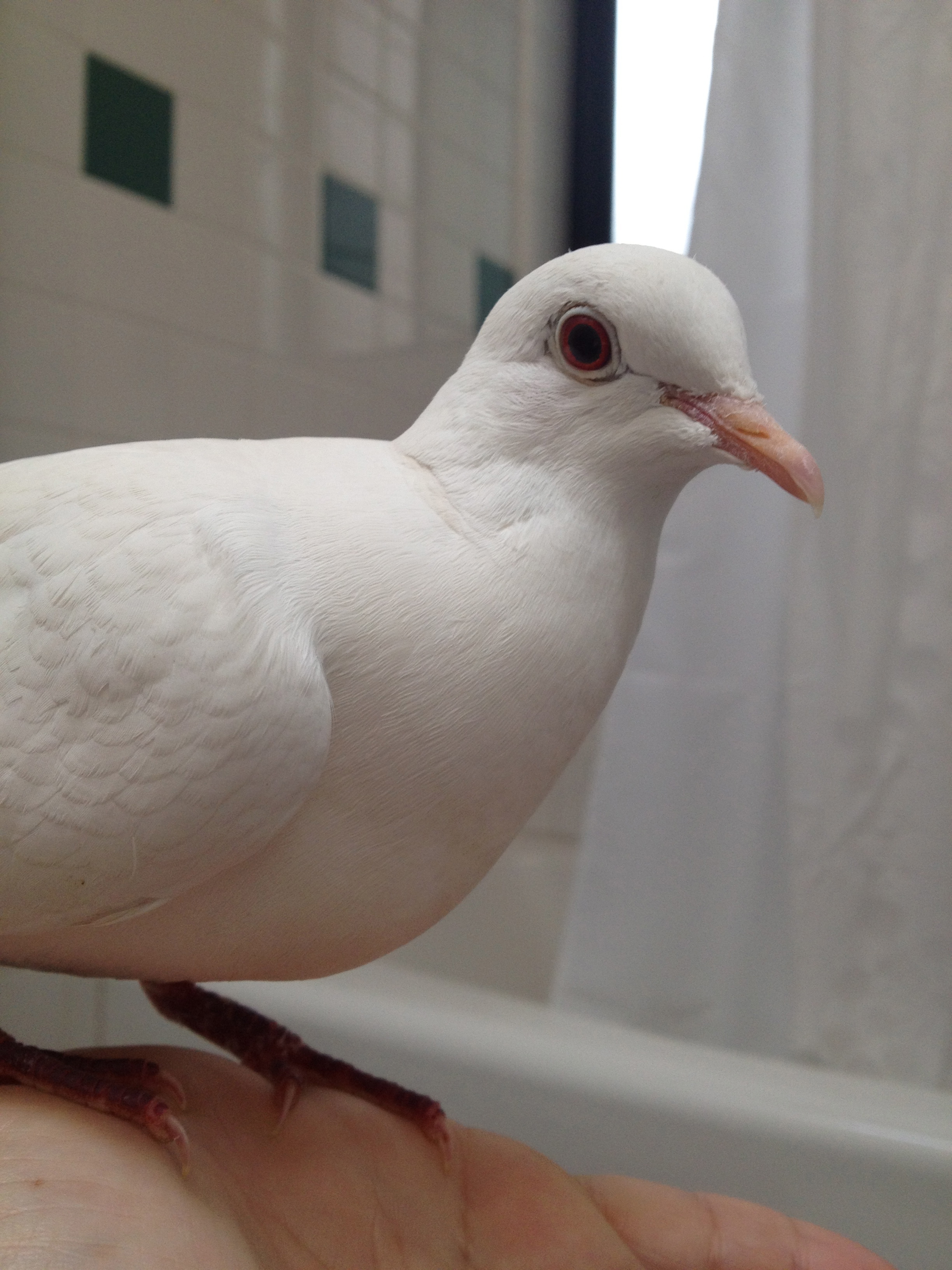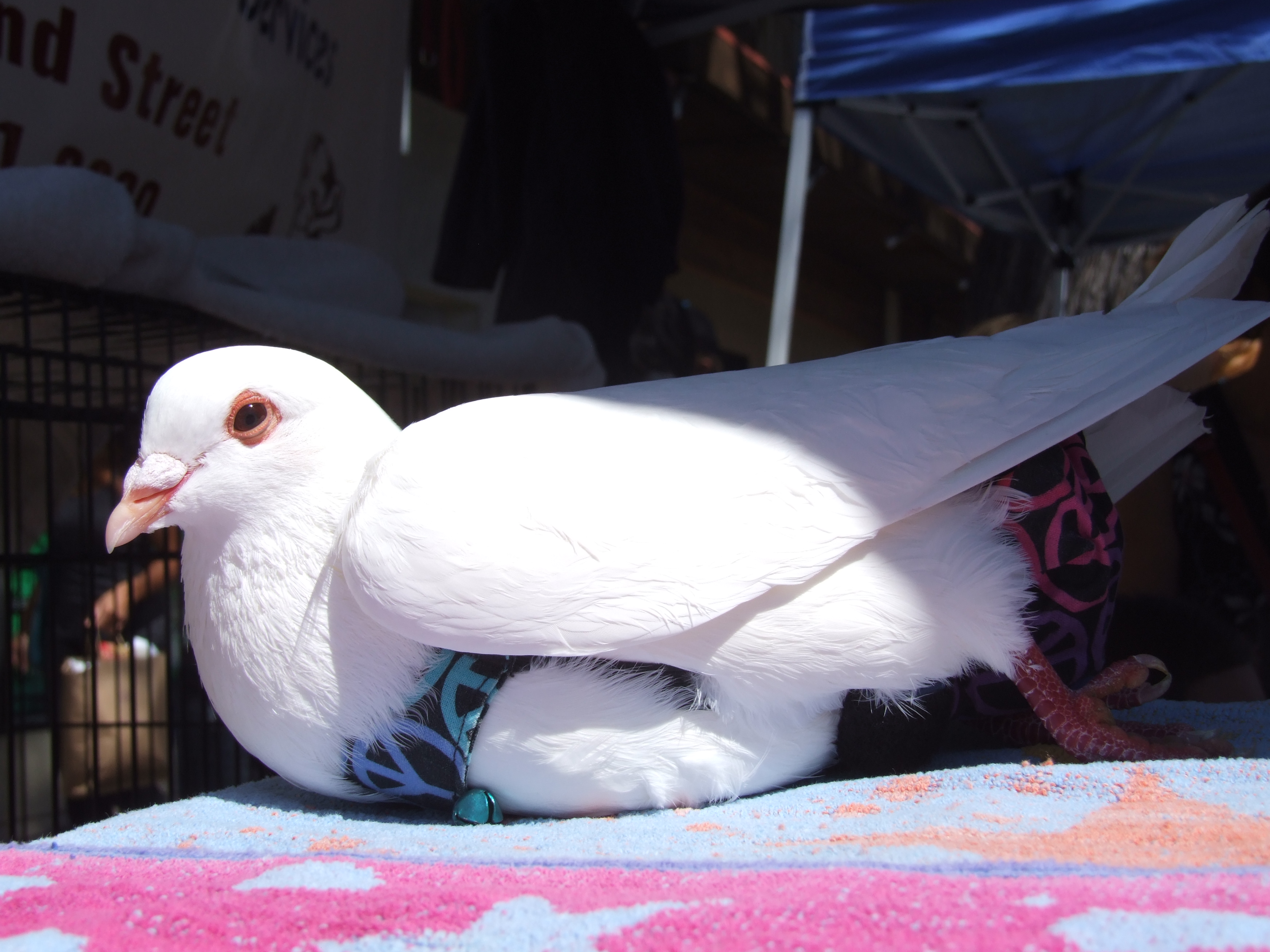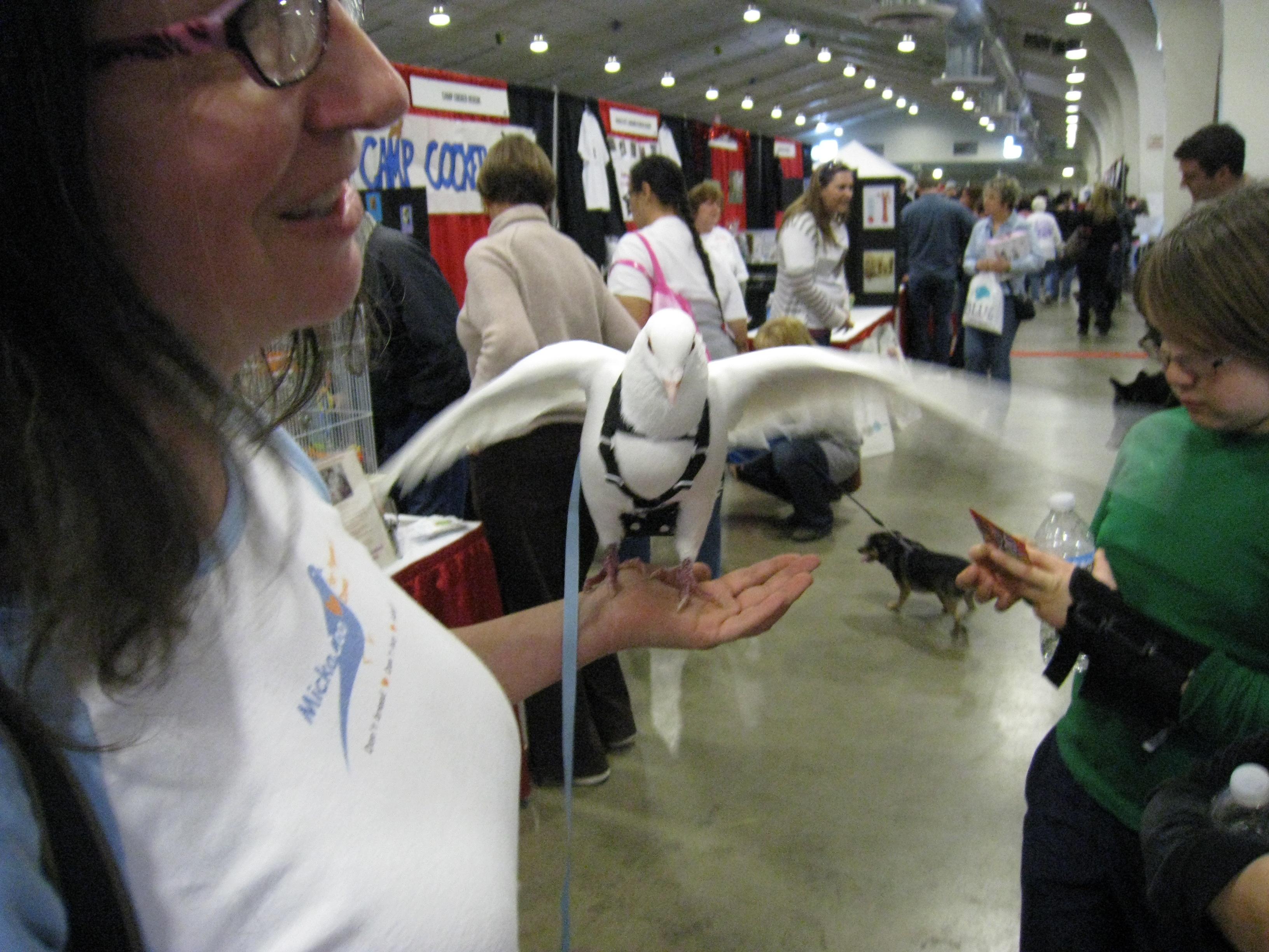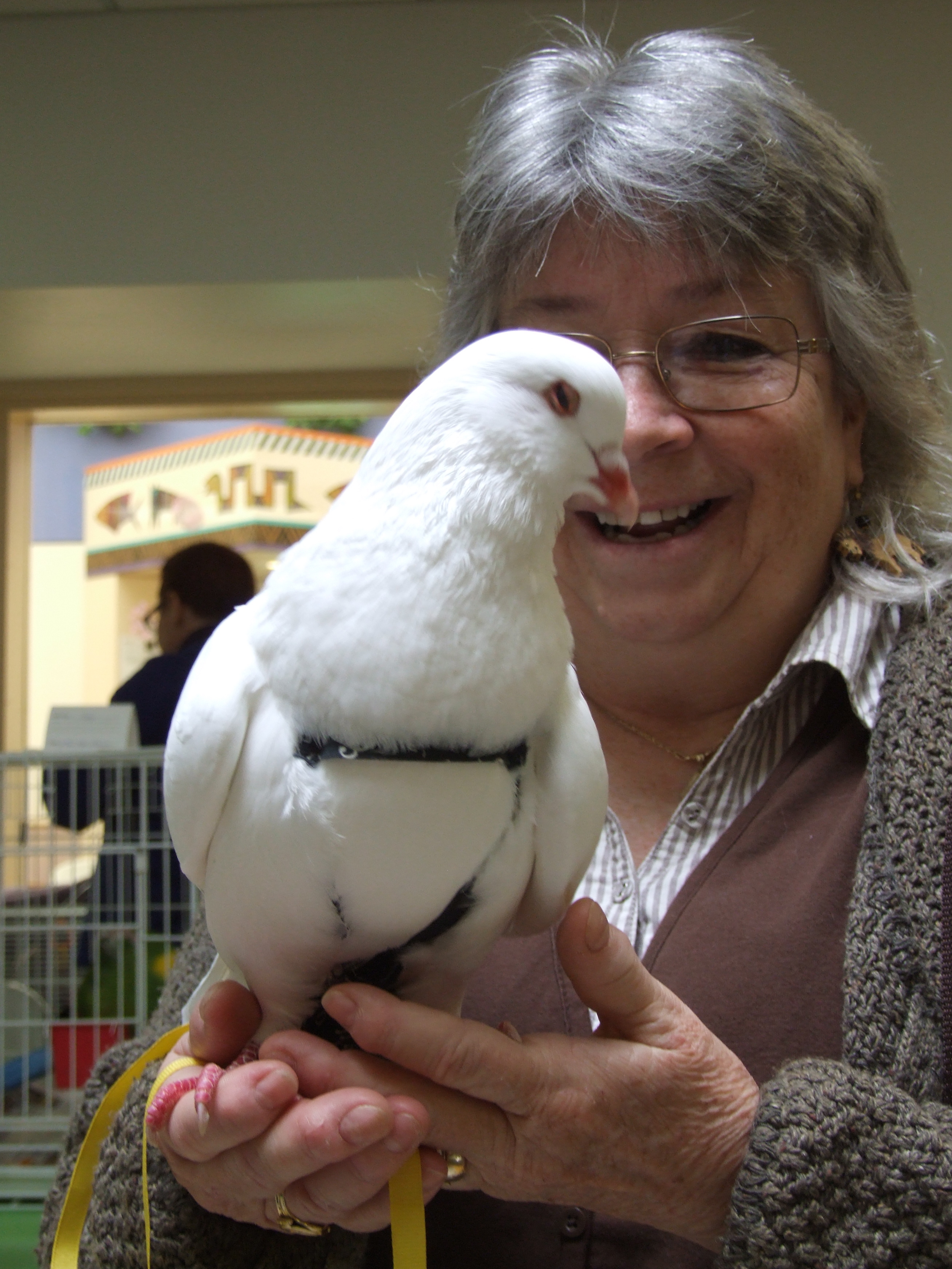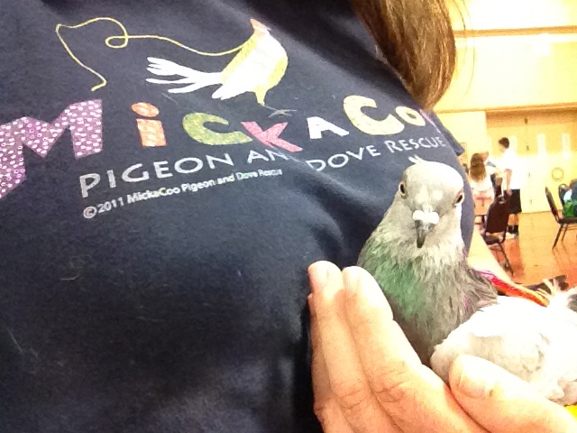 And now I am passionate about MickaCoo and serving the pigeons and doves. I have taken an active role in fundraising, specifically taking charge of auctions and sales, and am currently working on grant proposals. I am, also, interested in organizing the volunteers to better enable MickaCoo to grow and prosper. I have been adopted by 1 homing pigeon, Little Cloud, who is the love of my life. He and I go to schools and events to draw attention to and teach about the plight of domestic pigeons and doves. I provide transportation to the vet, foster birds on a temporary basis, do home visits, attend several events, and whatever is needed. I am currently owned by 2 dogs, 1 cat, and 1 pigeon.