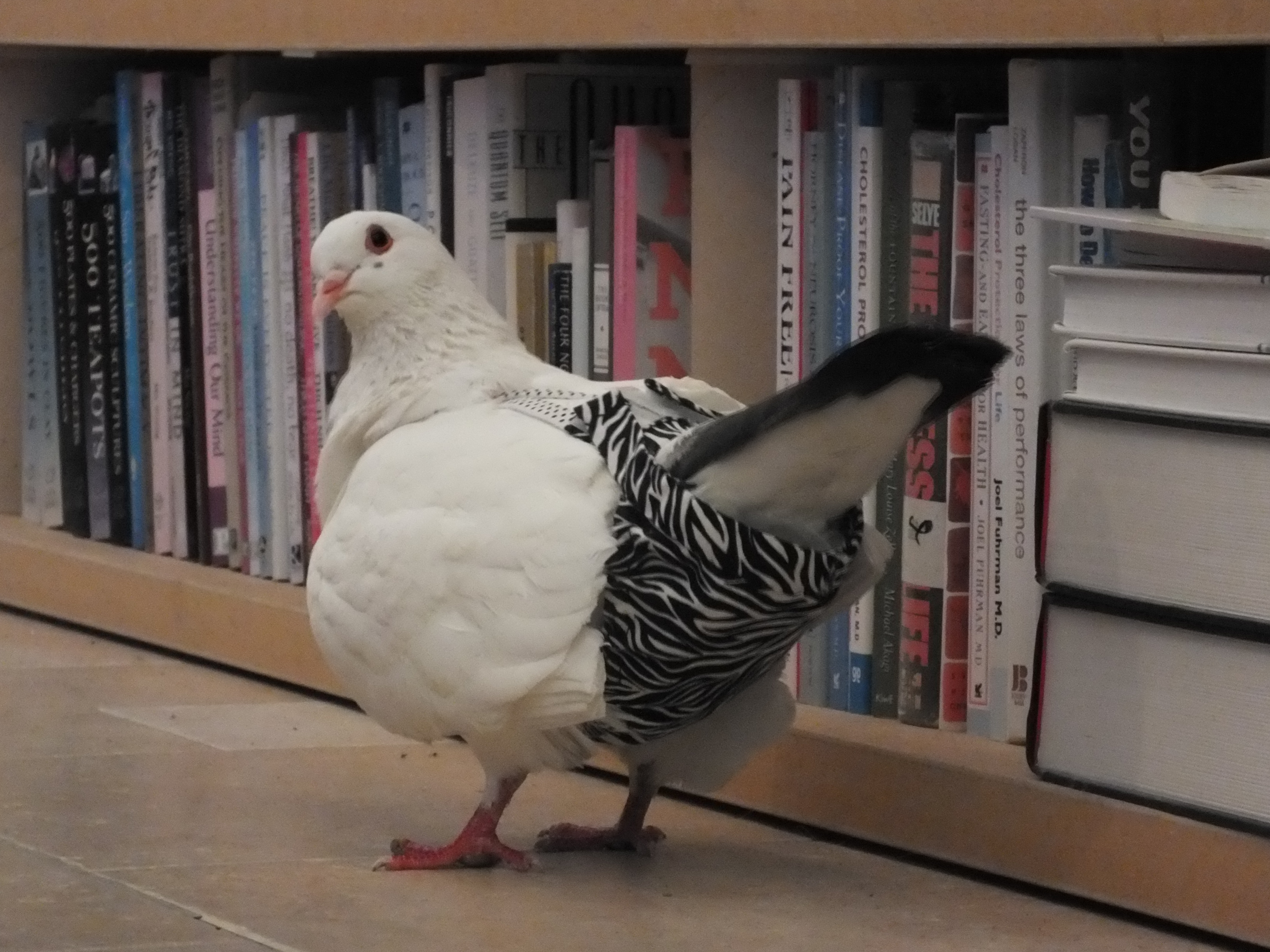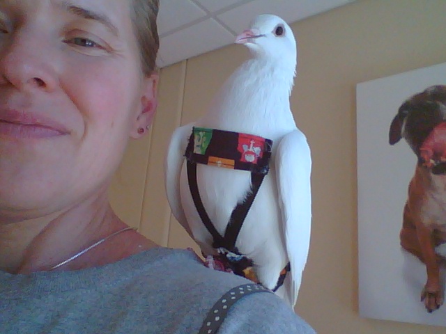 There is a lot of misinformation about pigeons and disease. They actually pose almost no risk to humans and you’re more likely to contract a zoonotic disease from dogs or cats than you are from pigeons. Pigeon poop is easy to clean up and apple cider vinegar works great. If you want to have your pigeon out and about in the house without pooping on stuff, you can put pigeon pants on them. (They’d rather go naked but they adjust really quickly. Pigeons are extremely adaptable and very good sports.)
