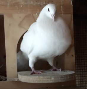 It is a fancy pigeon or a white King pigeon or “dove release” survivor. King pigeons are large domestic pigeons — usually pure white or mostly white — that cannot fly well or fend for themselves in the wild. They face certain death if not rescued. “Dove release” birds (including trained but lost white Homers as well as the DIY-released white Ringneck doves and King pigeons need rescue! (See Why “Dove Releases” Are Cruel)
